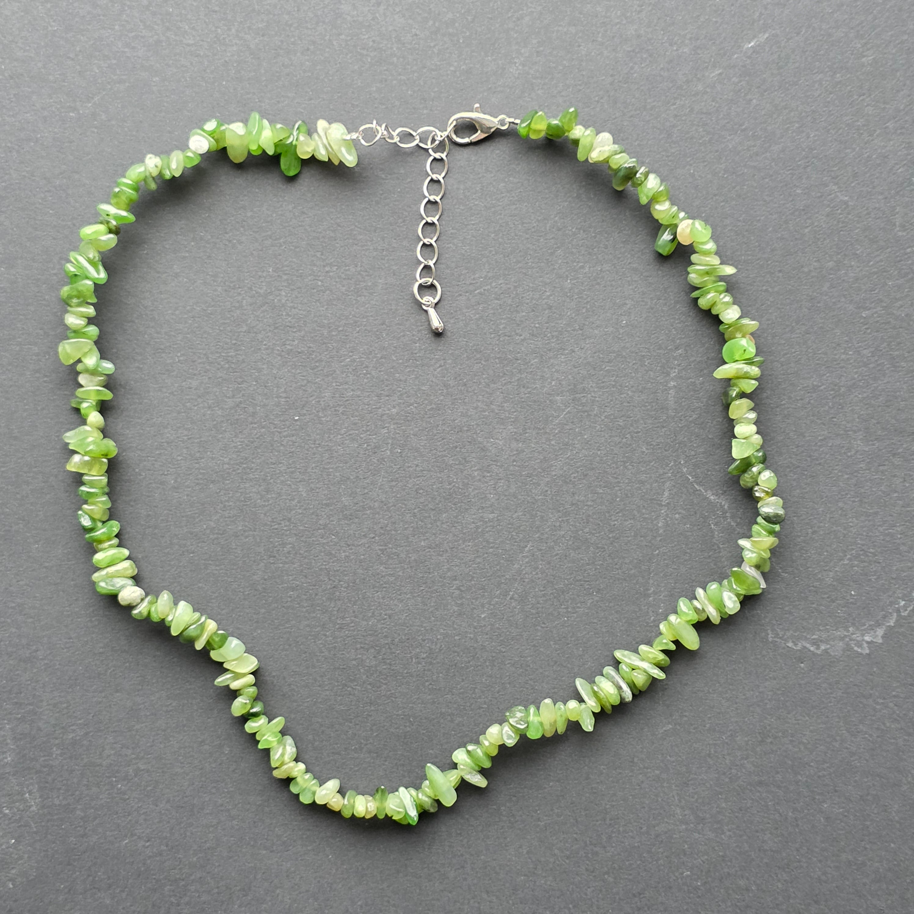 Естествено и свежо колие, изработено от нефрит — един от най-ценените видове нефрит, известен с интензивния си зелен цвят и плътната, органична текстура. Нередовните, внимателно полираните чипове придават автентична, естествена атмосфера, запазвайки суровата красота на камъка.