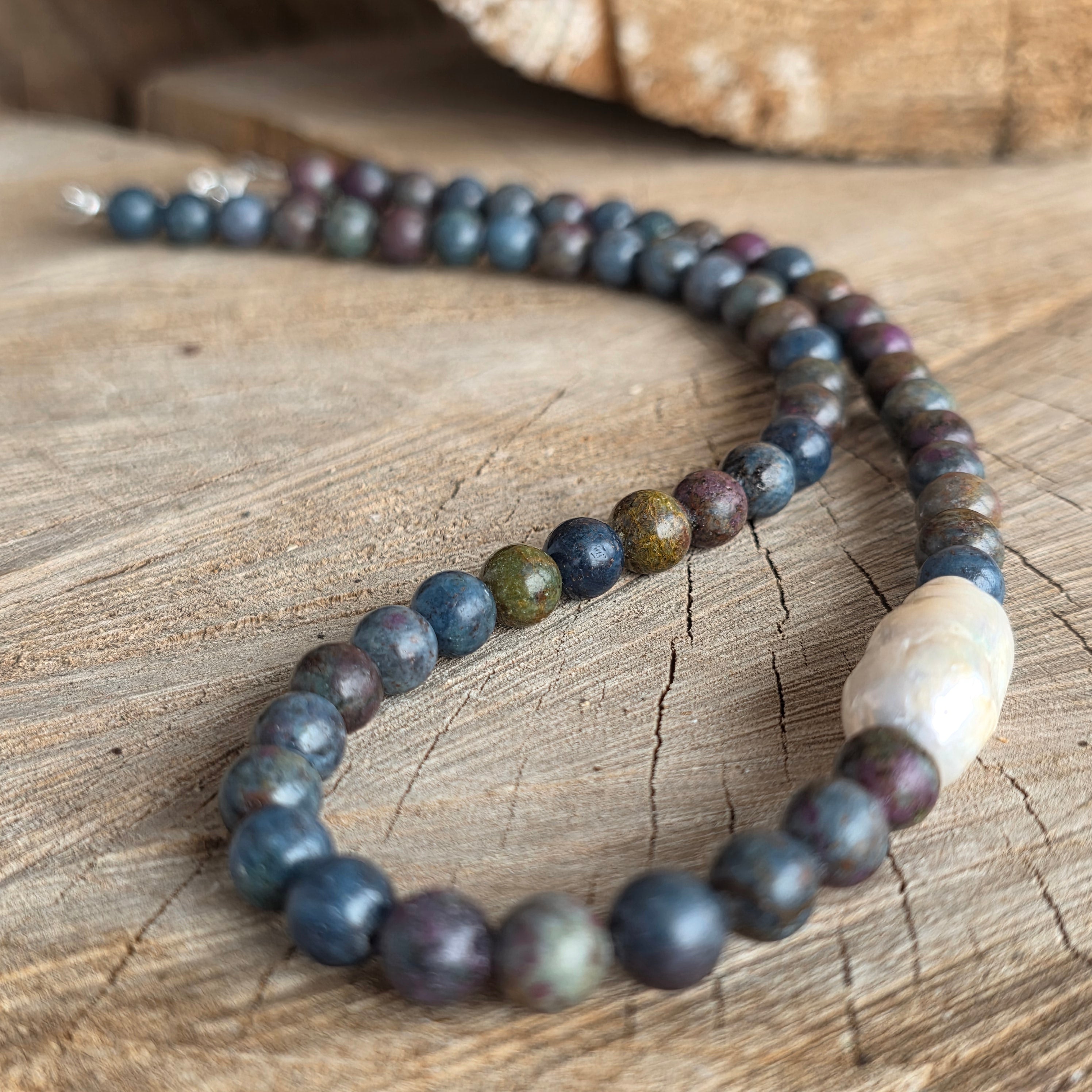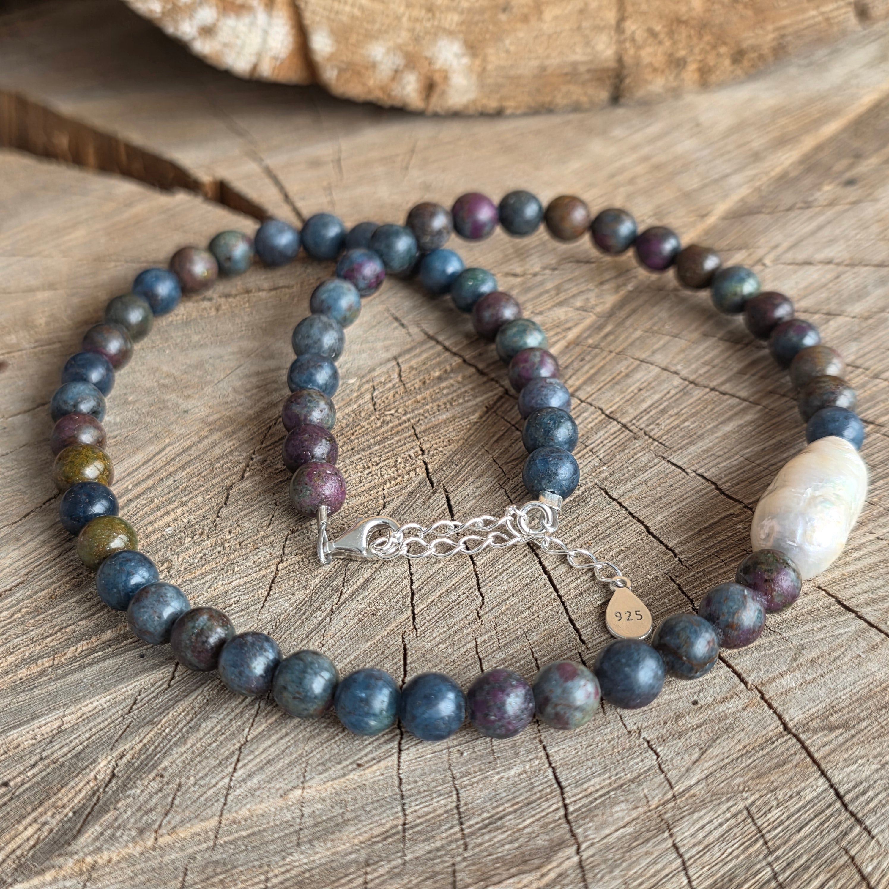 Материали: естествен сапфир и рубин (шлифовани сфери), барокова перла, сребро 925, закопчалка аспирин от сребро