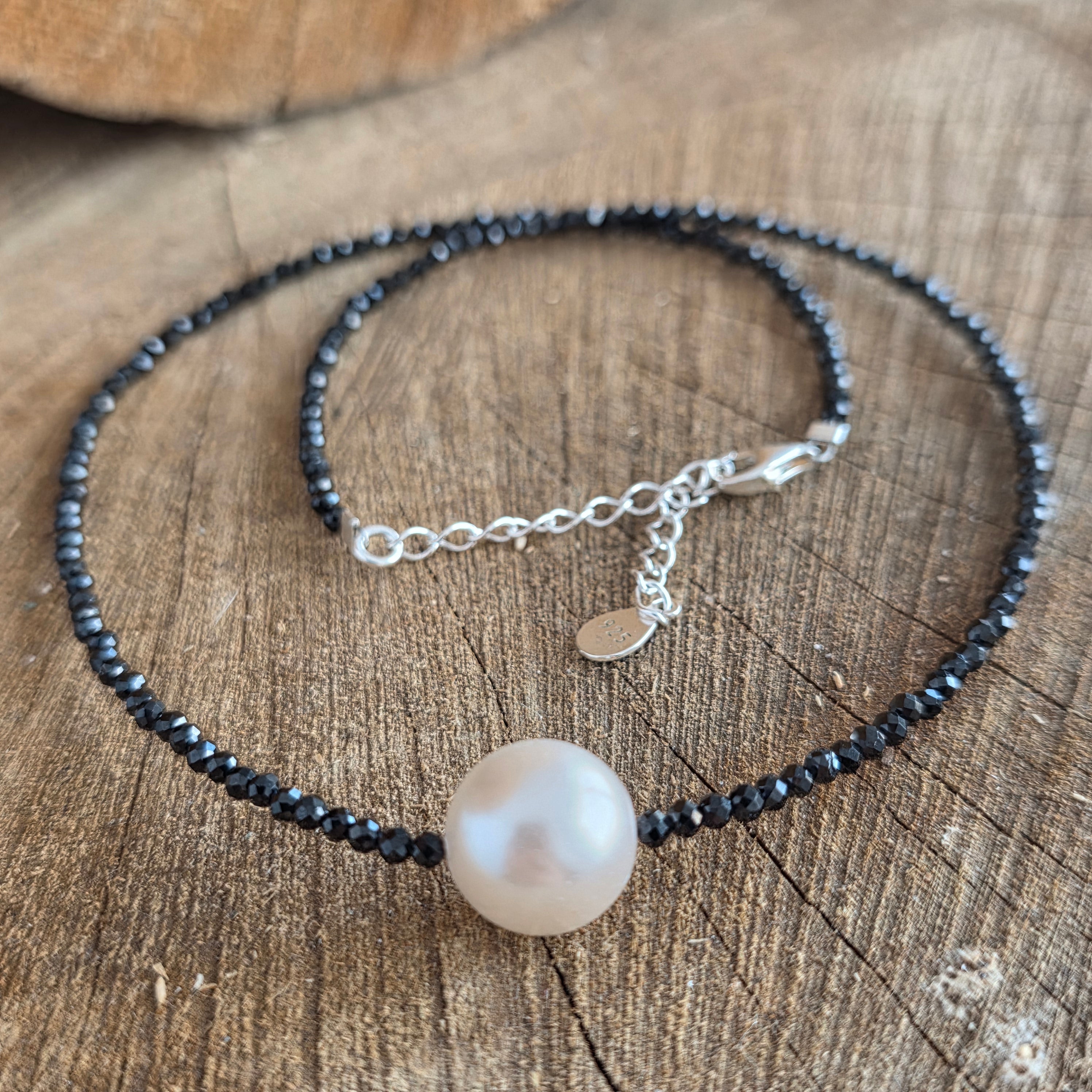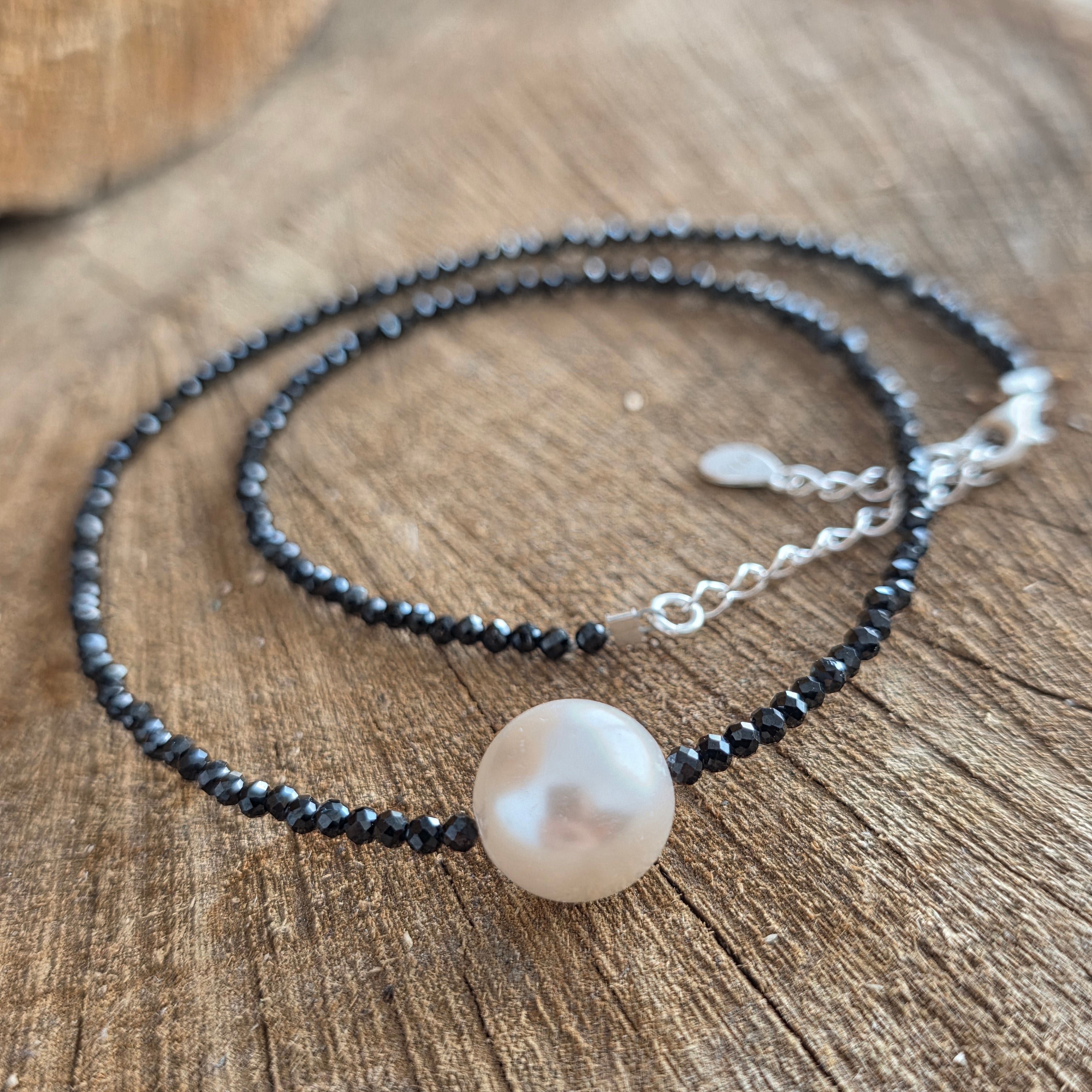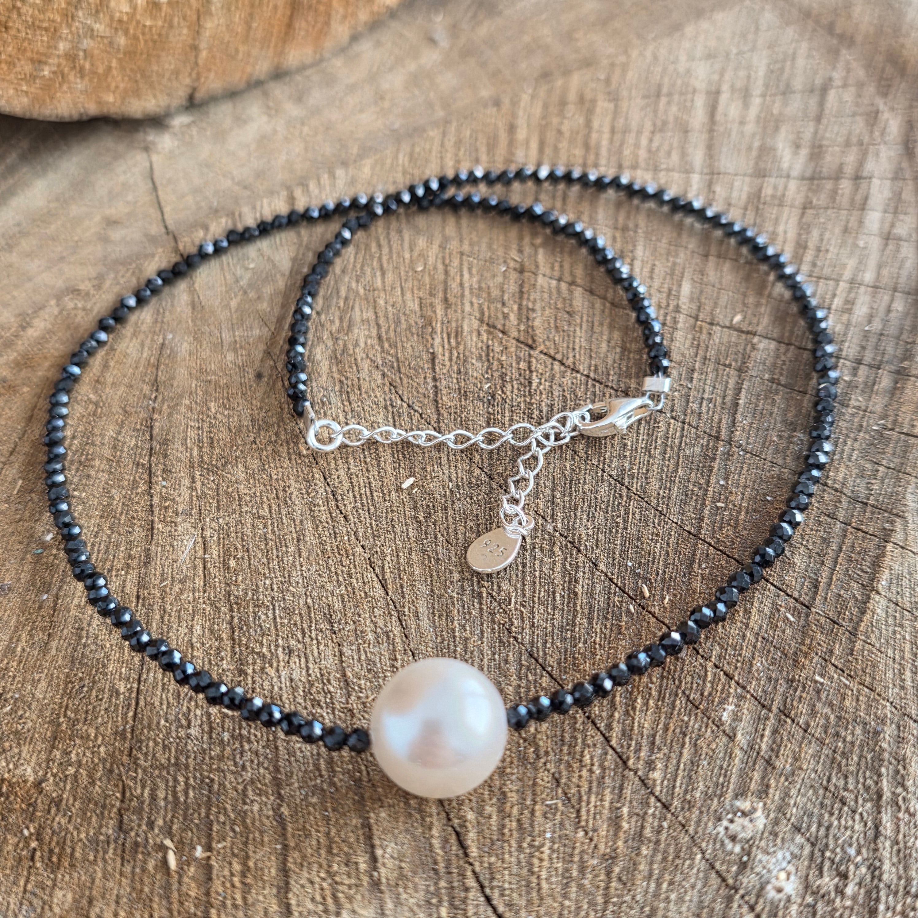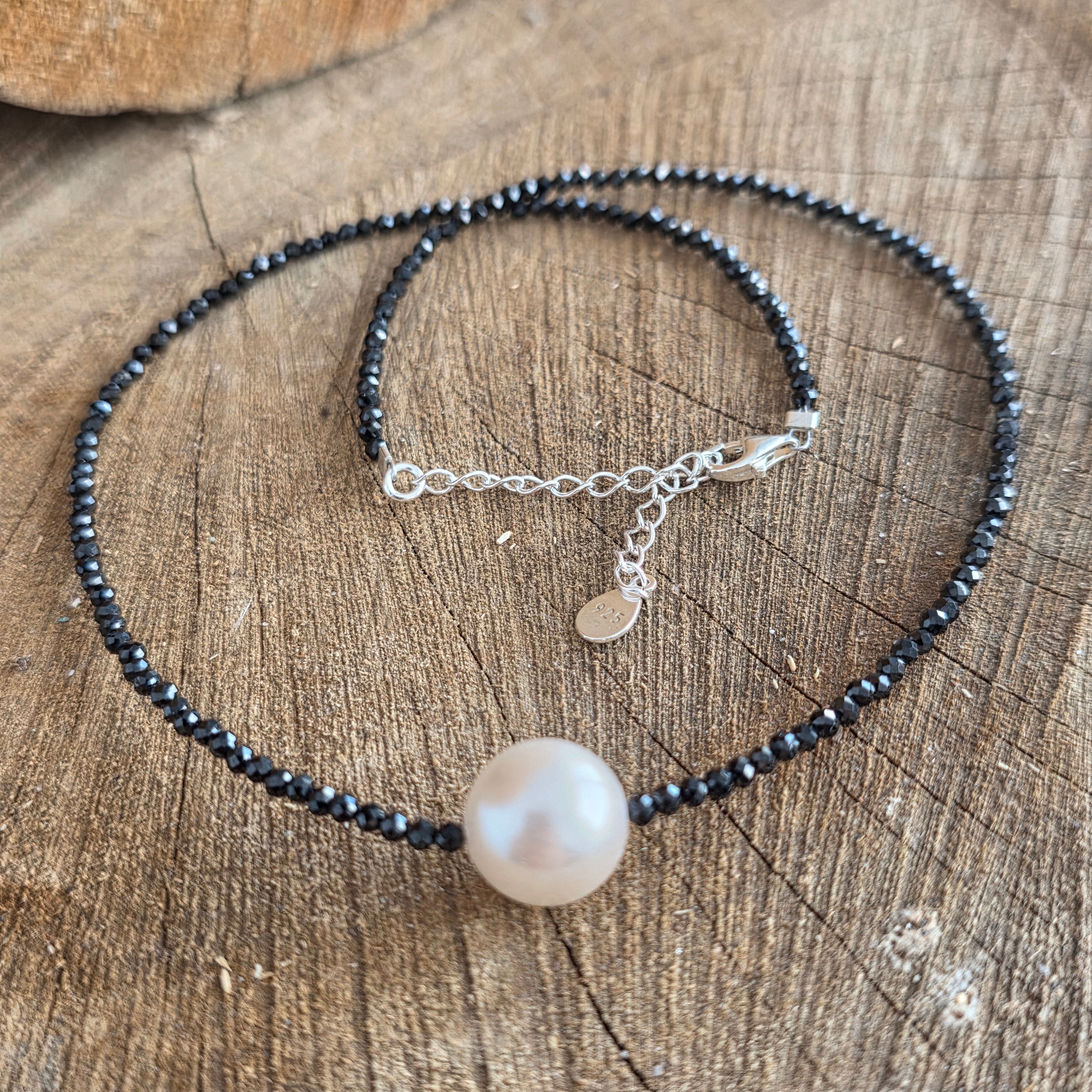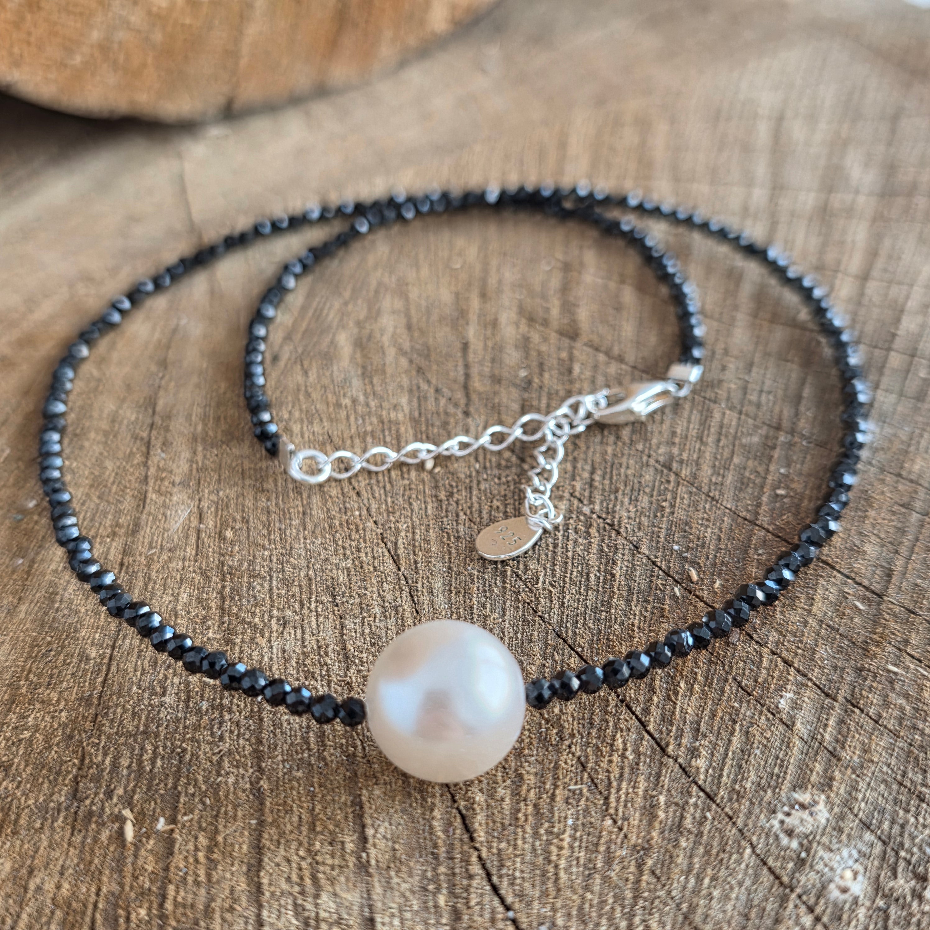 Връвчицата е изцяло съставена от фасетирани сфери от натурален черен спинел 4 мм, камъни с почти метален, изискан блясък, които улавят светлината под точни ъгли, като черни искри в движение. Това е бижу, което говори чрез контраста – между тъмнина и отражение, между сила и нежност.