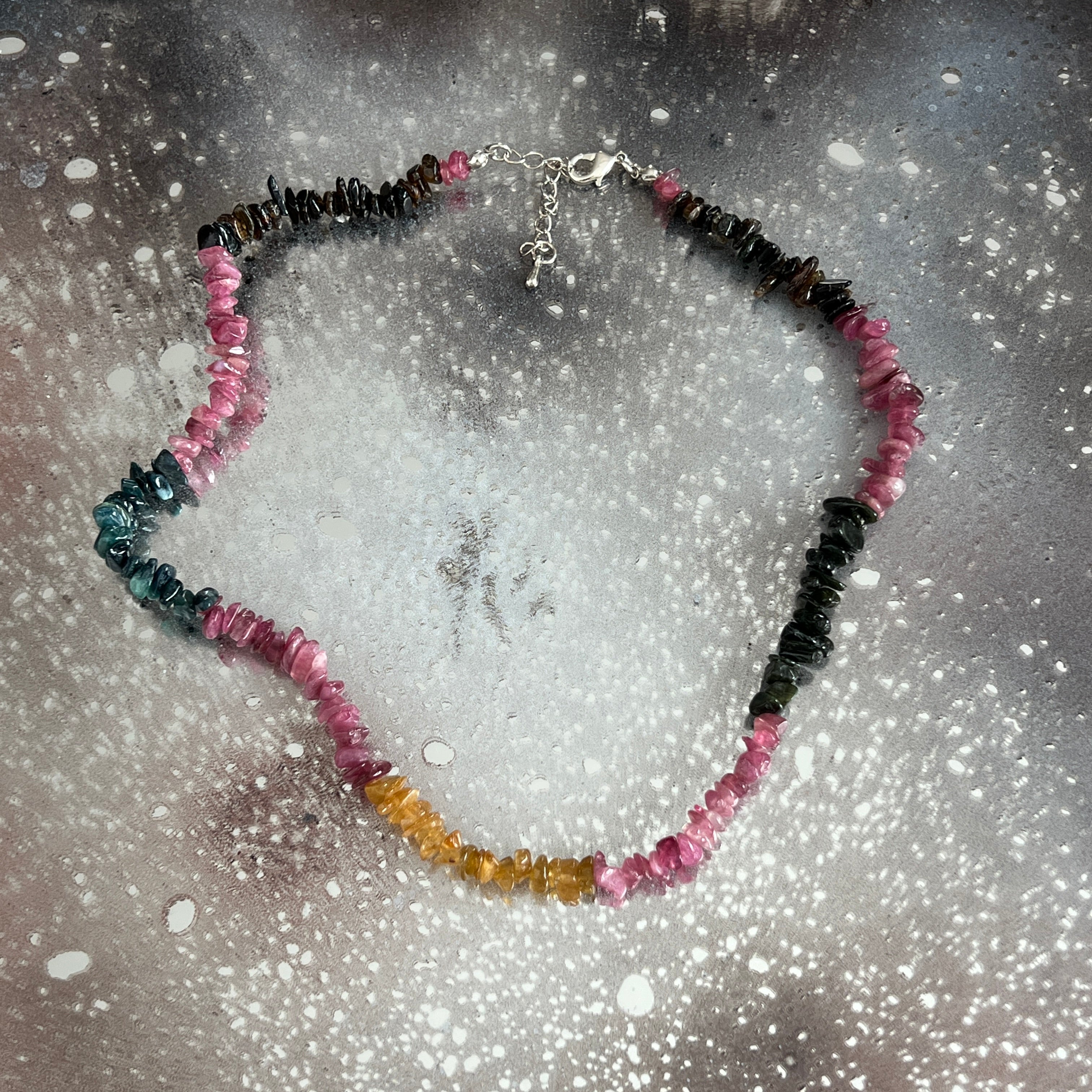 • Камък: натурален микс турмалин – чипс (розов, зелен, жълт), полиран завършек