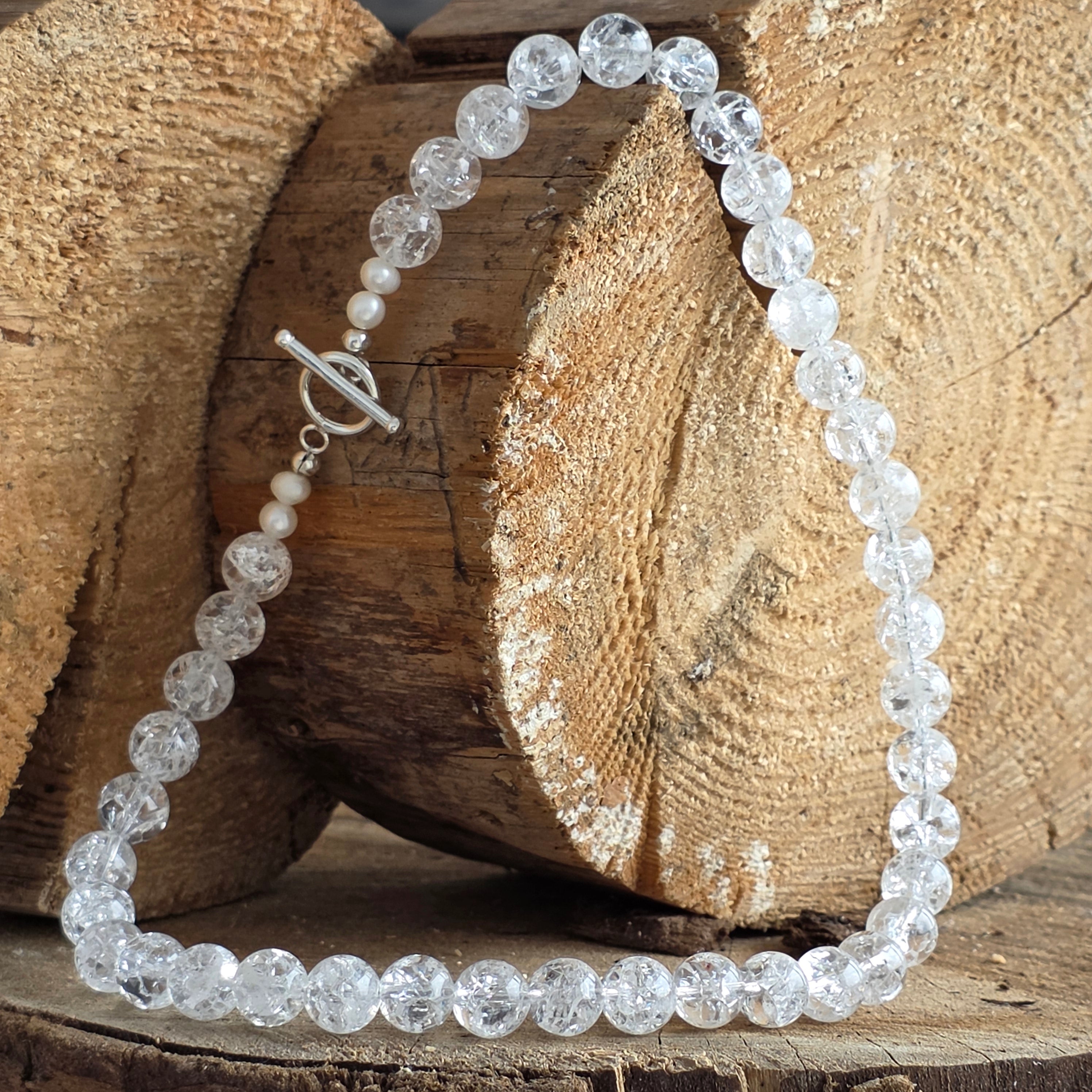 Материали: естествен безцветен кварц „cracked“ (crashed) 10 мм, 4 естествени перли, сребро 925