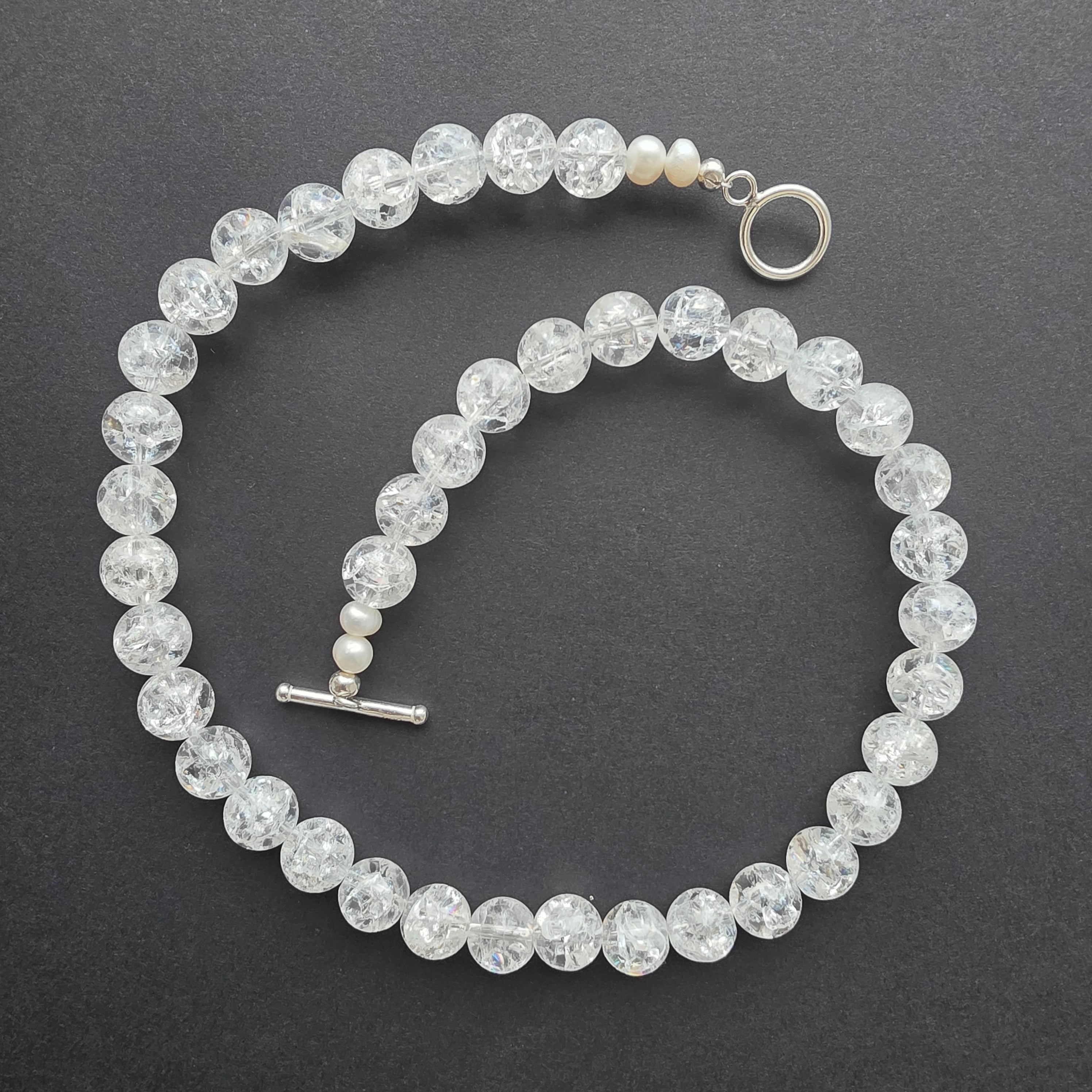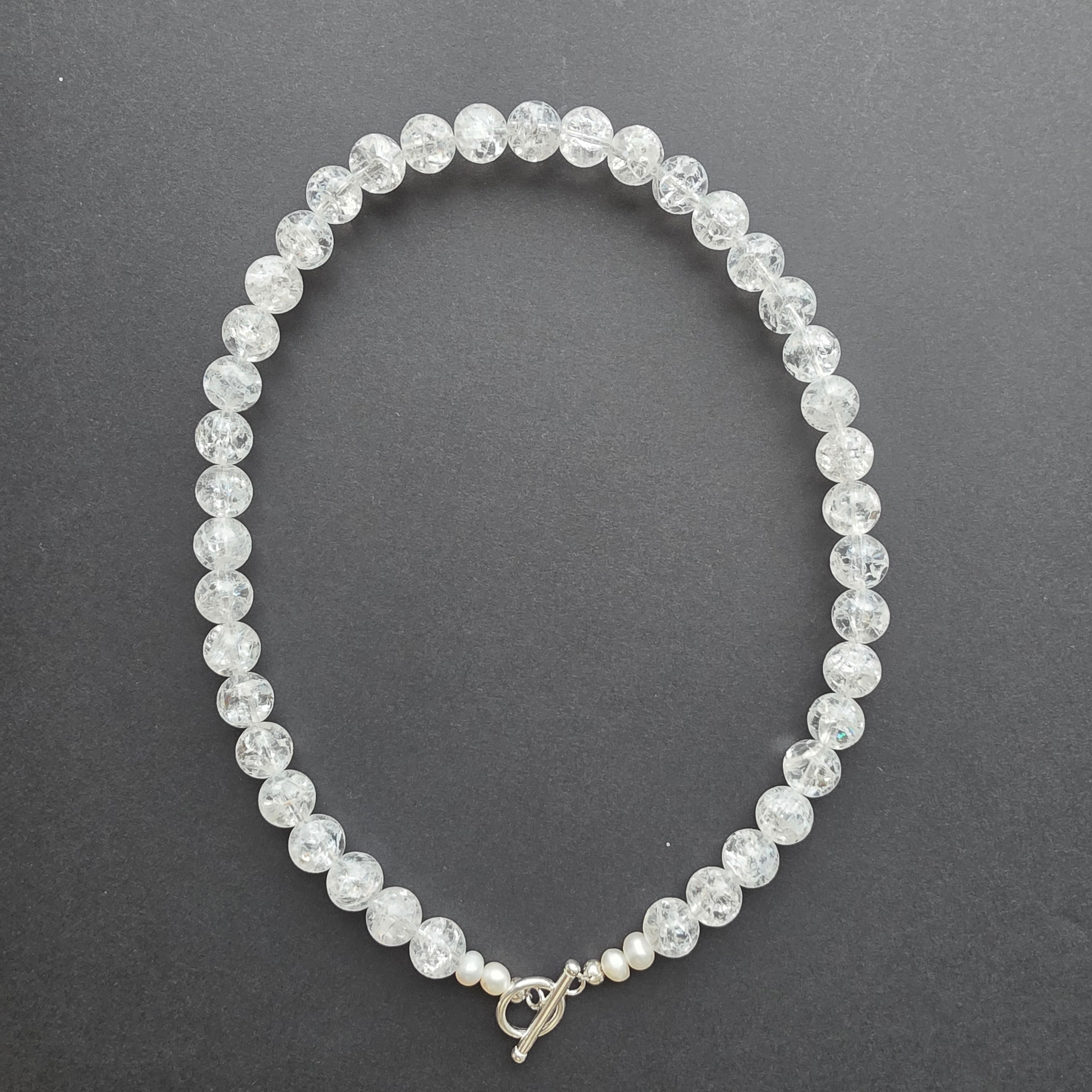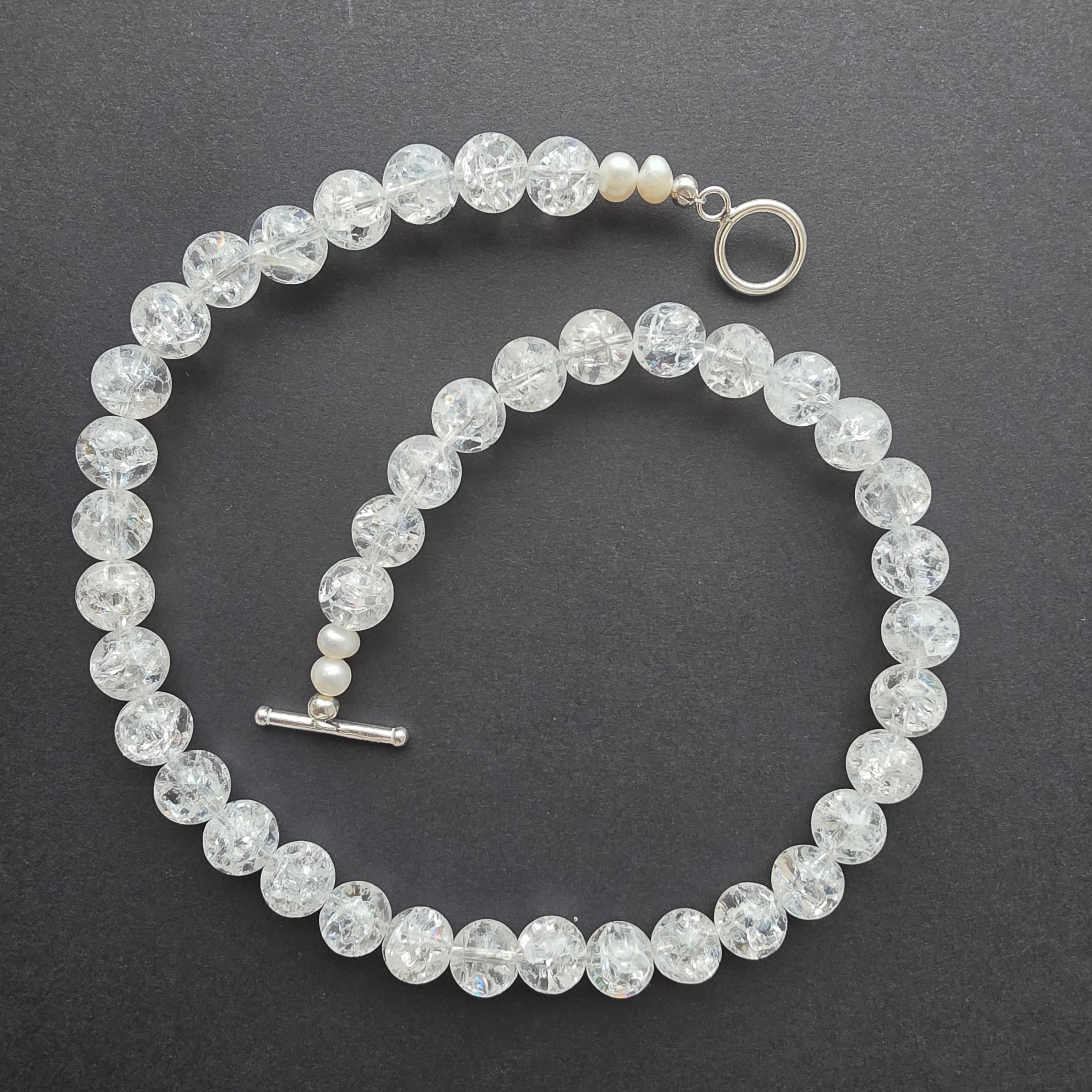 Колие, което съчетава силата на кристала с деликатността на перлата в балансирана композиция между светлина и тишина. Безцветният кварц „crashed“, във фини сфери от 10 мм, носи в себе си игри на светлини и сенки, като лед, който пази спомена за падаща звезда. Уникалната му текстура напомня, че истинската красота често се ражда от несъвършенство и прозрачност.