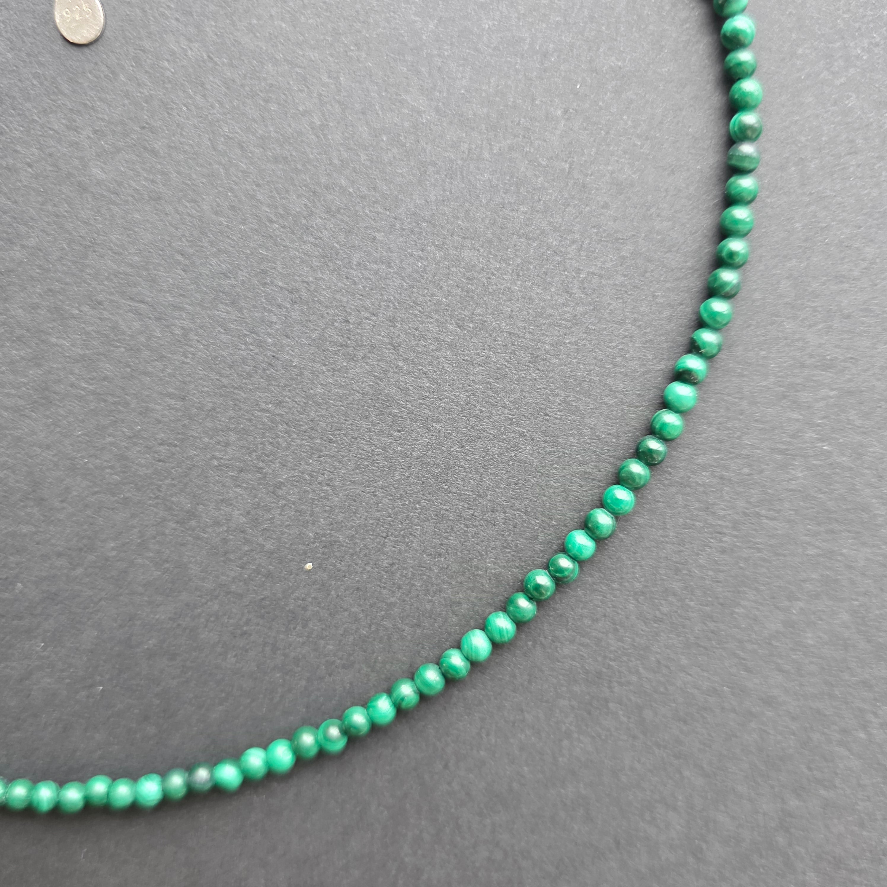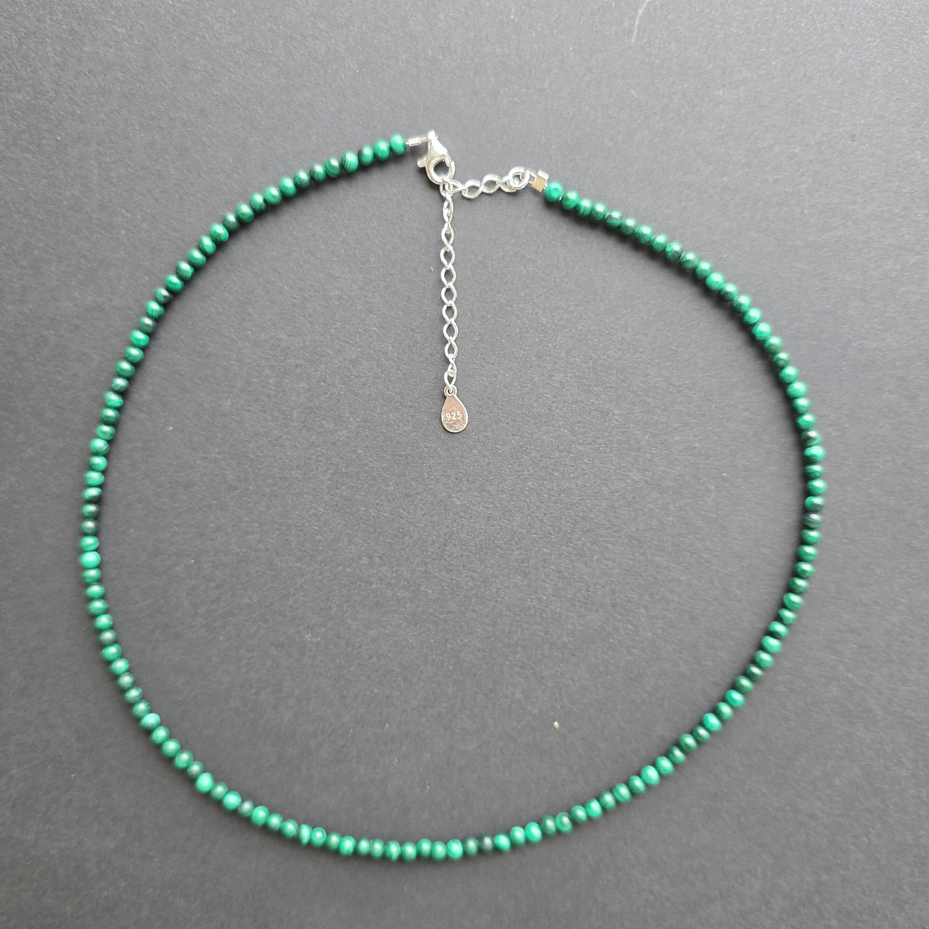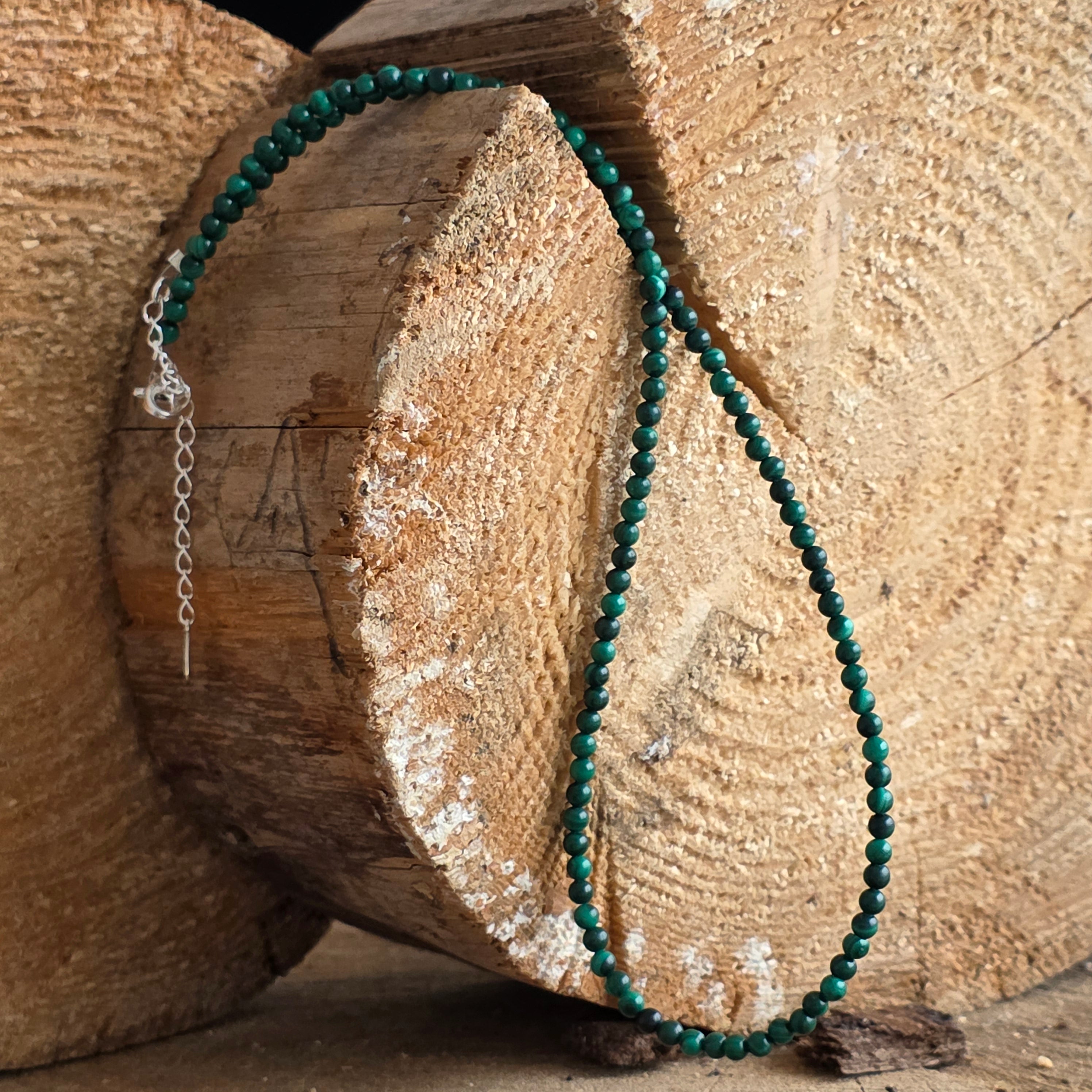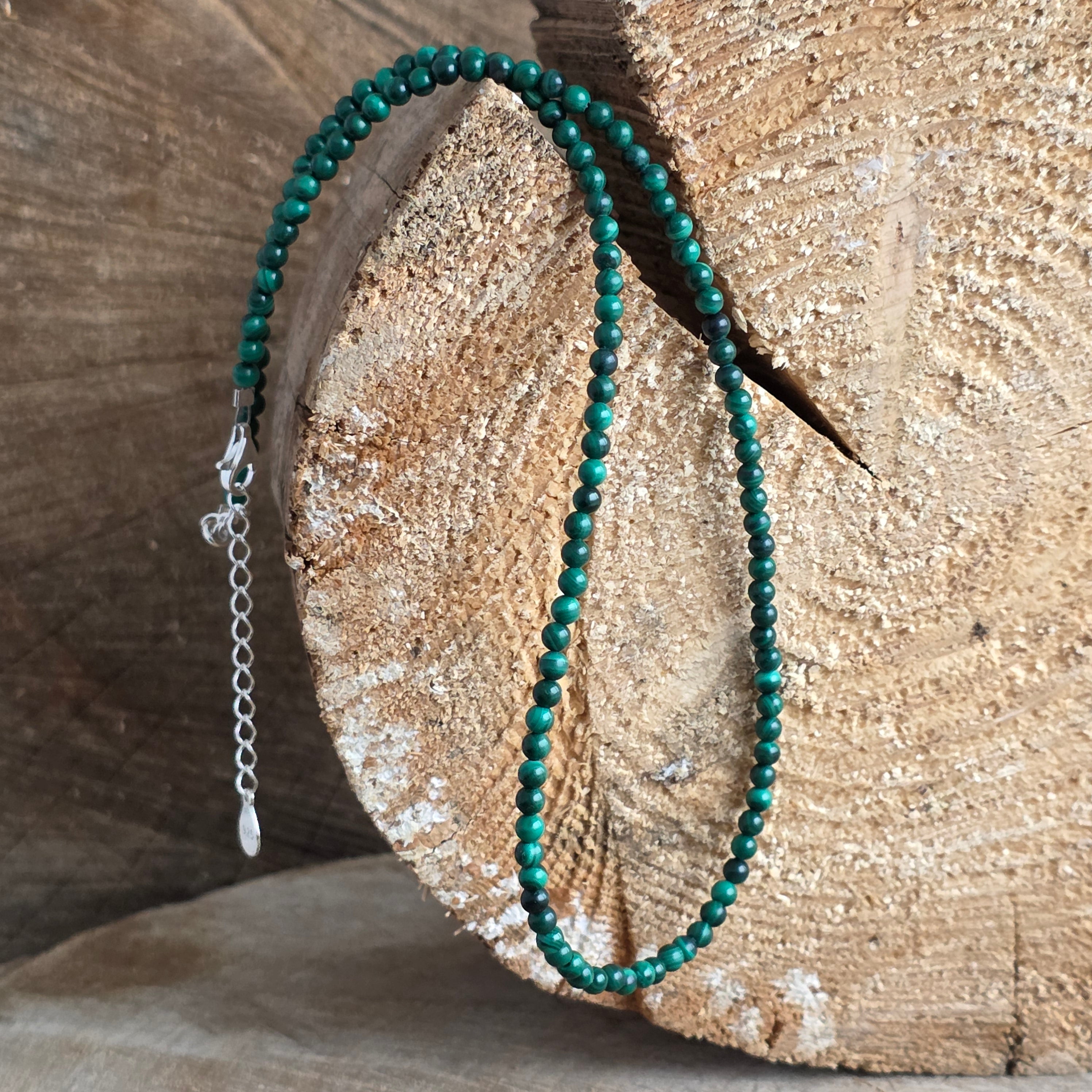 Колие, което носи дълбоката песен на земята, ехо на сила и възстановяване. Малахитът, с нюансите на наситено зелено и плавните ивици, е жив камък — израз на трансформацията, защитата и вътрешното възраждане. Всяко мънисто от 3 мм е свят сам по себе си, танц между смарагдовата светлина и сенката на гората.