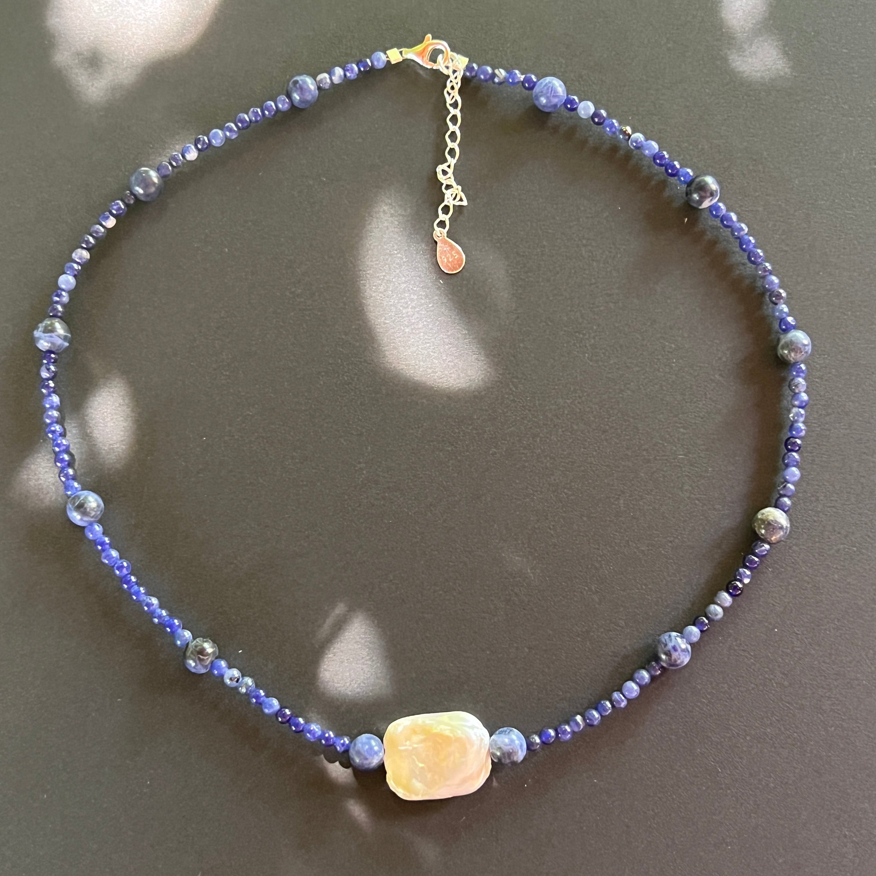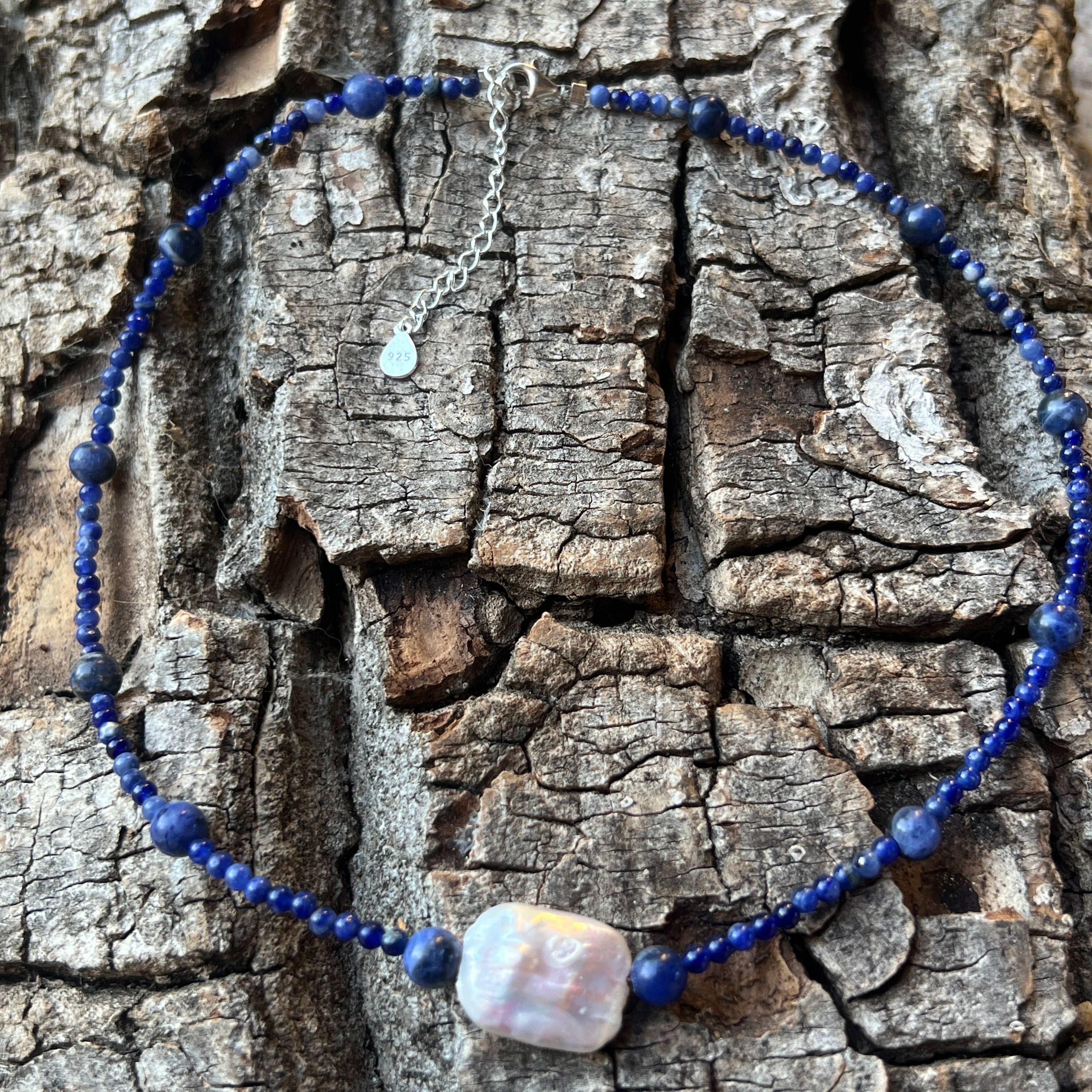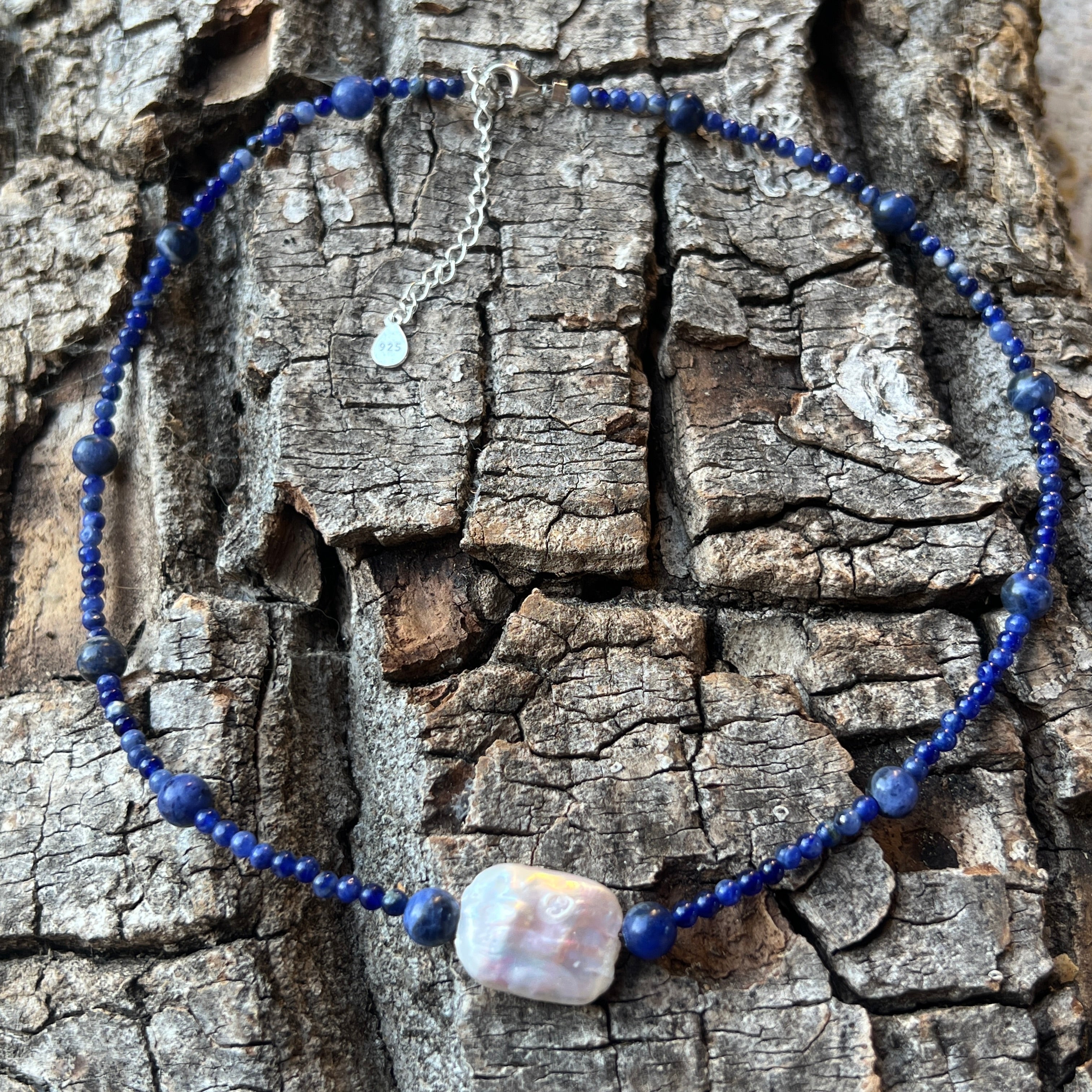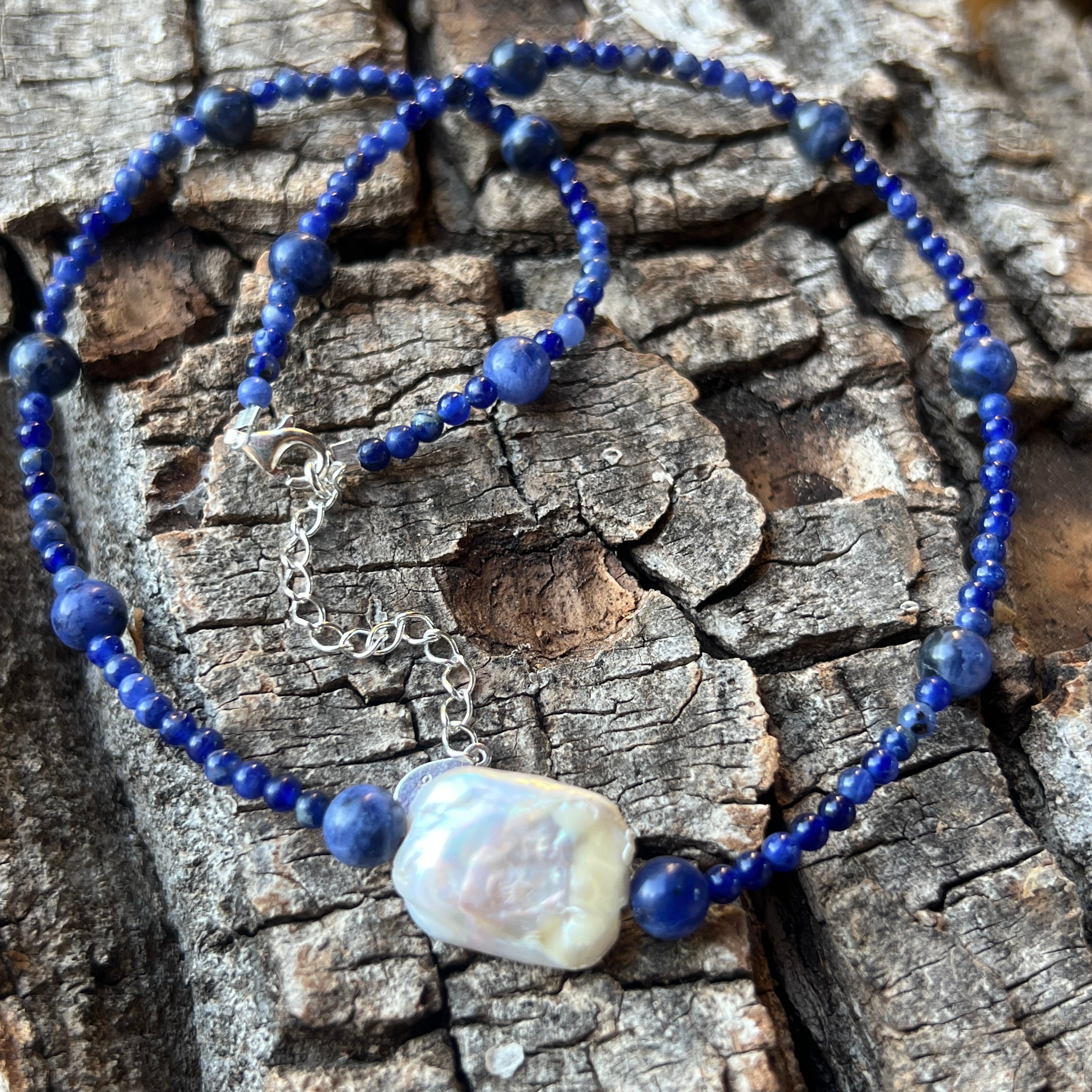 Содалитът е камъкът на искреността и умствената яснота – помага за изразяване на вътрешната истина и за изчистване на мислите. Той има дълбока, но успокояваща енергия, която насърчава размисъл и вътрешна смелост. Перлата, с нейната органична елегантност, носи чистота, женственост и връзка с есенцията.