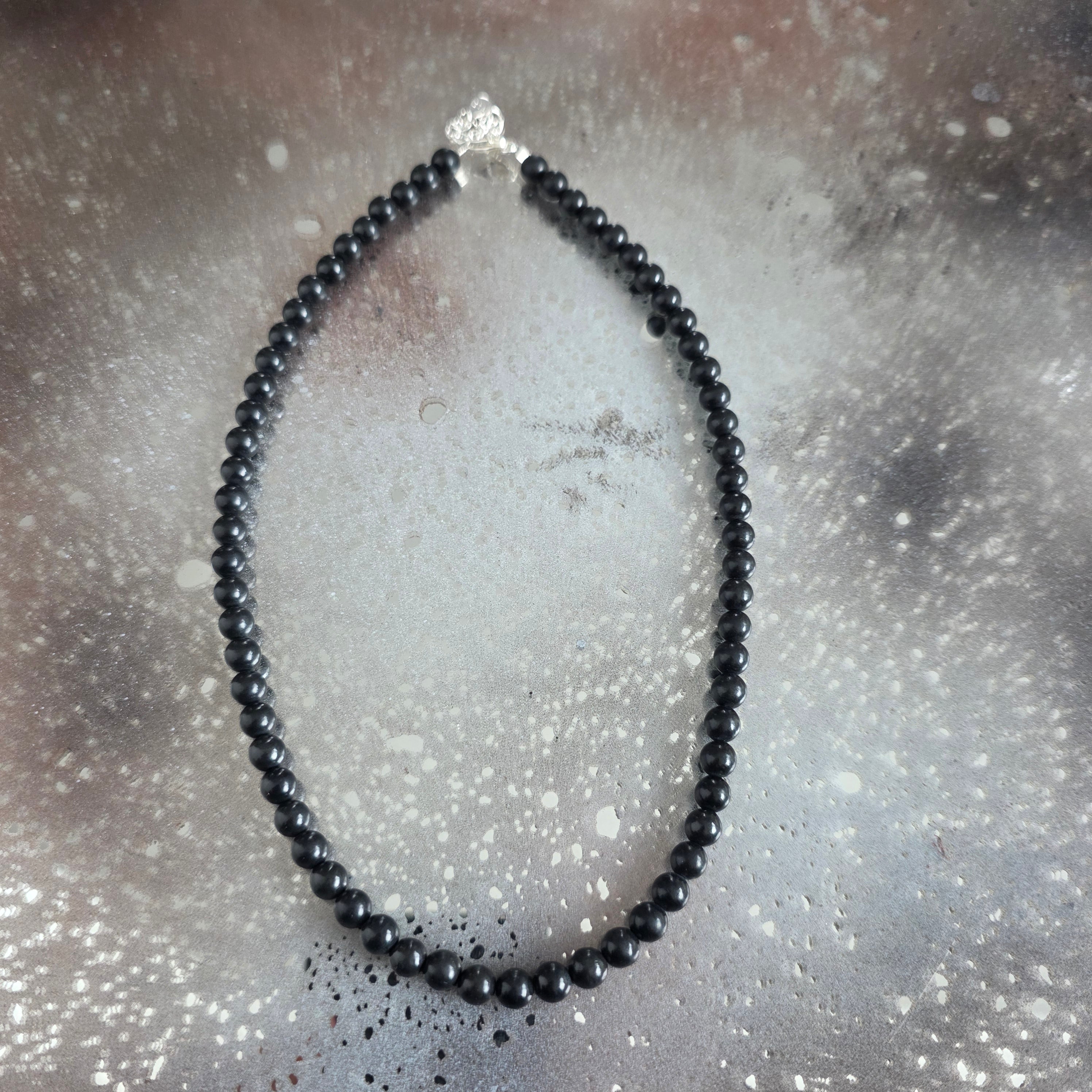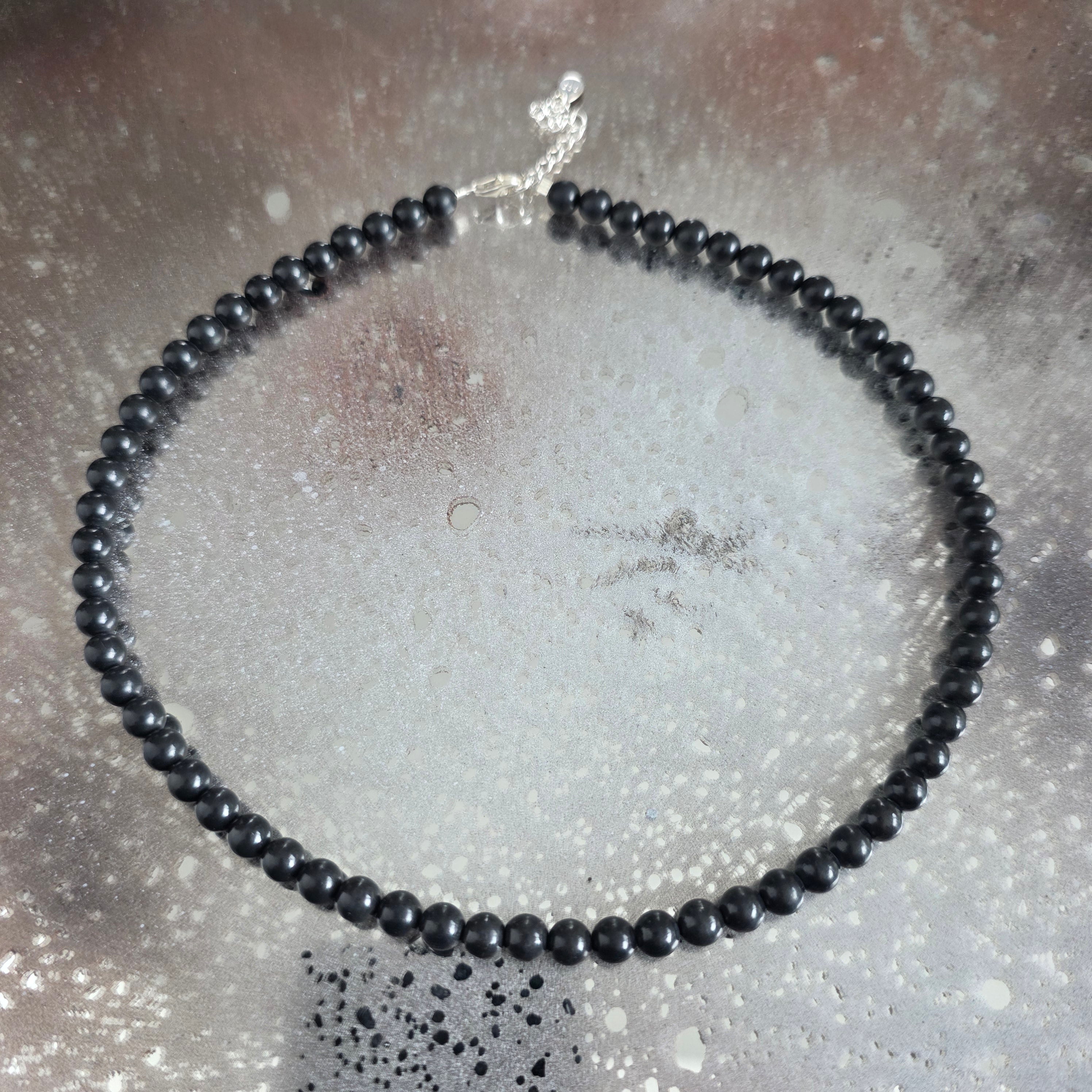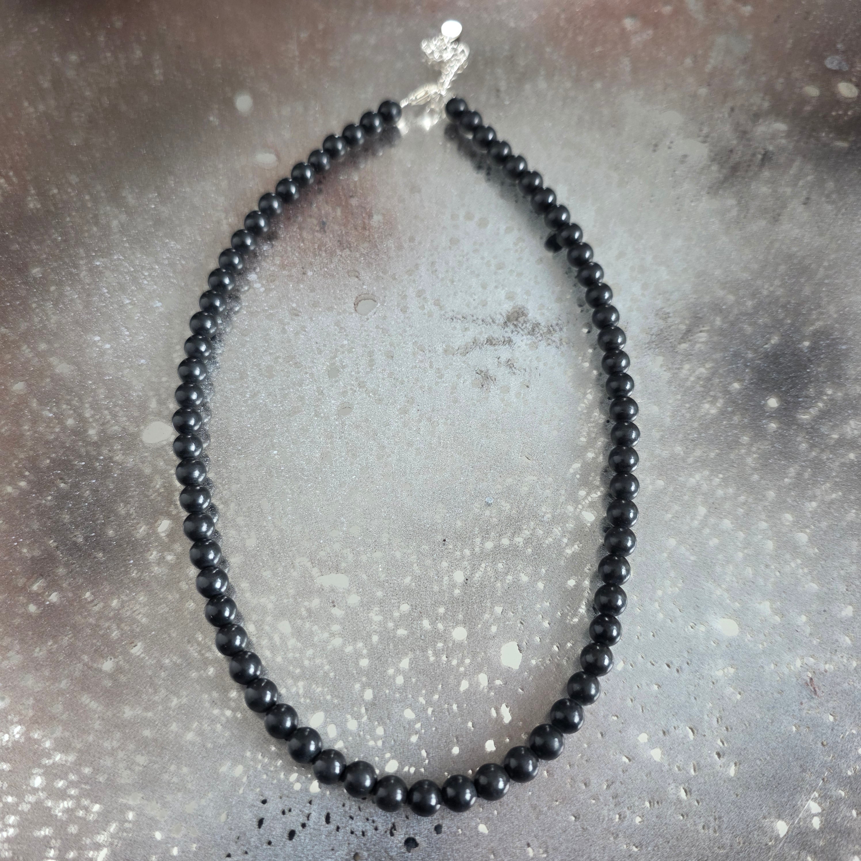 Колие, което прегръща шията като защитна сянка – изискано, сдържано и дълбоко. Изработено от топчета с диаметър 6 мм от естествен шунгит, колието блести деликатно в тонове на наситено черно, подобно на нощта, която не крие, а успокоява.