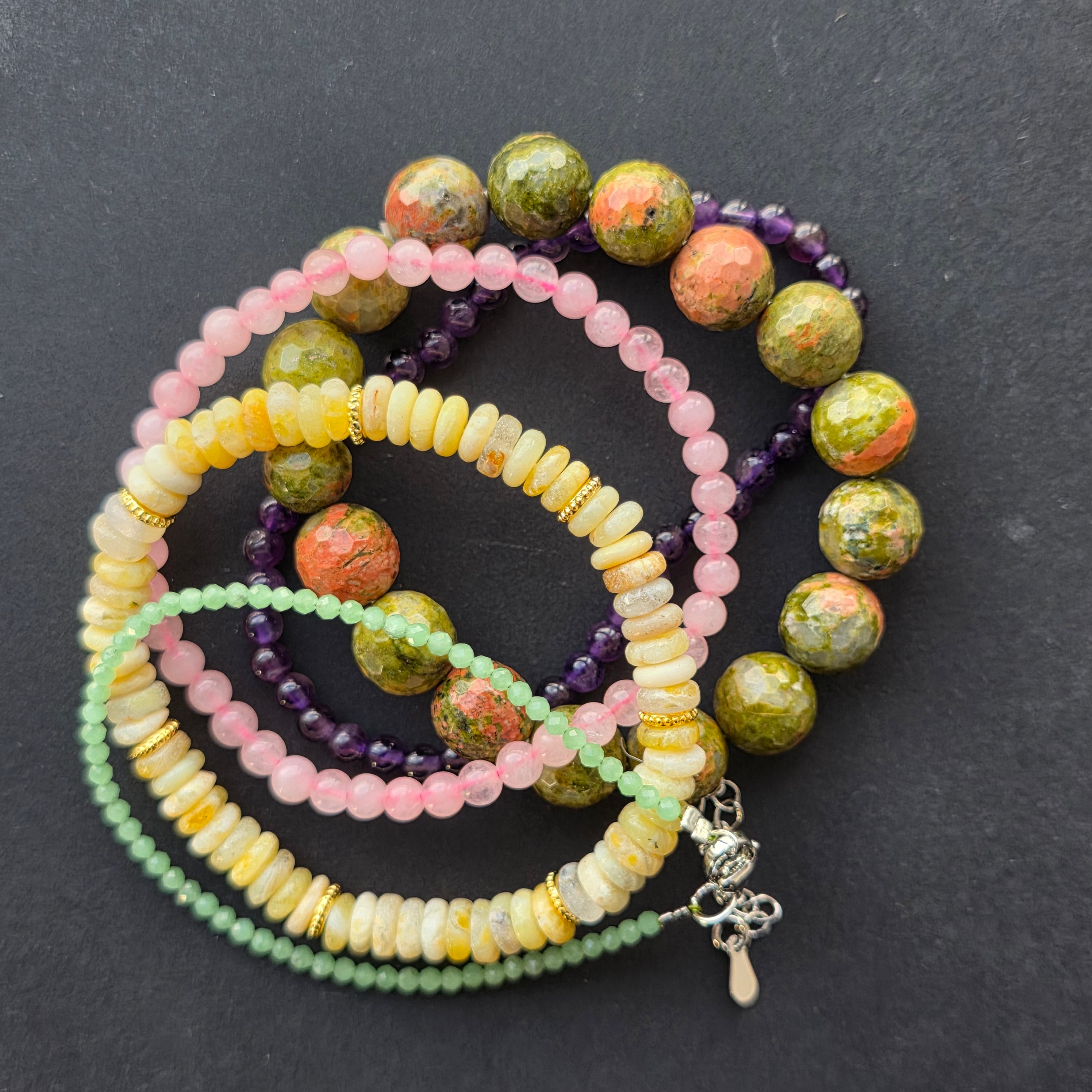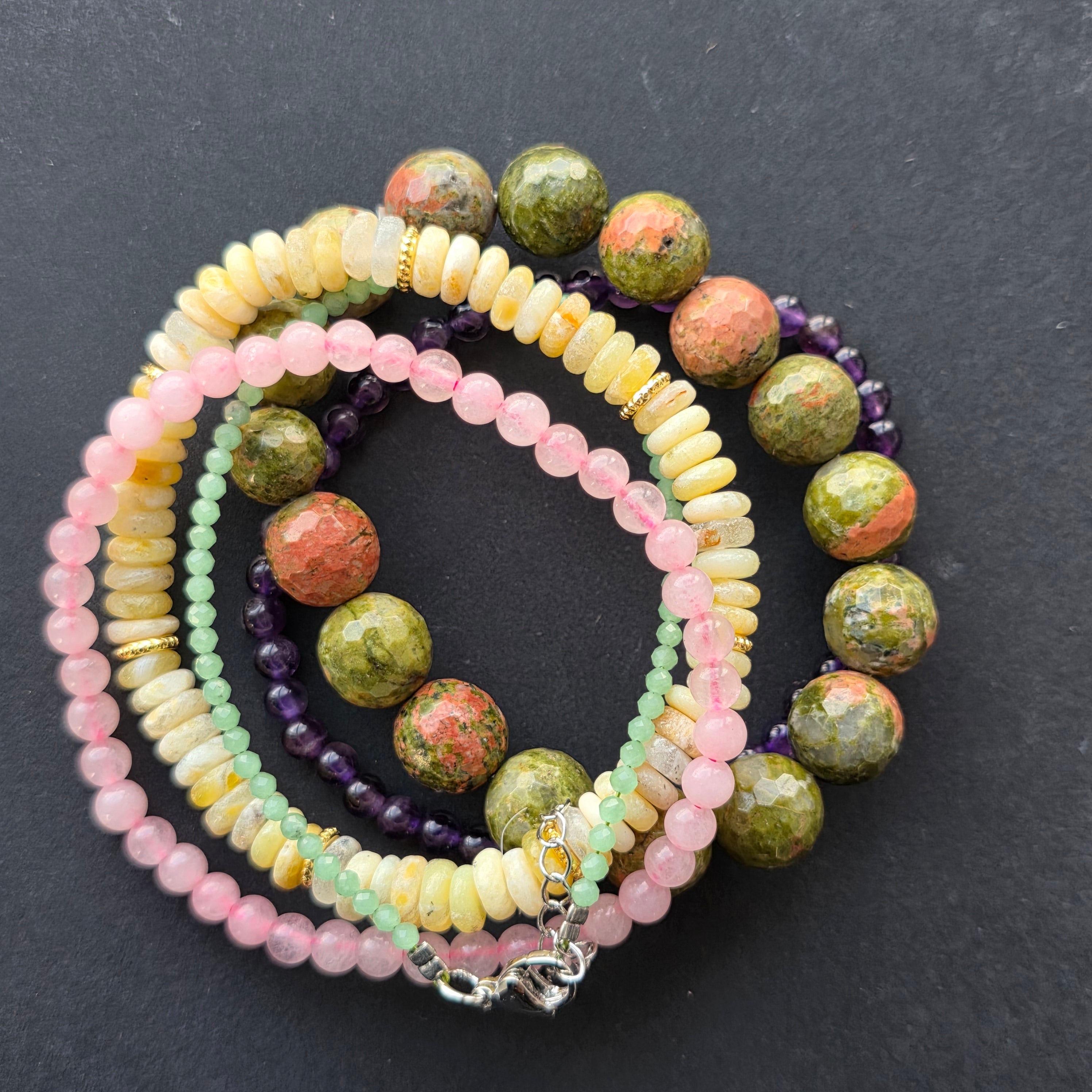 Този комплект е създаден за жената Везни — грациозна, любяща красивото, с деликатна душа и естествено чувство за хармония. Тя търси баланс във всеки аспект на живота си, а избраните камъни в този комплект я подкрепят в откриването на вътрешното пространство, където спокойствието, красотата и яснота се преплитат перфектно.