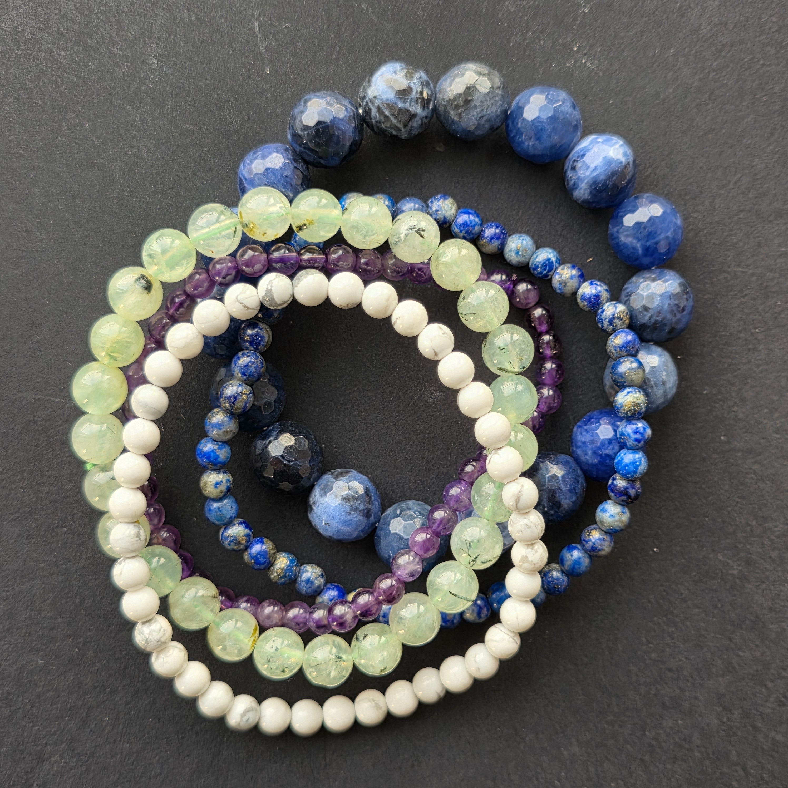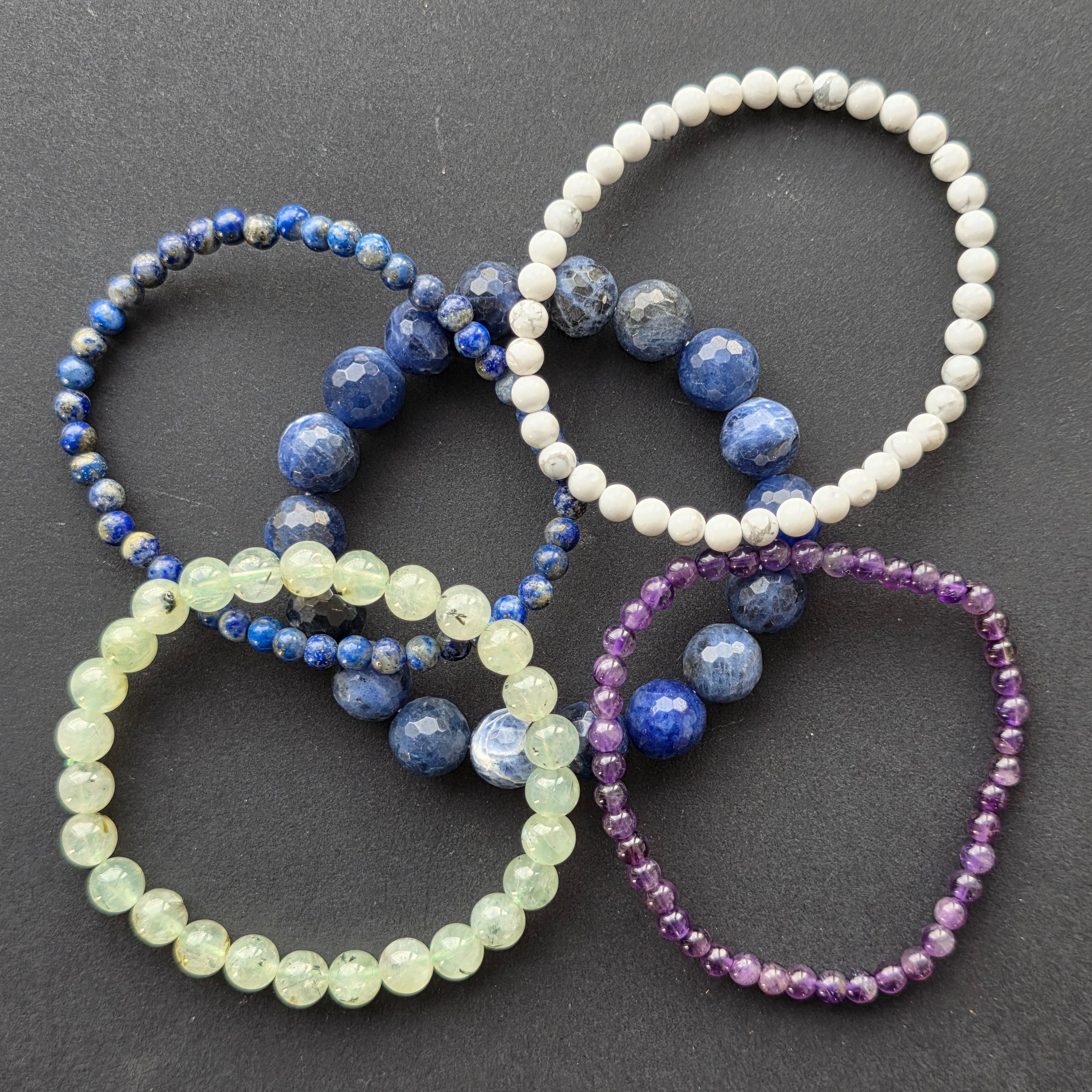Аметистът от 4 мм осигурява спокойствие, пречистване и духовен баланс, допълвайки комплекта с успокояваща и изискана вибрация.