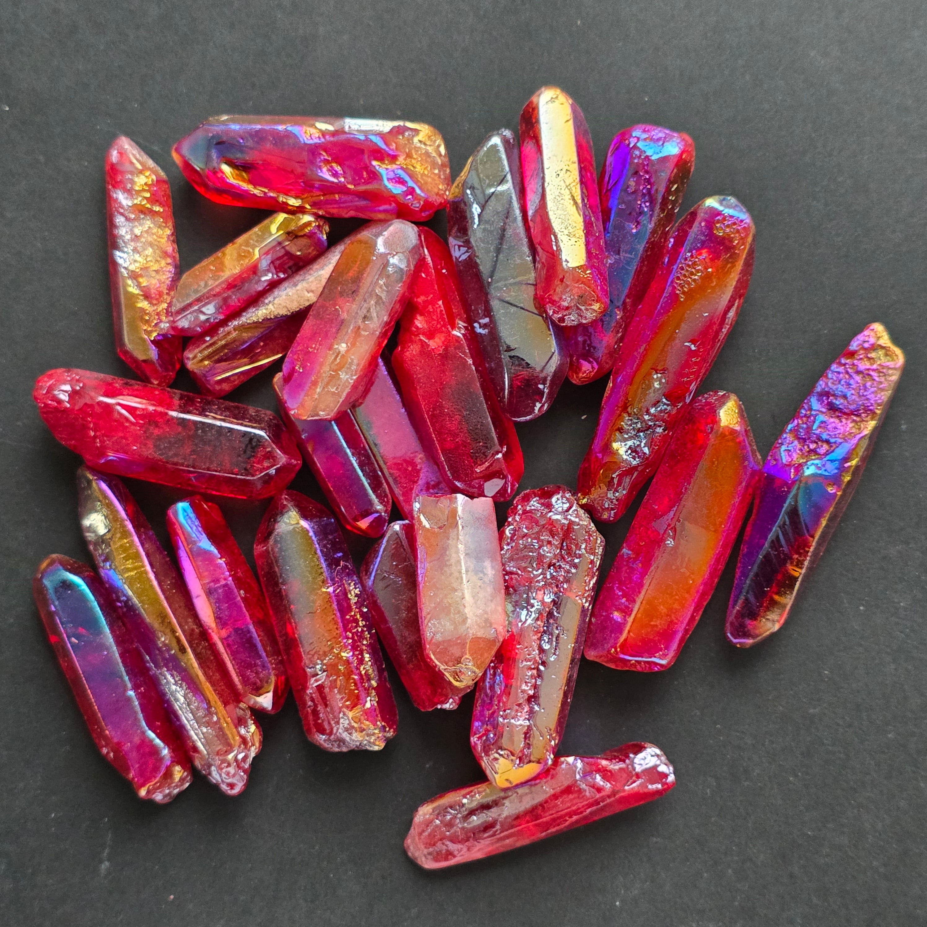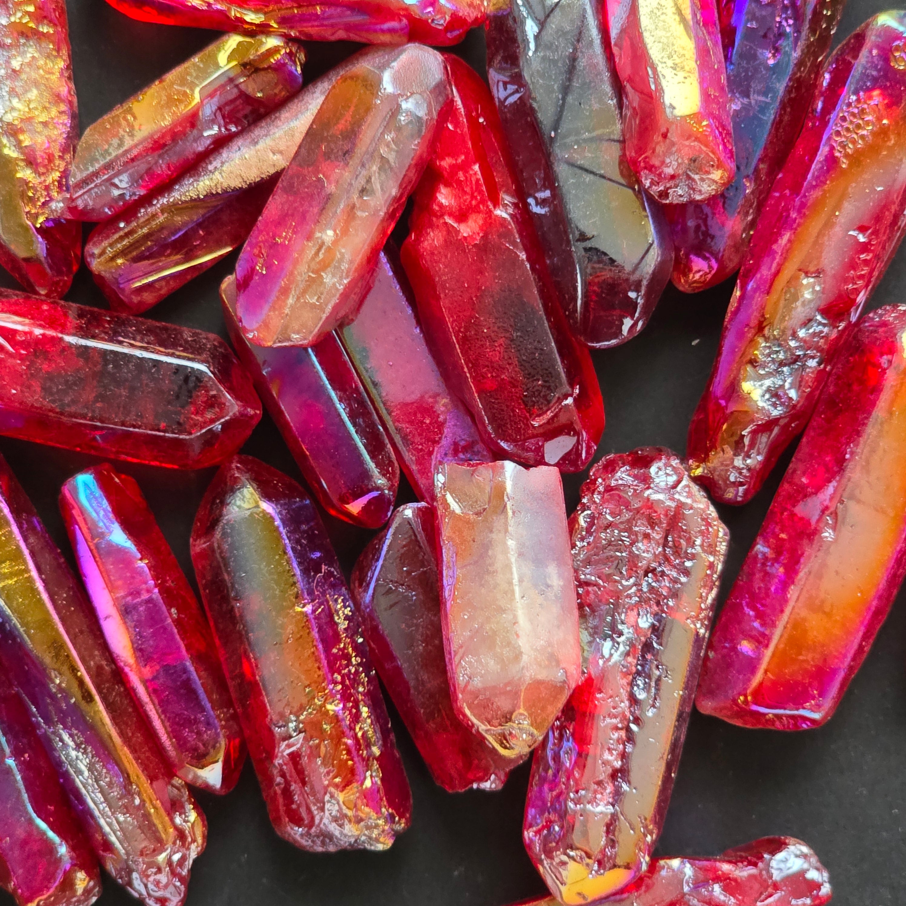 Този кварц е оцветен чрез процес, известен като покритие с аура, за да се засилят ирисцензентните отблясъци и вибрационната енергия на кристала.
