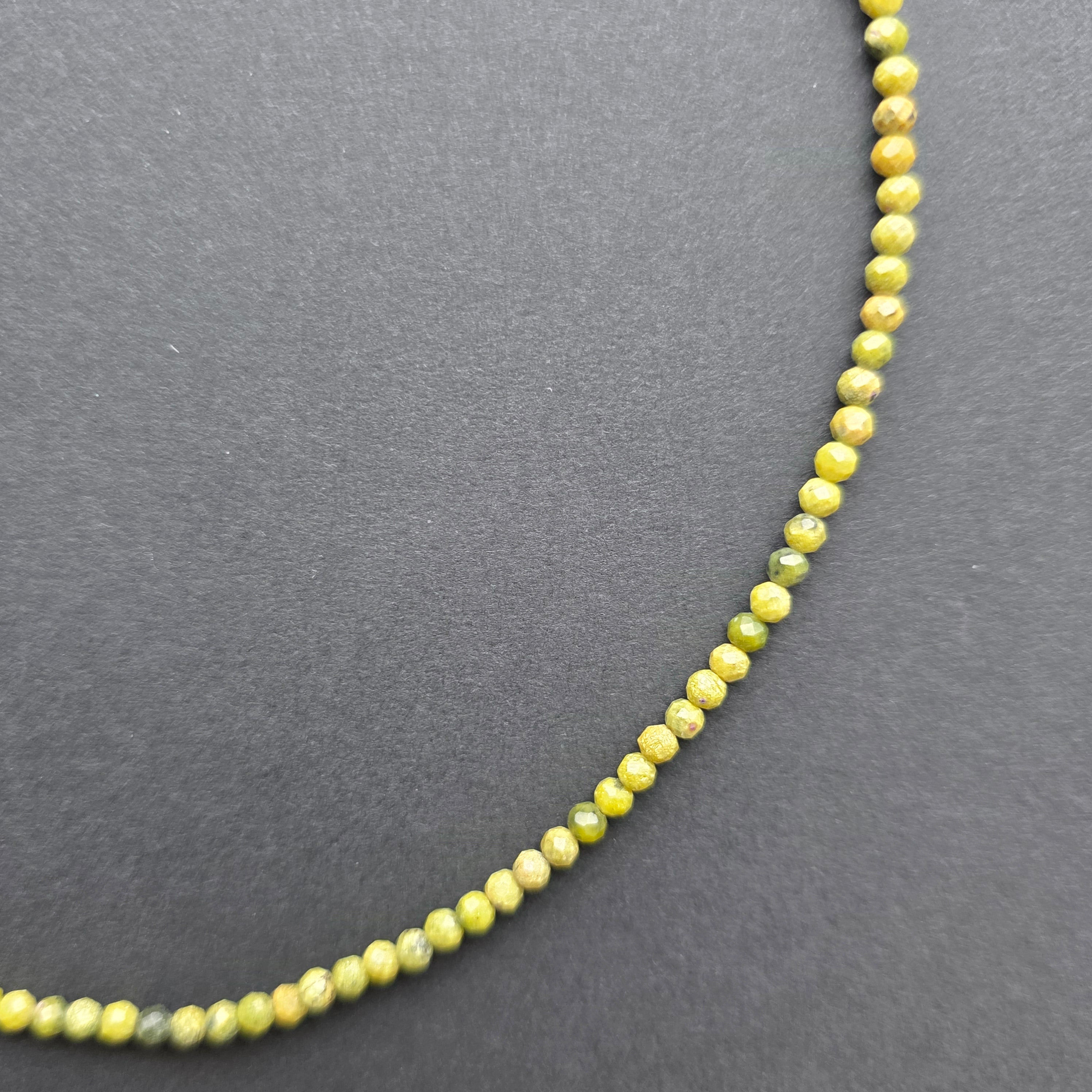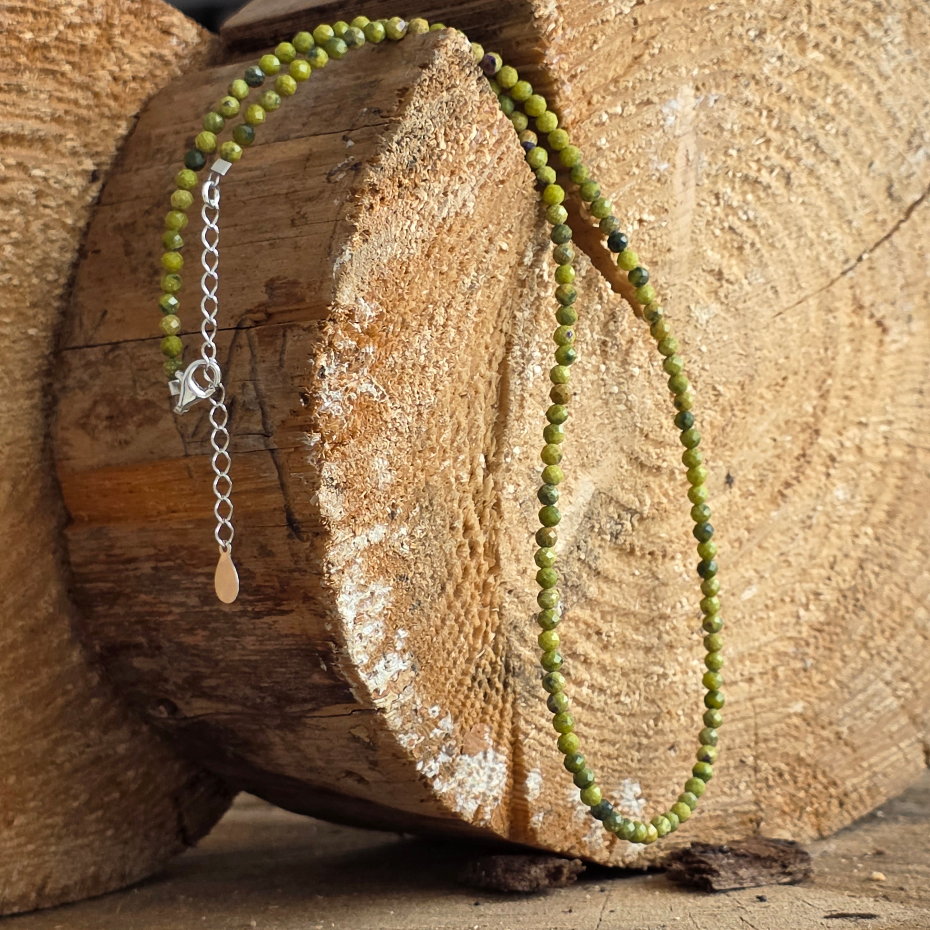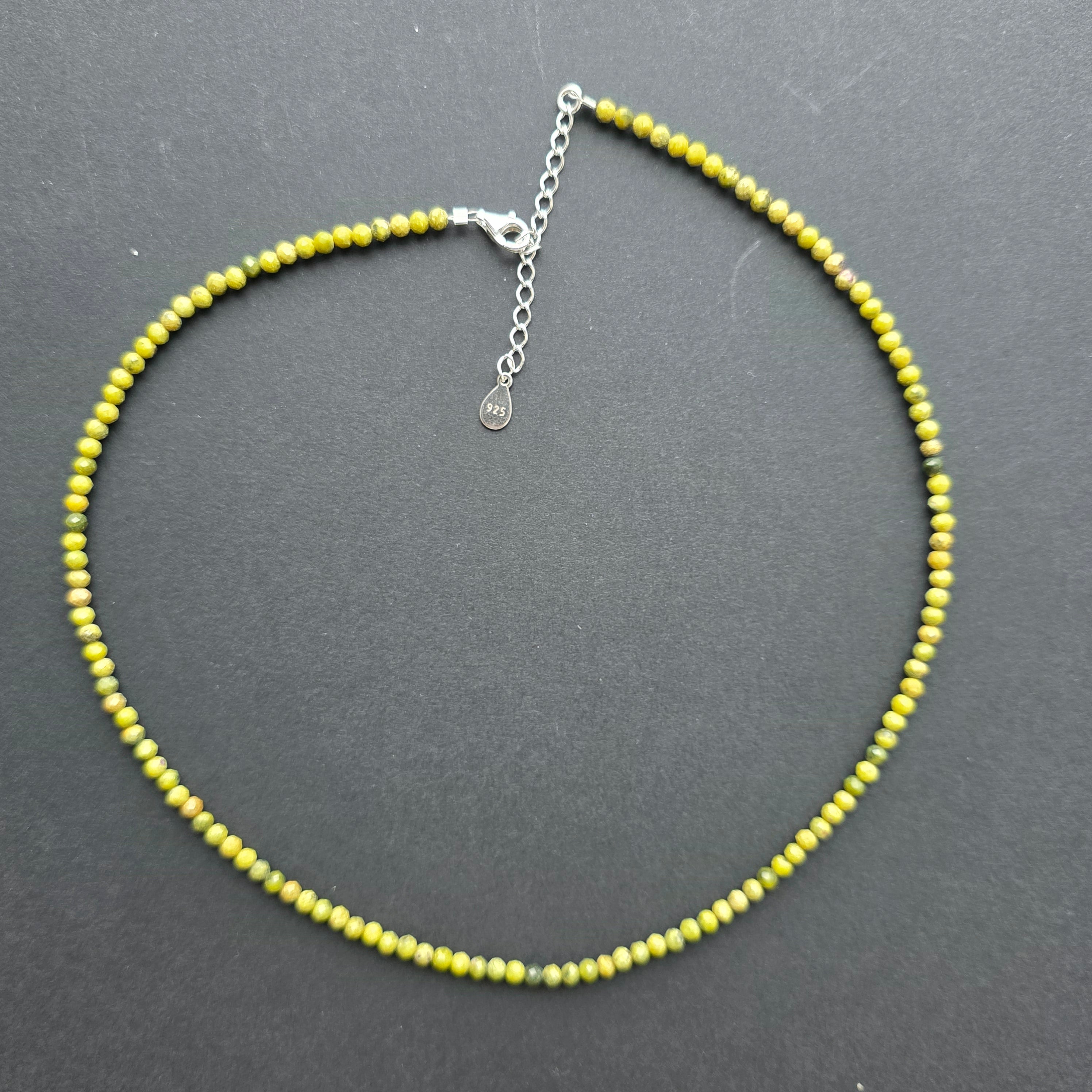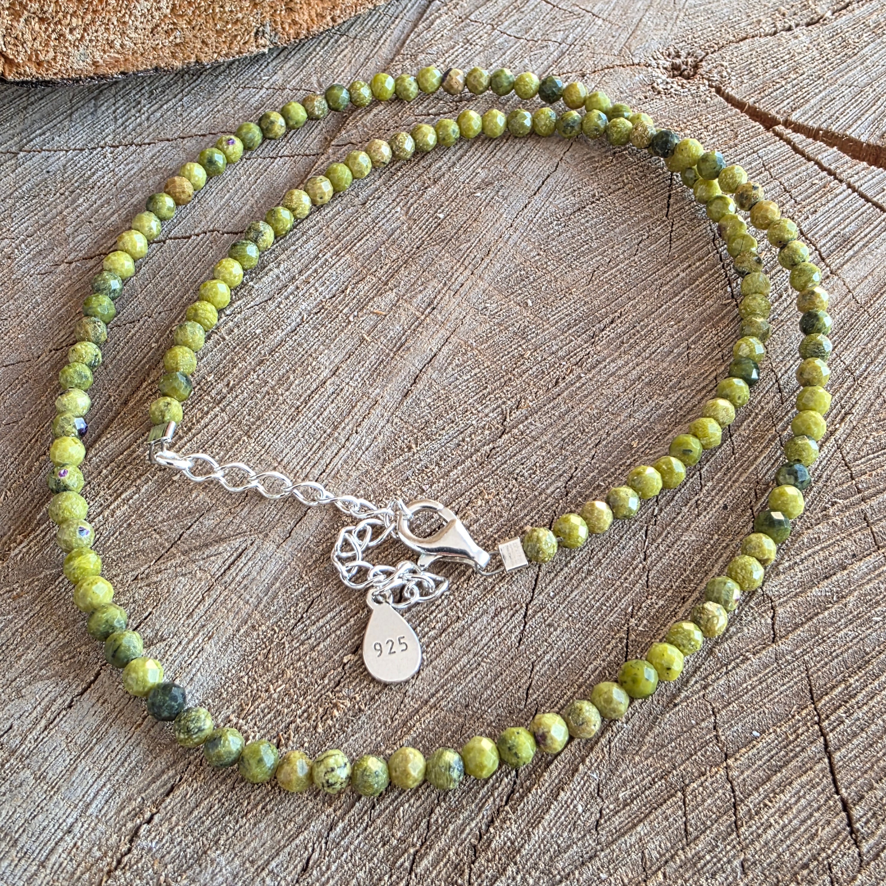 Колие, което носи енергията на вътрешното пробуждане и силата на земята. Серпентината със своите златисто-зелени нюанси напомня спокойствието на горите и тихата сила на природата, която непрекъснато се обновява. 3-милиметровите фасетирани мъниста улавят нежно светлината, като люспите на митично създание - оттук и името му, вдъхновено от древните символи на свещената змия.