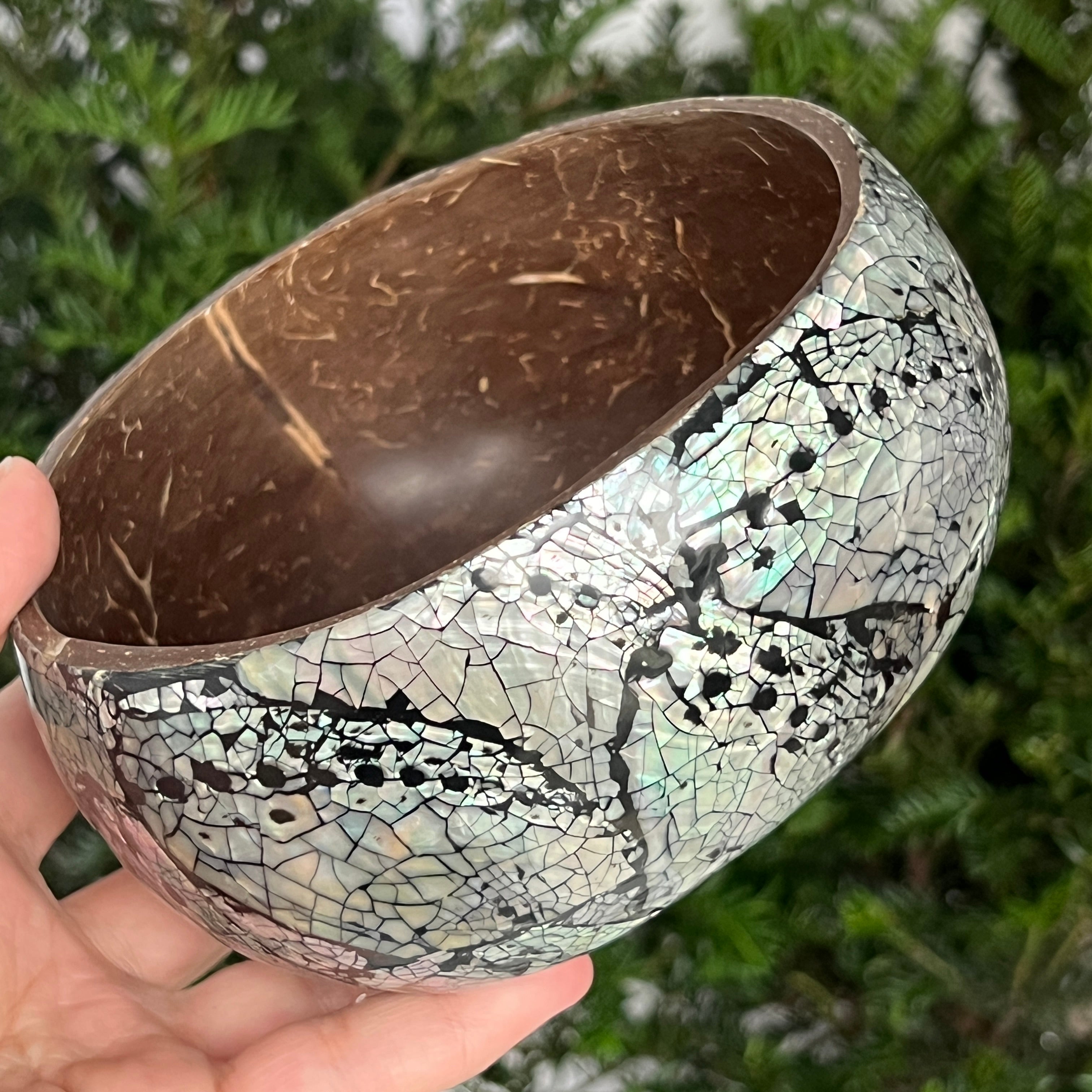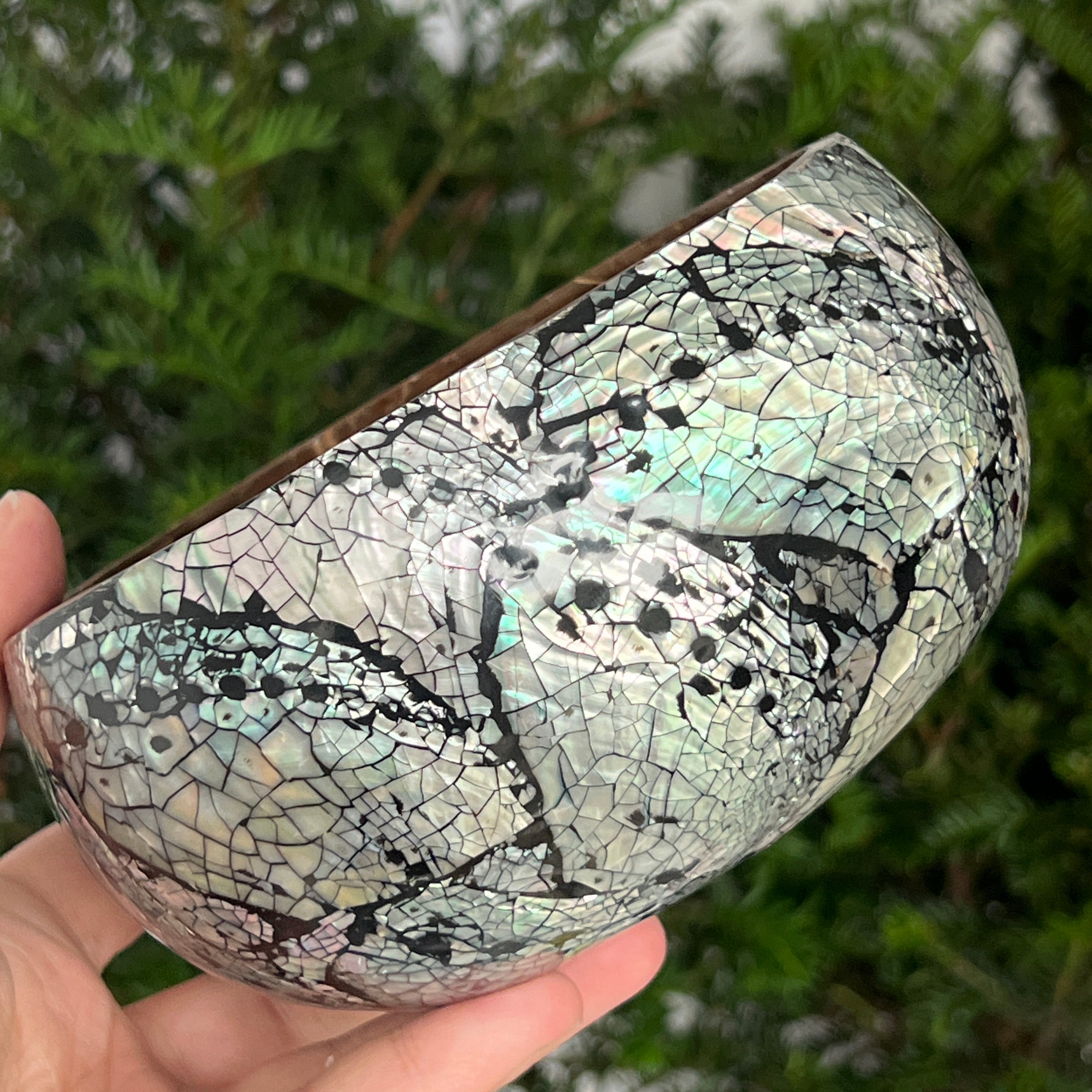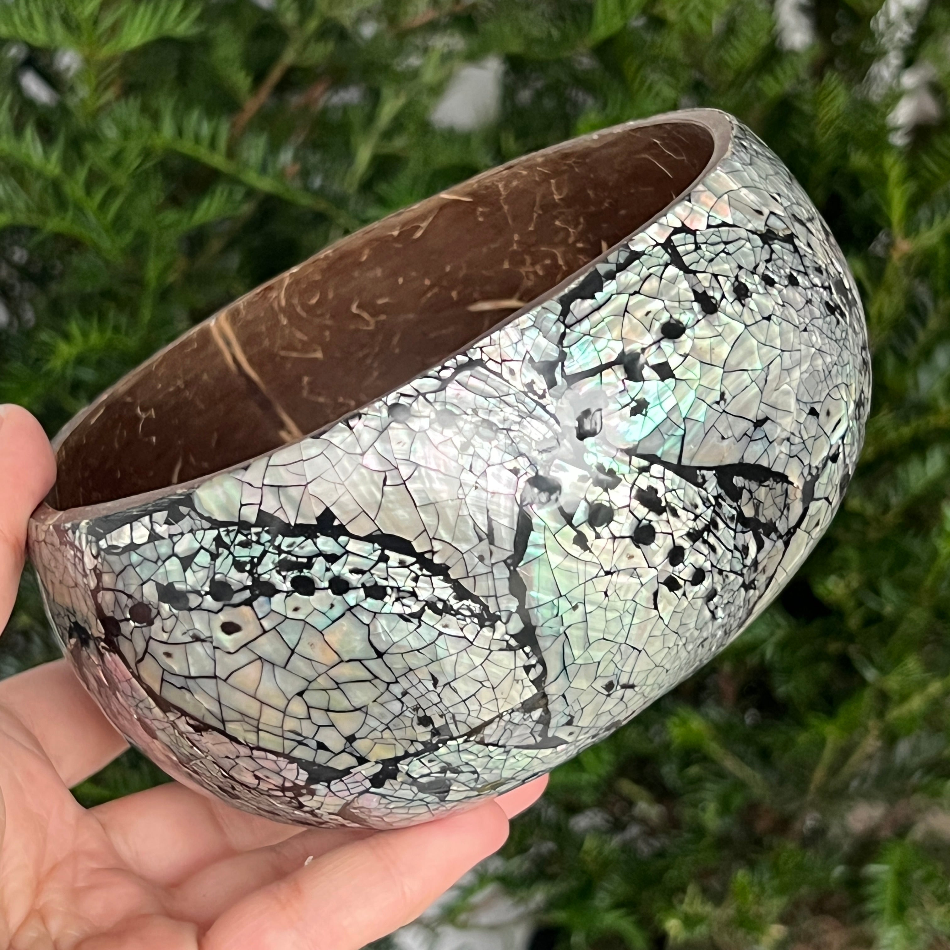 Купата от абалонова черупка и кокос е естествен декоративен елемент, който съчетава топлината на земята със сиянието на морето. Перлените отблясъци напомнят за дълбините на океана и придават елегантен акцент на всяко пространство. Идеална за колекционери, за декорация на личен олтар или като поставка за кристали и бижута.