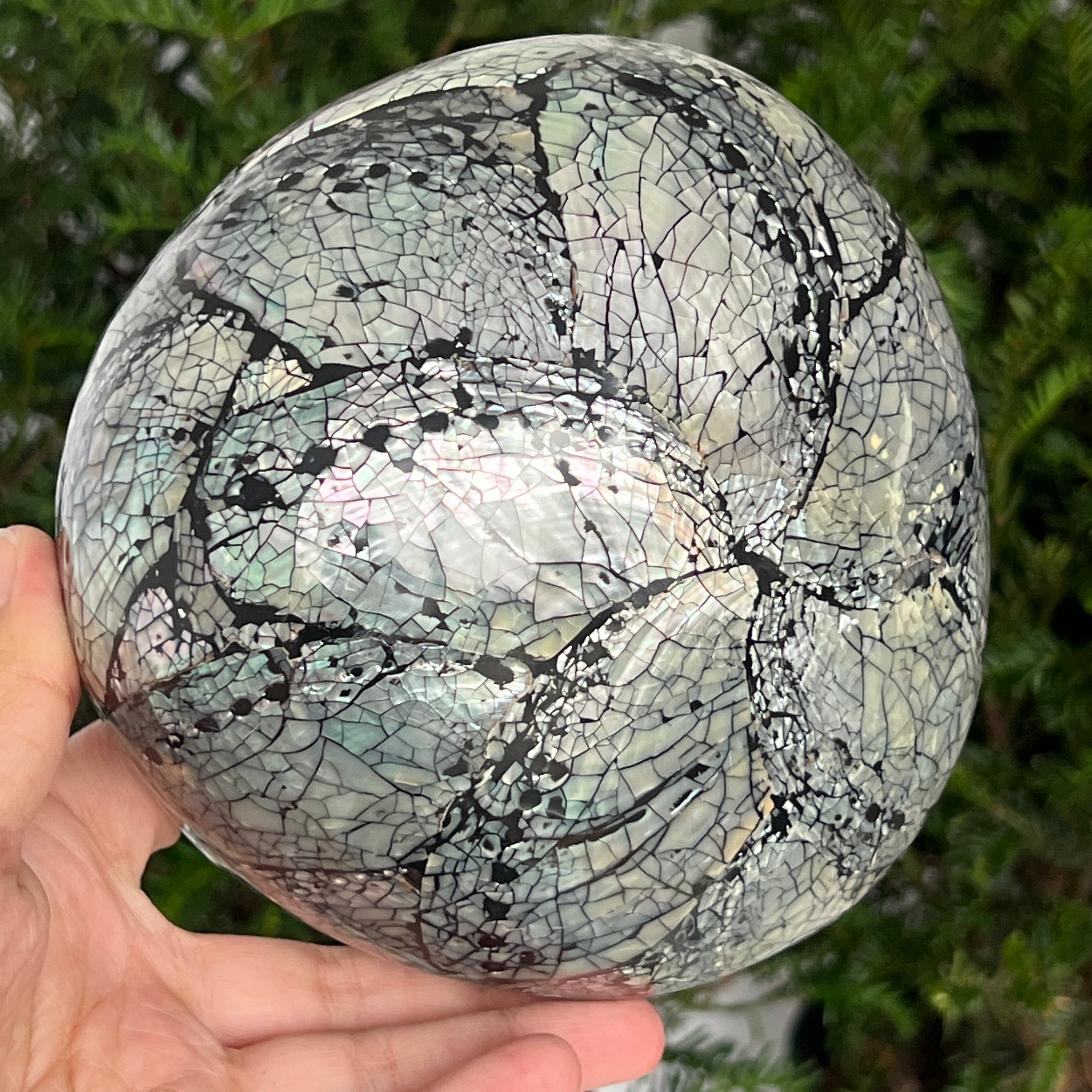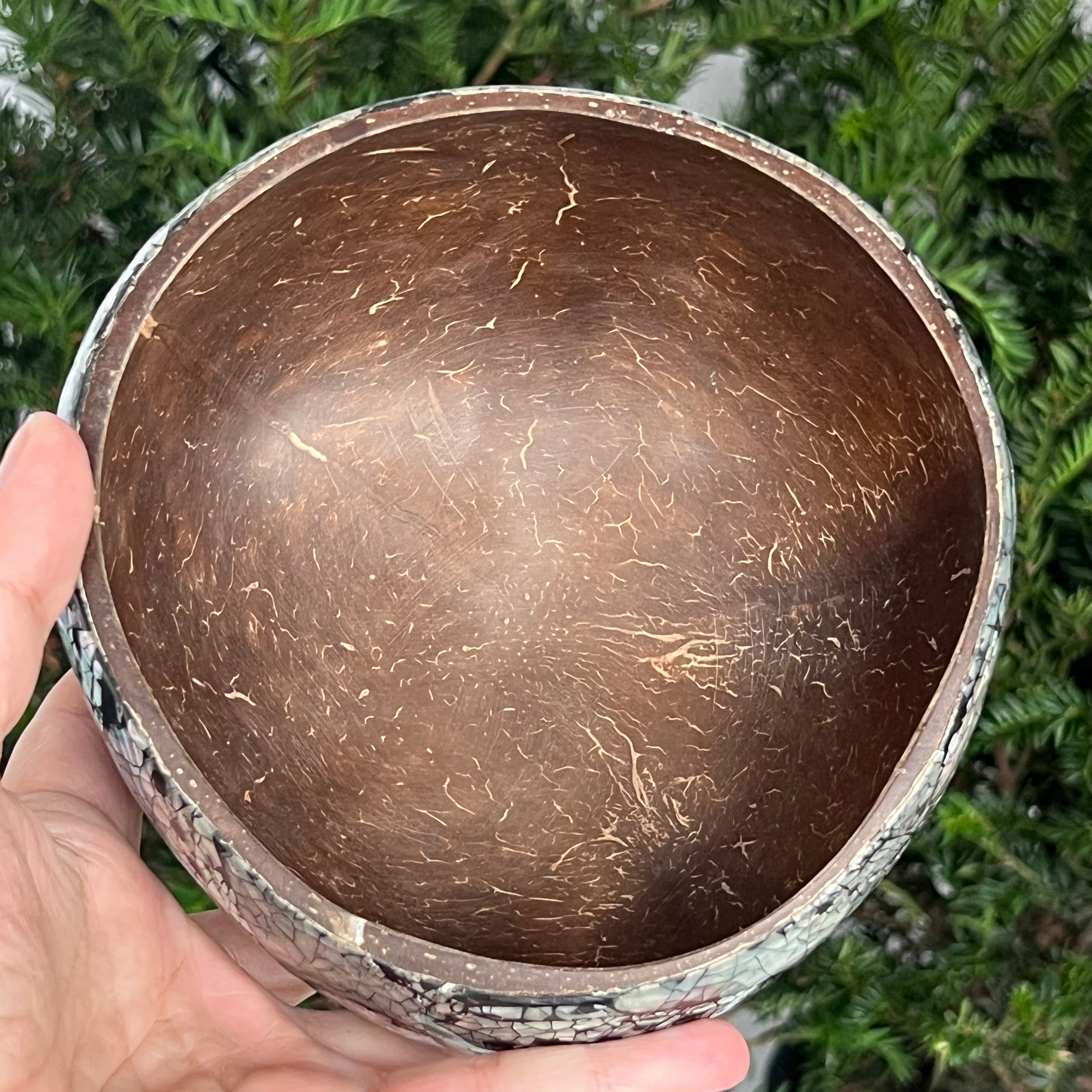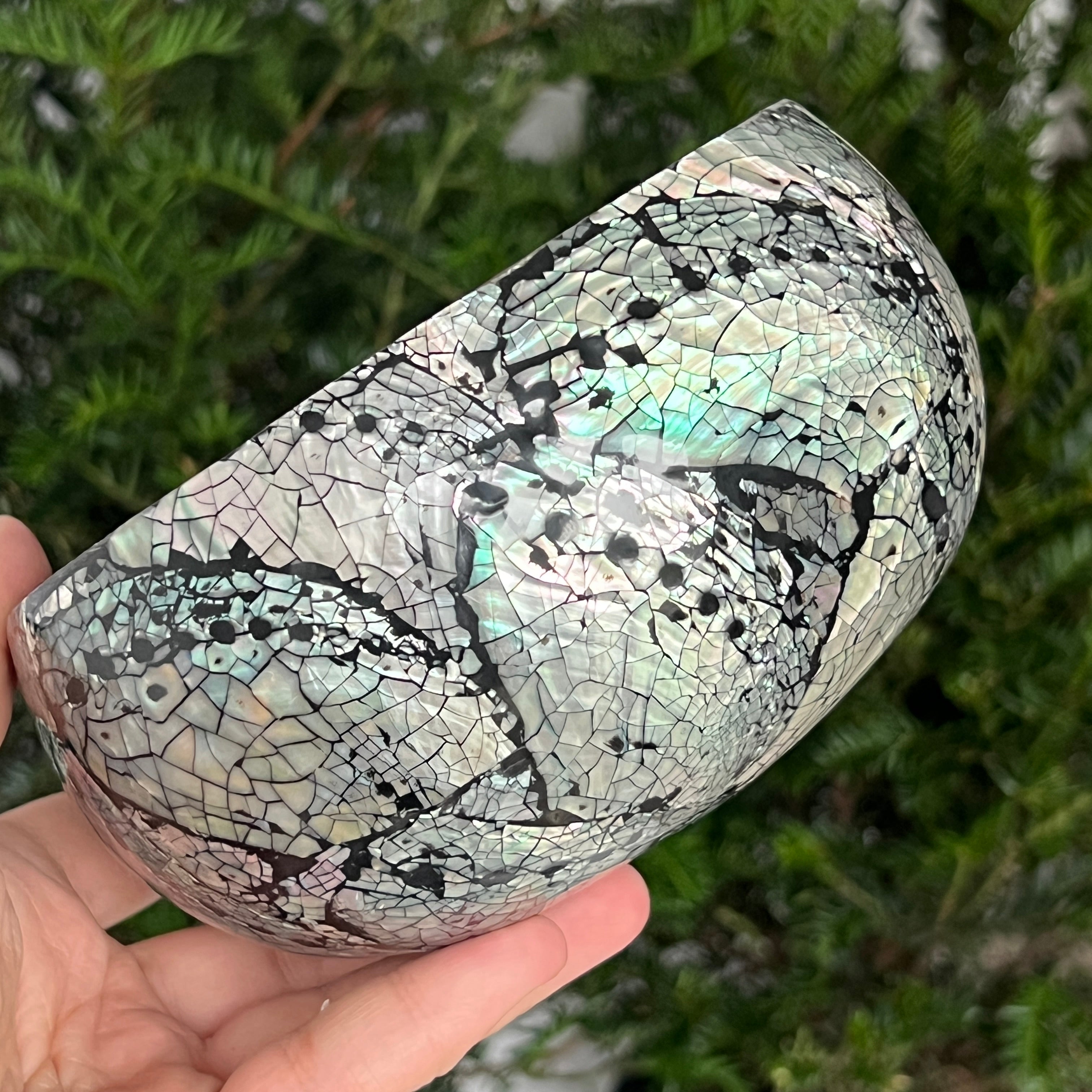 Купата от абалонова черупка и кокос е естествен декоративен елемент, който съчетава топлината на земята със сиянието на морето. Перлените отблясъци напомнят за дълбините на океана и придават елегантен акцент на всяко пространство. Идеална за колекционери, за декорация на личен олтар или като поставка за кристали и бижута.