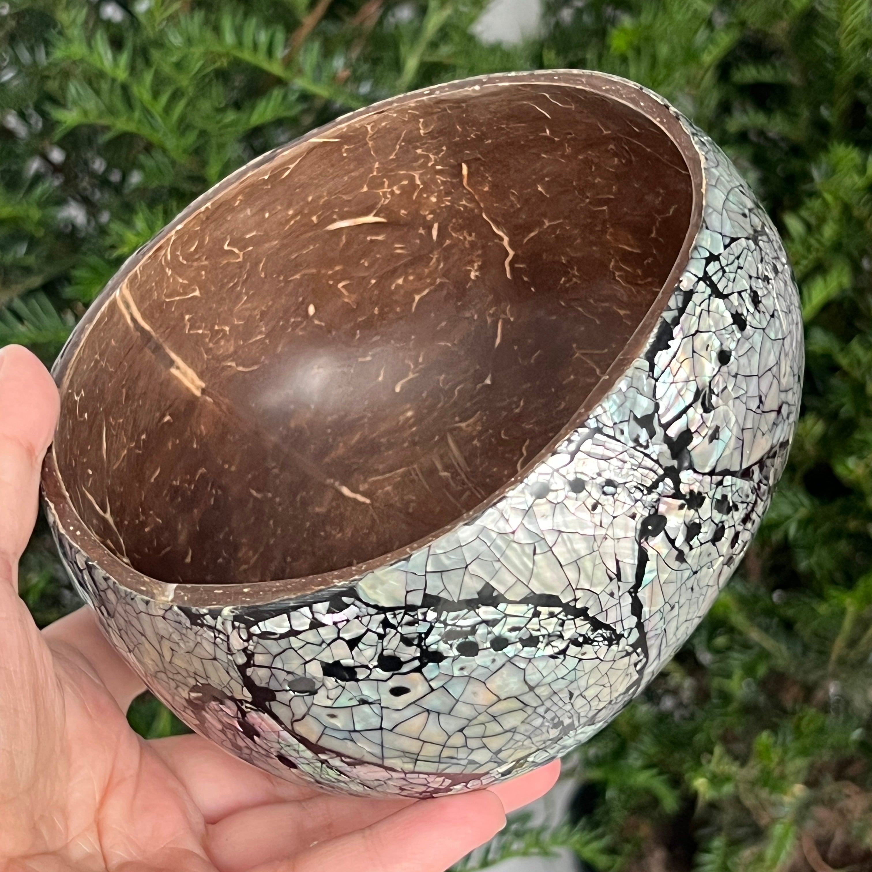 • Завършек: вътрешността е от абалонова черупка с перлен блясък, външността е от естествен кокос, ръчно полиран