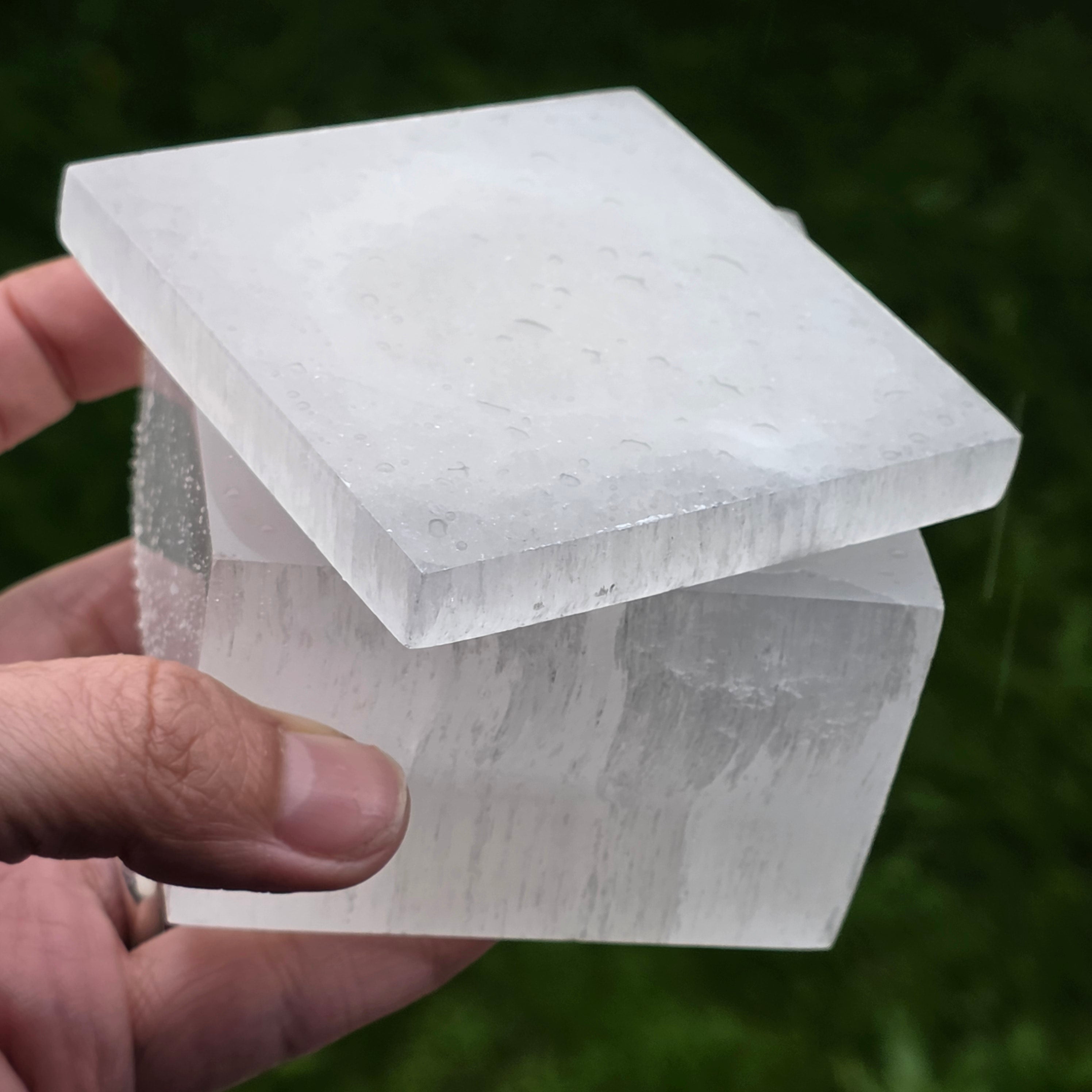 Кутията от селенит е една от най-фините произведения, създадени от този светъл минерал, функционална и декоративна скулптура едновременно. Изработена ръчно от блокове марокански селенит с високо качество, изделието запазва онзи неповторим ефект на „втвърдена светлина“ – прозрачните влакна на камъка създават фини, копринени отблясъци, които те канят да го гледаш отново и отново.
