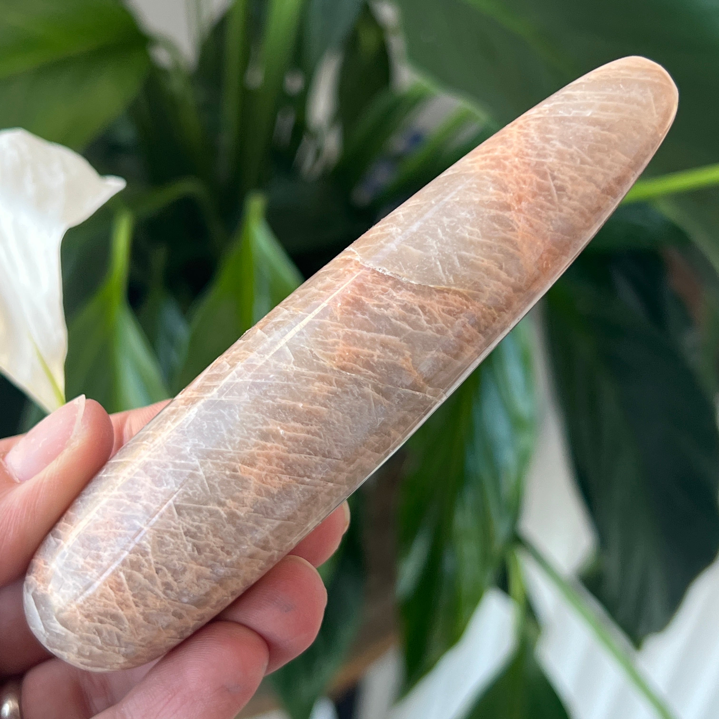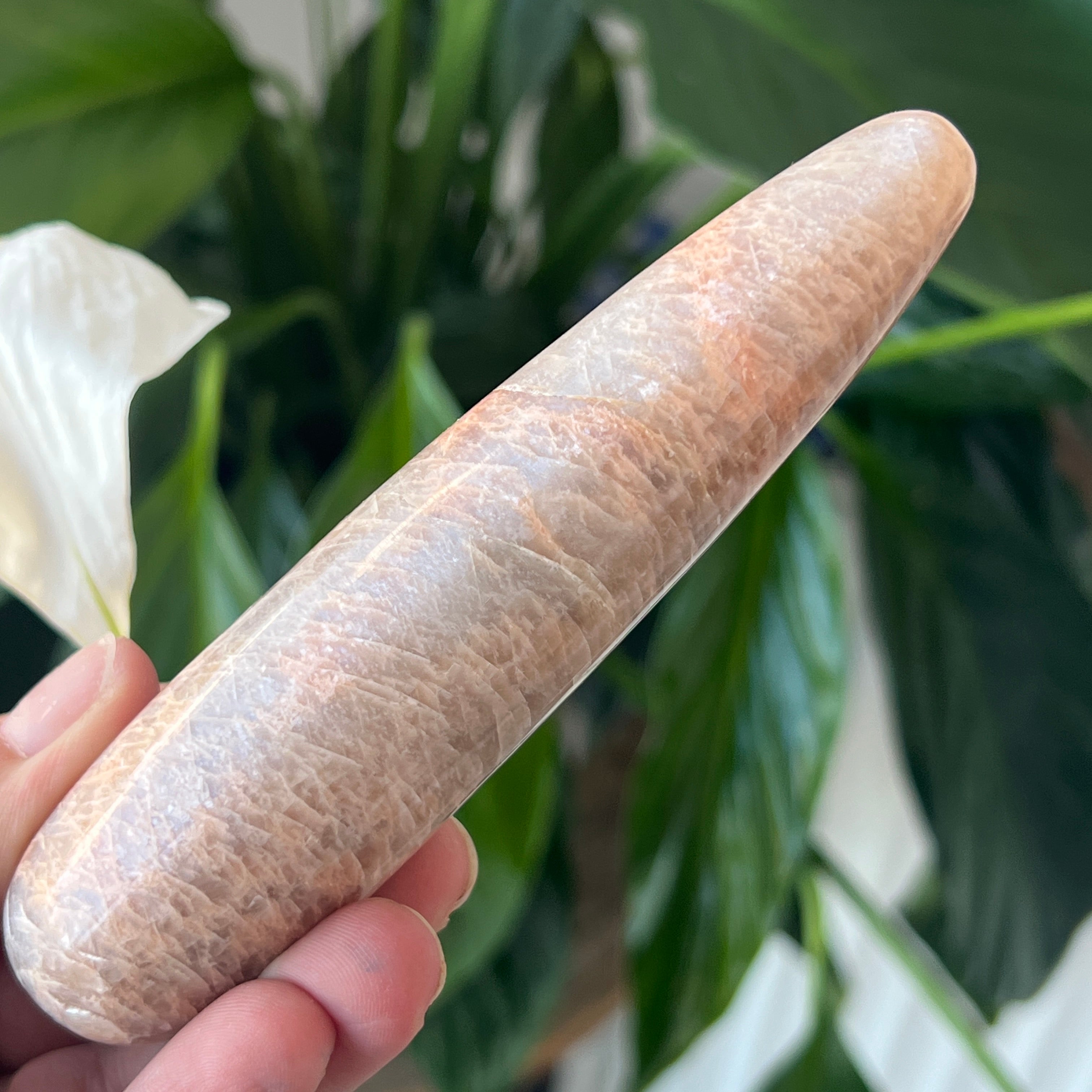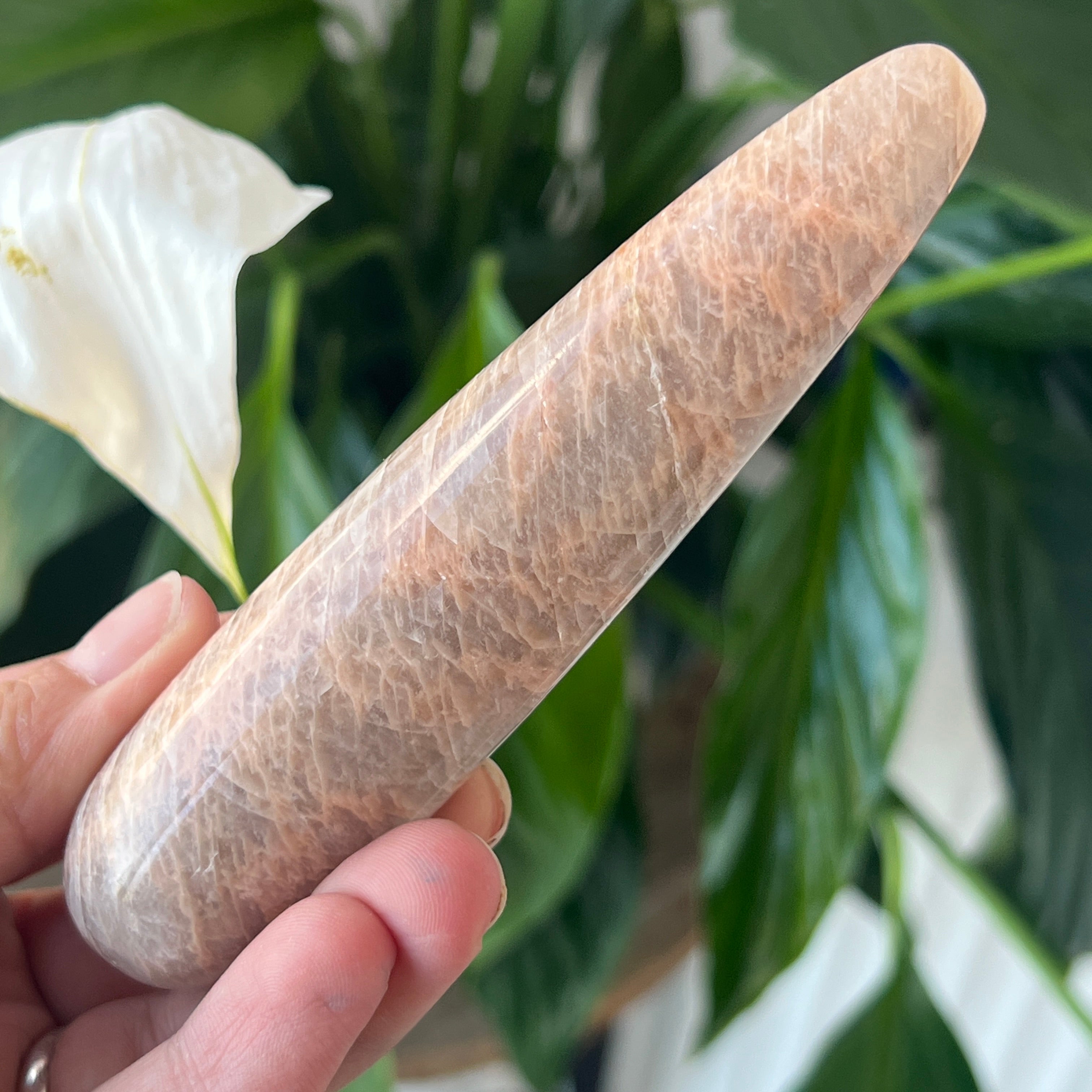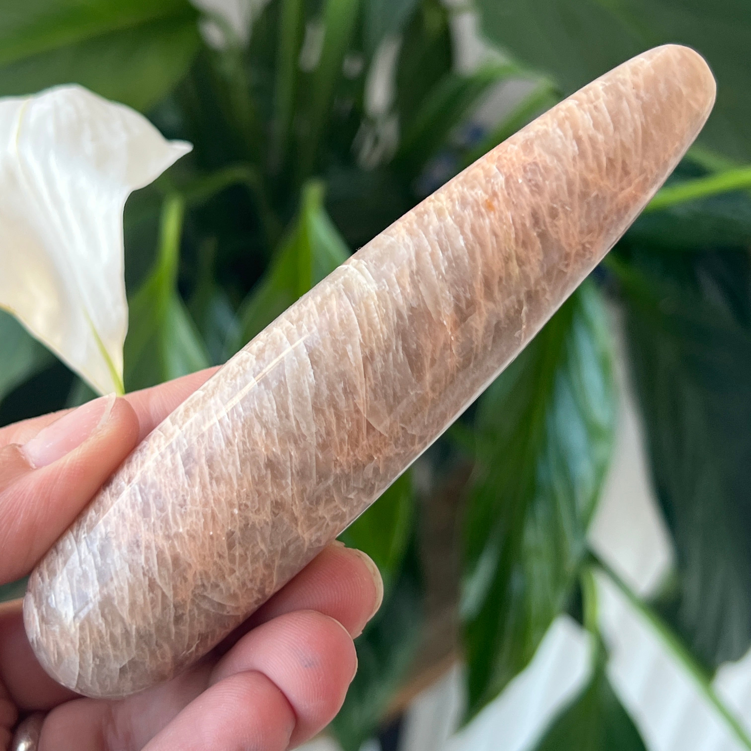 Лунният камък е алуминиево-калиев силикатен фелдшпат. Цветът обикновено варира от кафеникаво-златист до много светло прасковено/розово. Този материал е известен и като Микроклин Оранжев Фелдшпат.