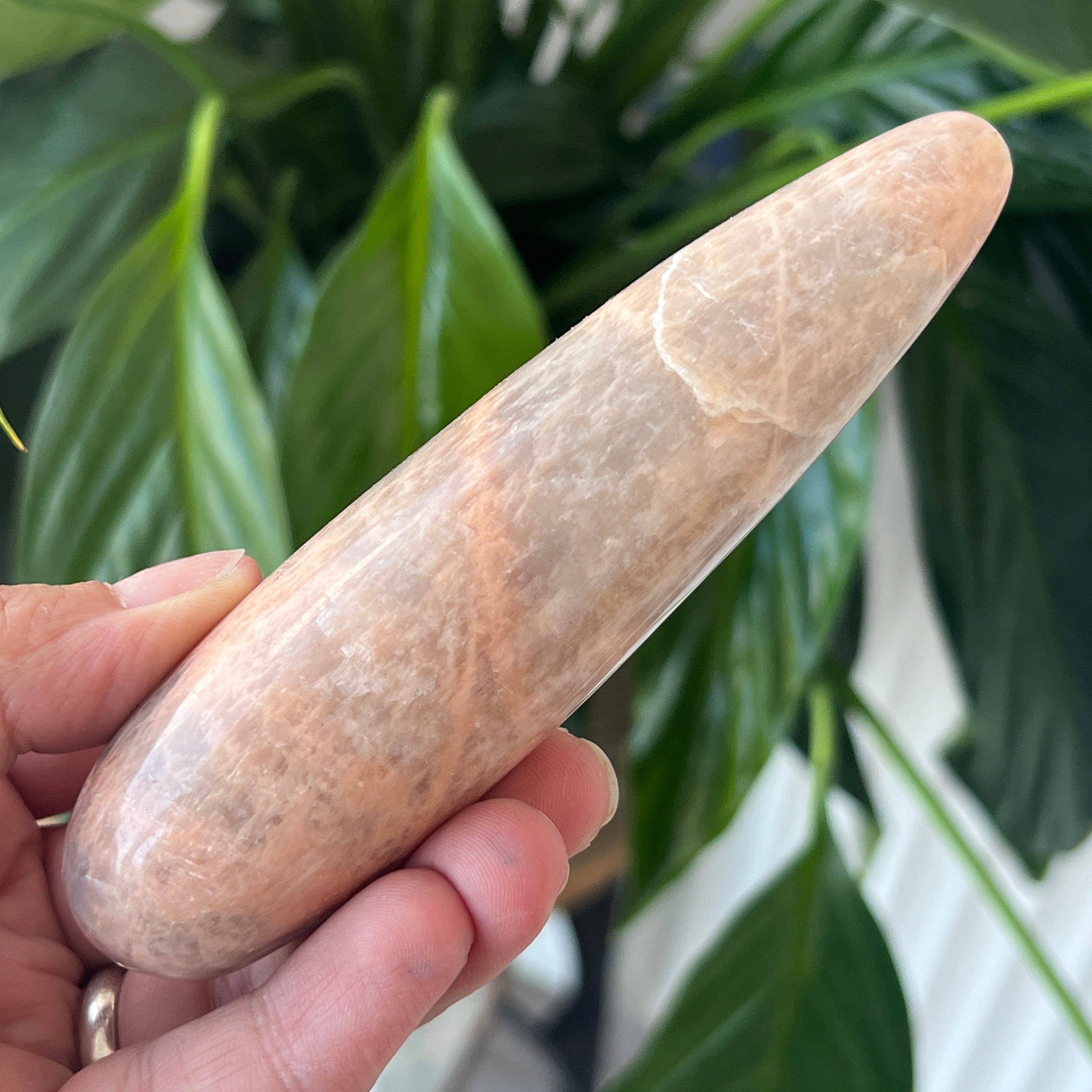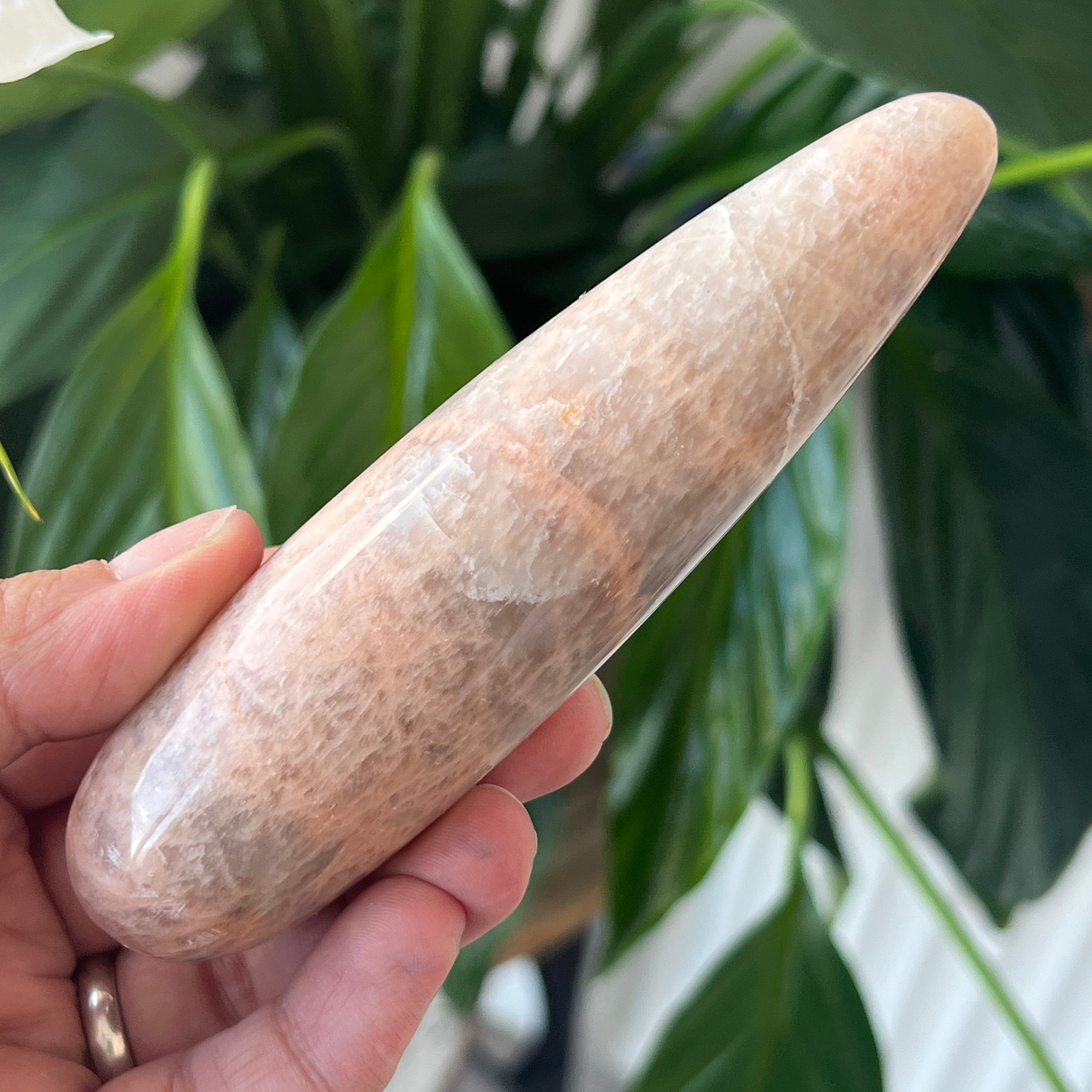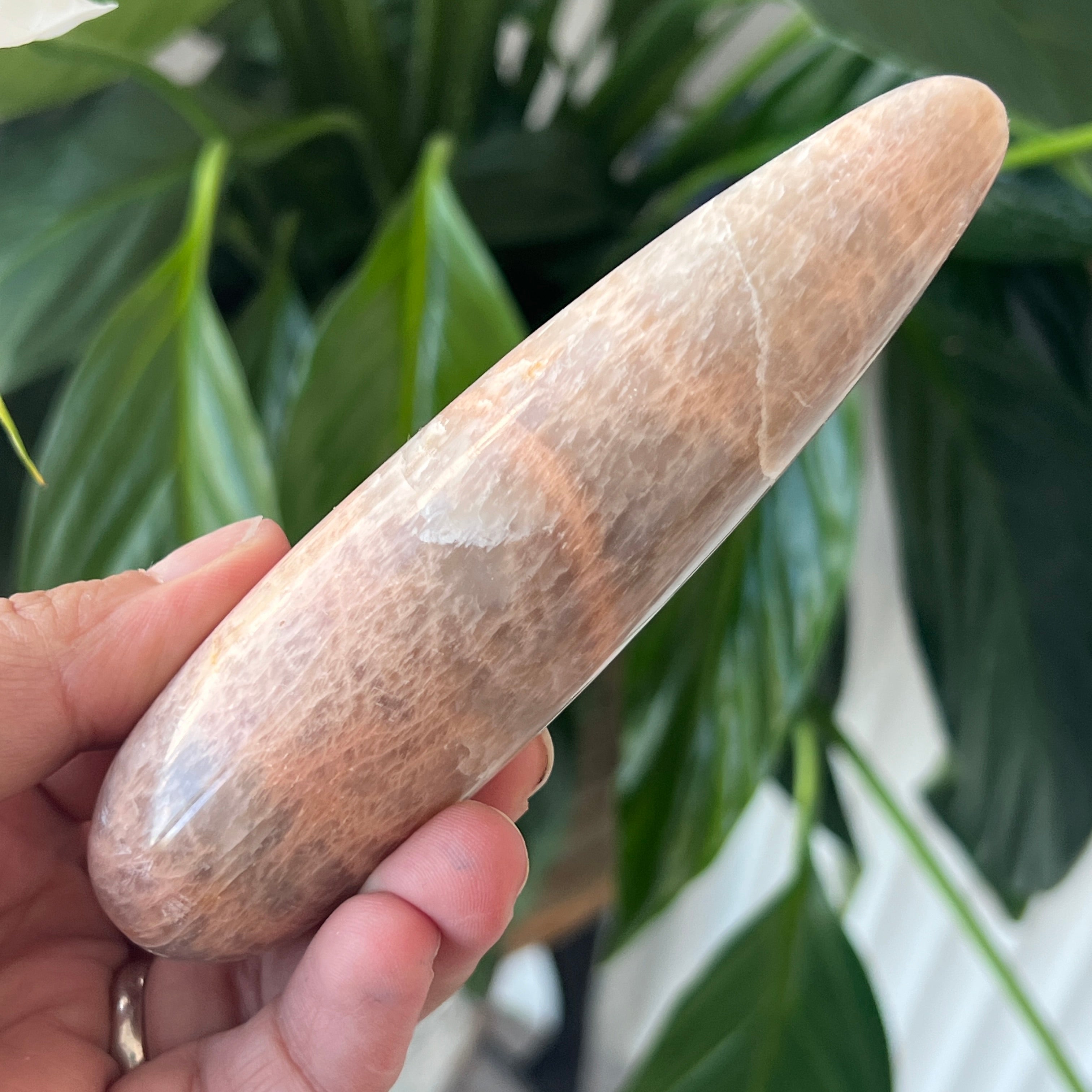Лунният камък е алуминиево-калиев силикатен фелдшпат. Цветът обикновено варира от кафеникаво-златист до много светъл прасковено/розов. Този материал е известен и под името Оранжев микроклин фелдшпат.