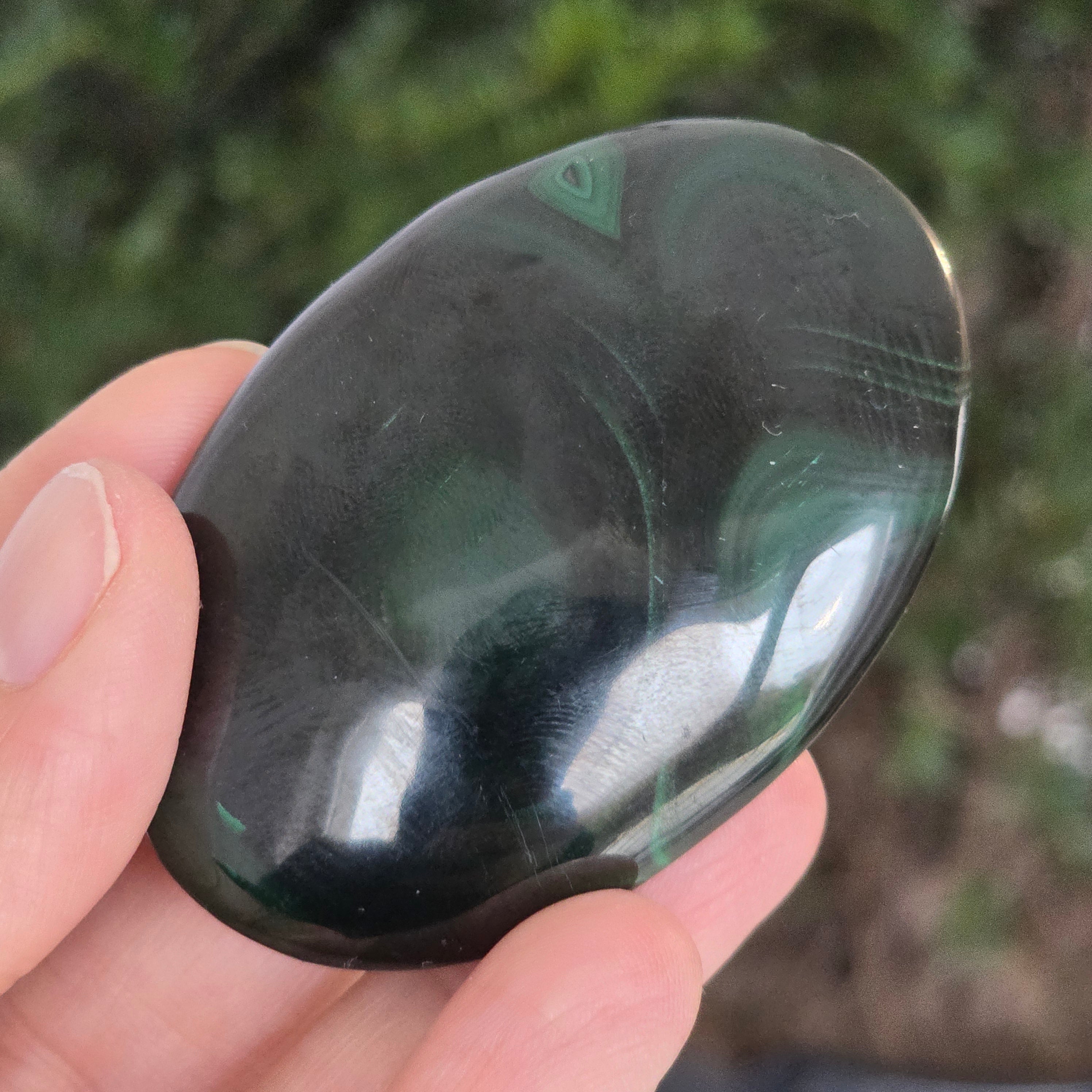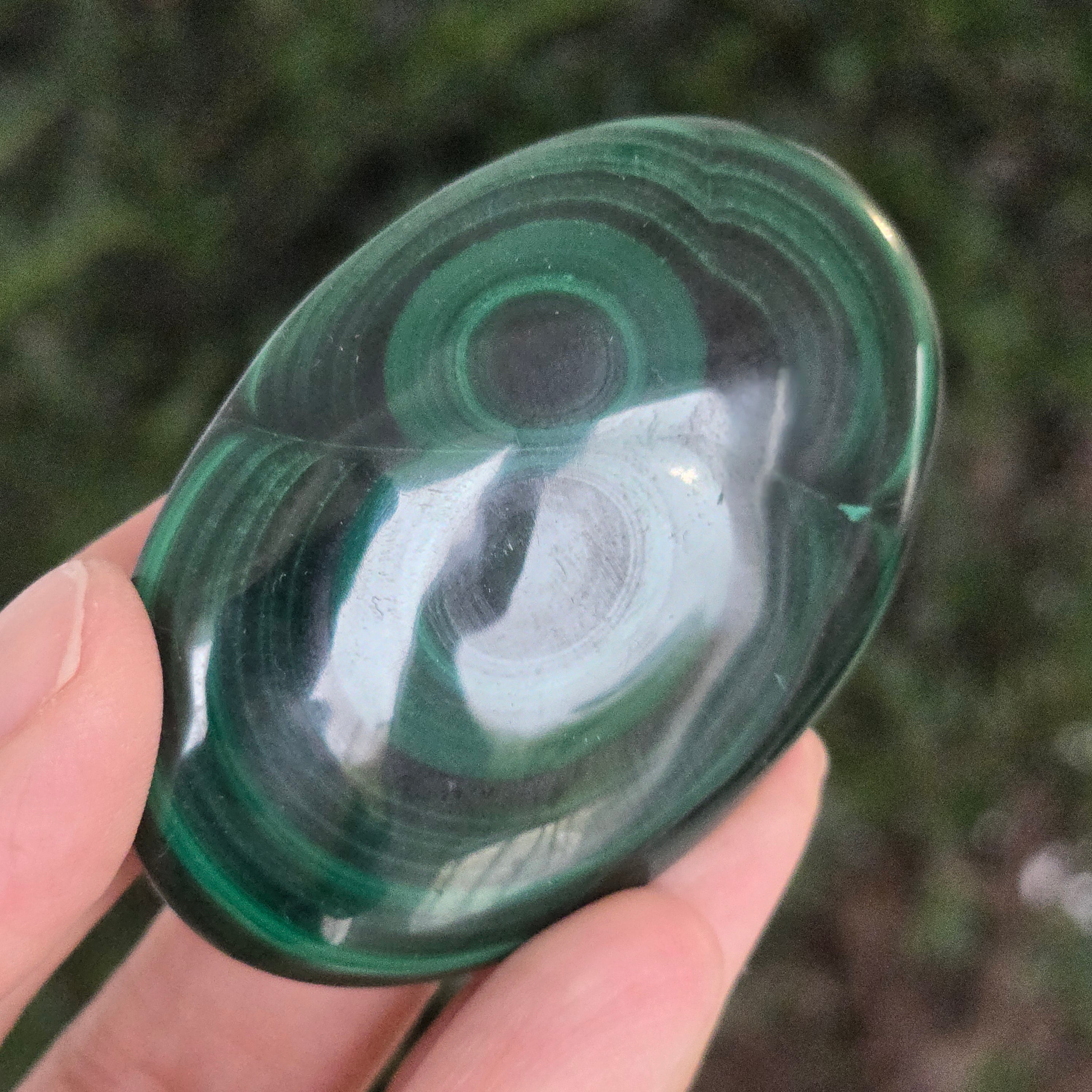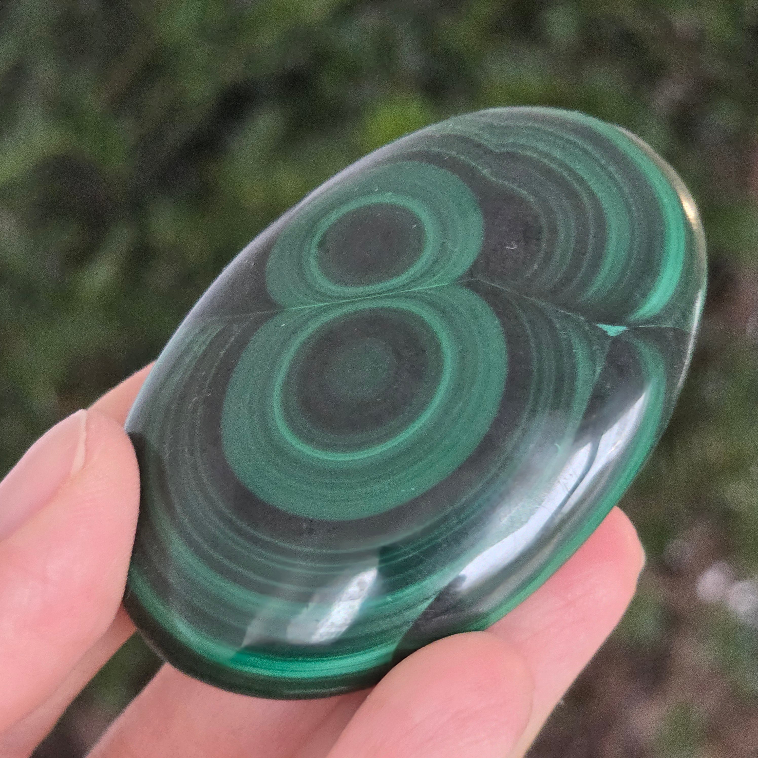 Палмстоун, който сякаш диша с енергията на живата Земя. Този уникален парче от естествен малакитразкрива хипнотизиращи вълни от интензивно зелено и изумрудено, пресечени с пръстени и концентрични ивици, като изваяни от самата природа. Гладката, перфектно полираната текстура кара камъка да лежи приятно в дланта, излъчвайки топла и защитна вибрация.