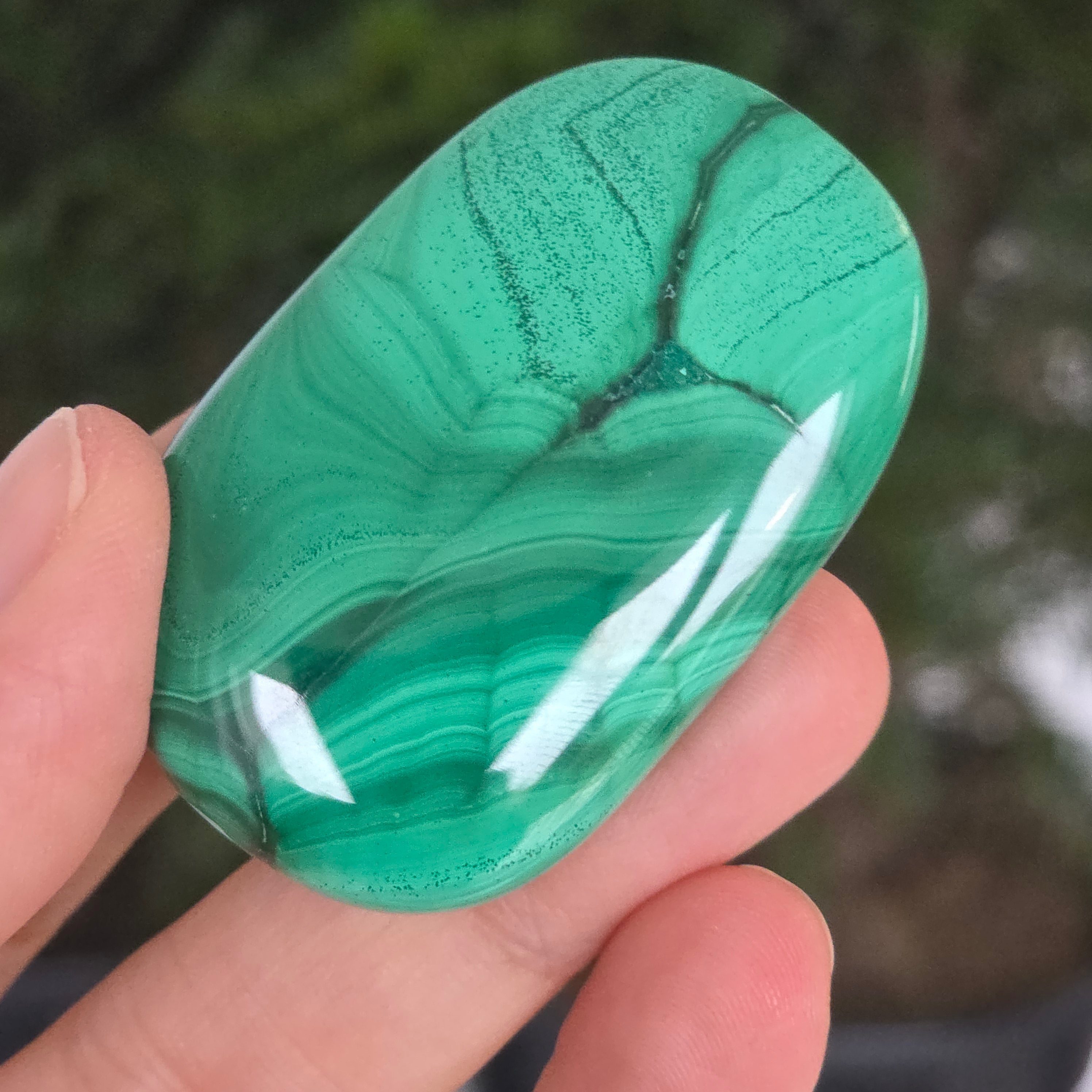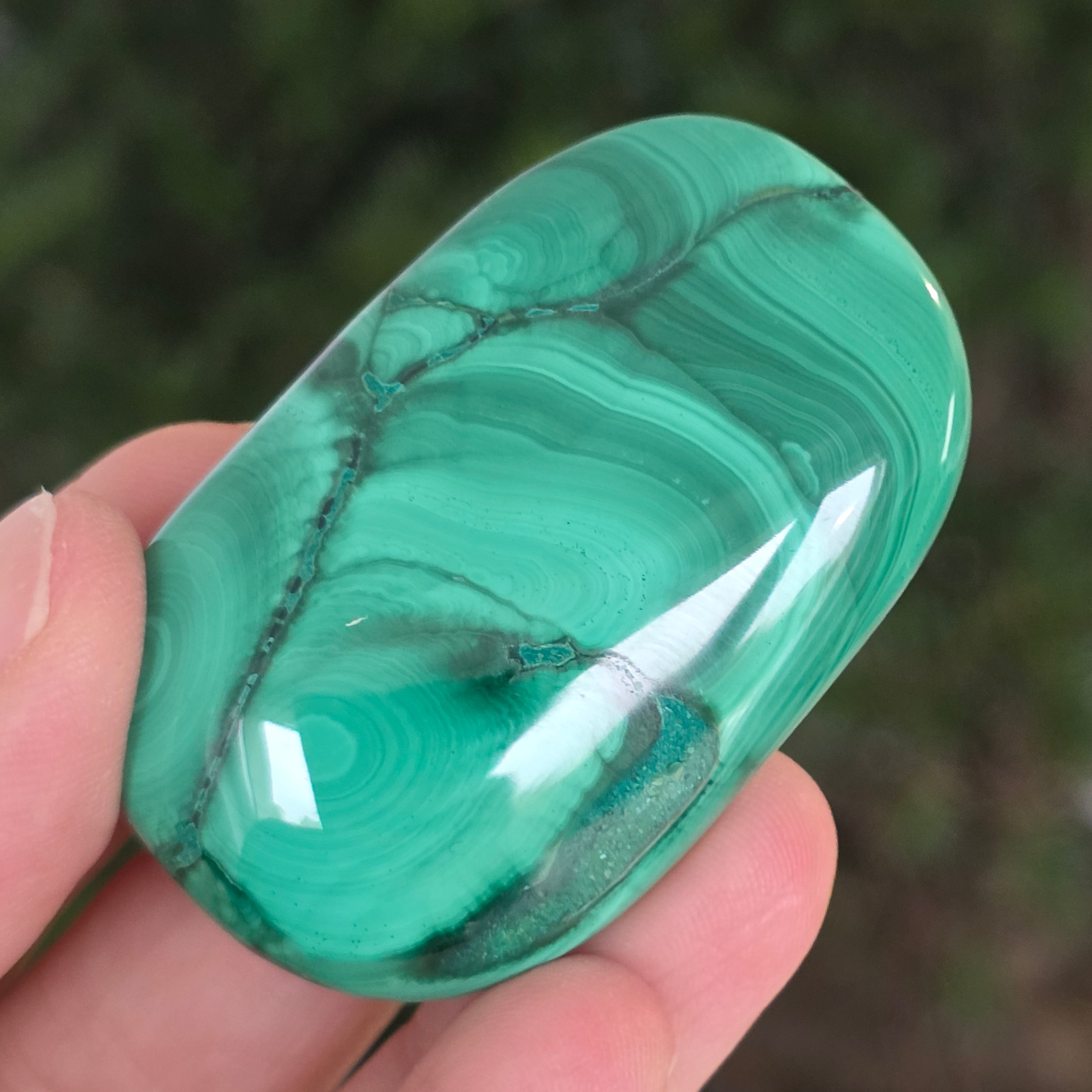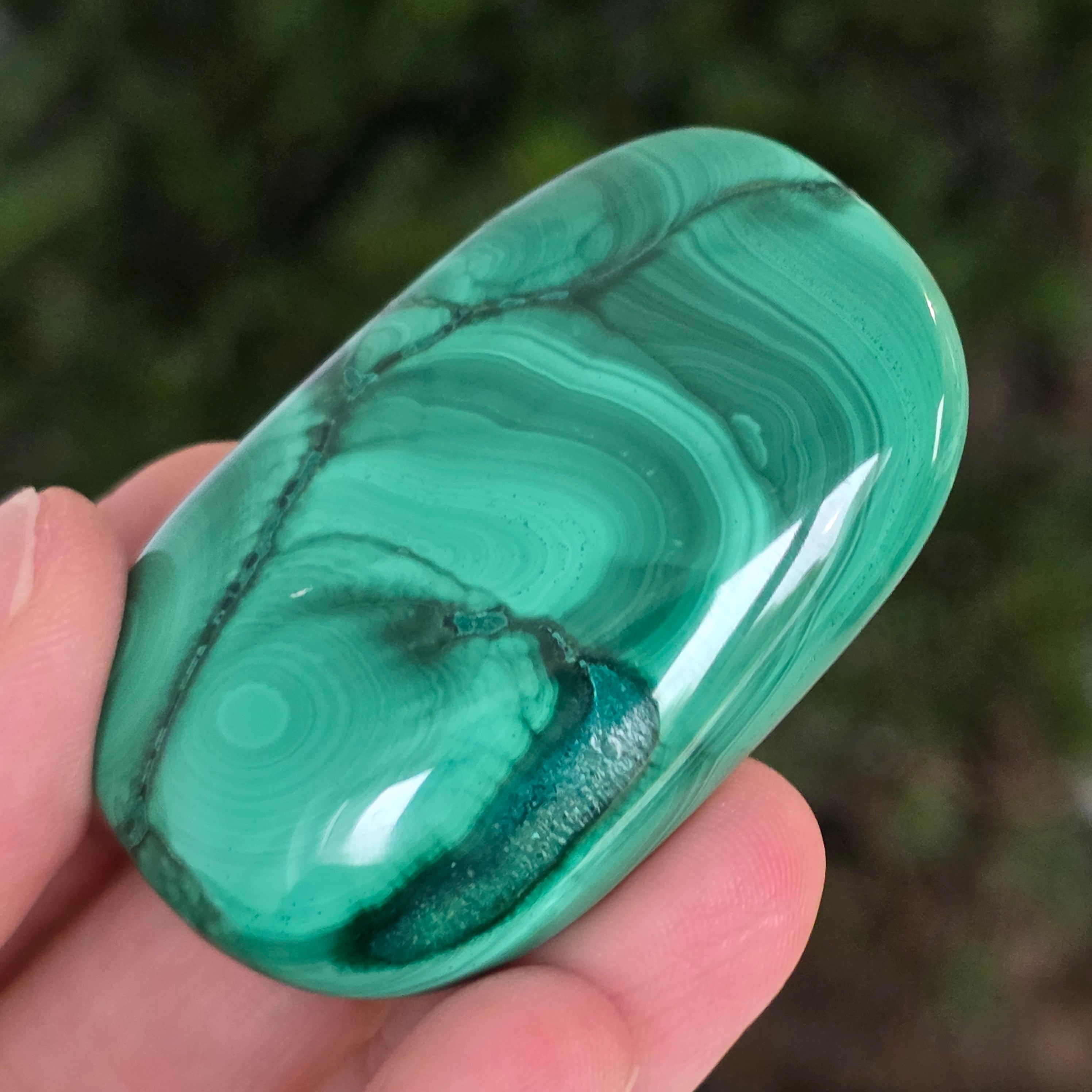 Палмстоун, който сякаш диша с енергията на живата Земя. Този уникален артикул от естествен малакитразкрива хипнотизиращи вълни от интензивно зелено и смарагд, пресечени от концентрични пръстени и ивици, сякаш изсечени от самата природа. Гладката, перфектно полираната текстура прави камъка приятен за държане в ръката, излъчвайки топла и защитна вибрация.