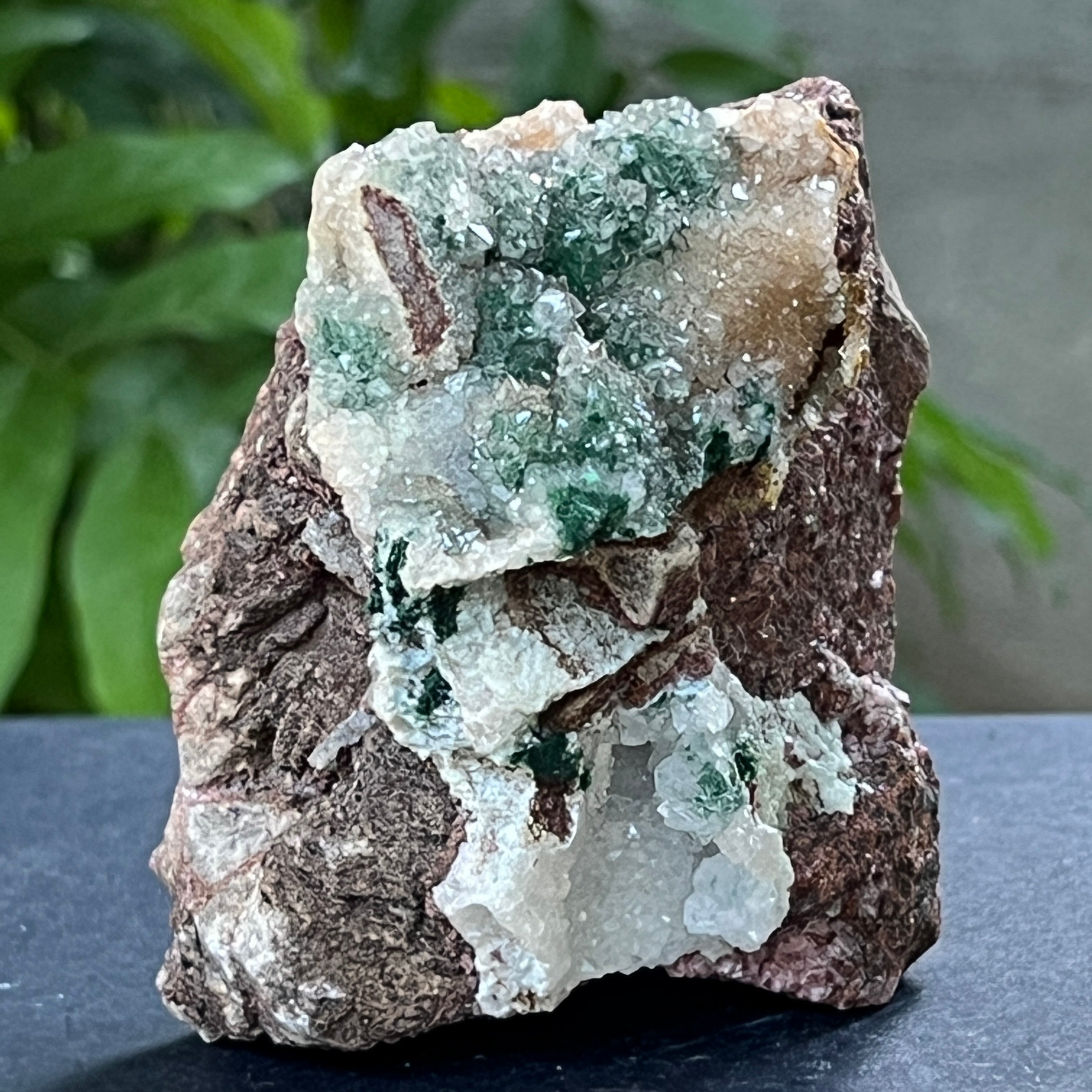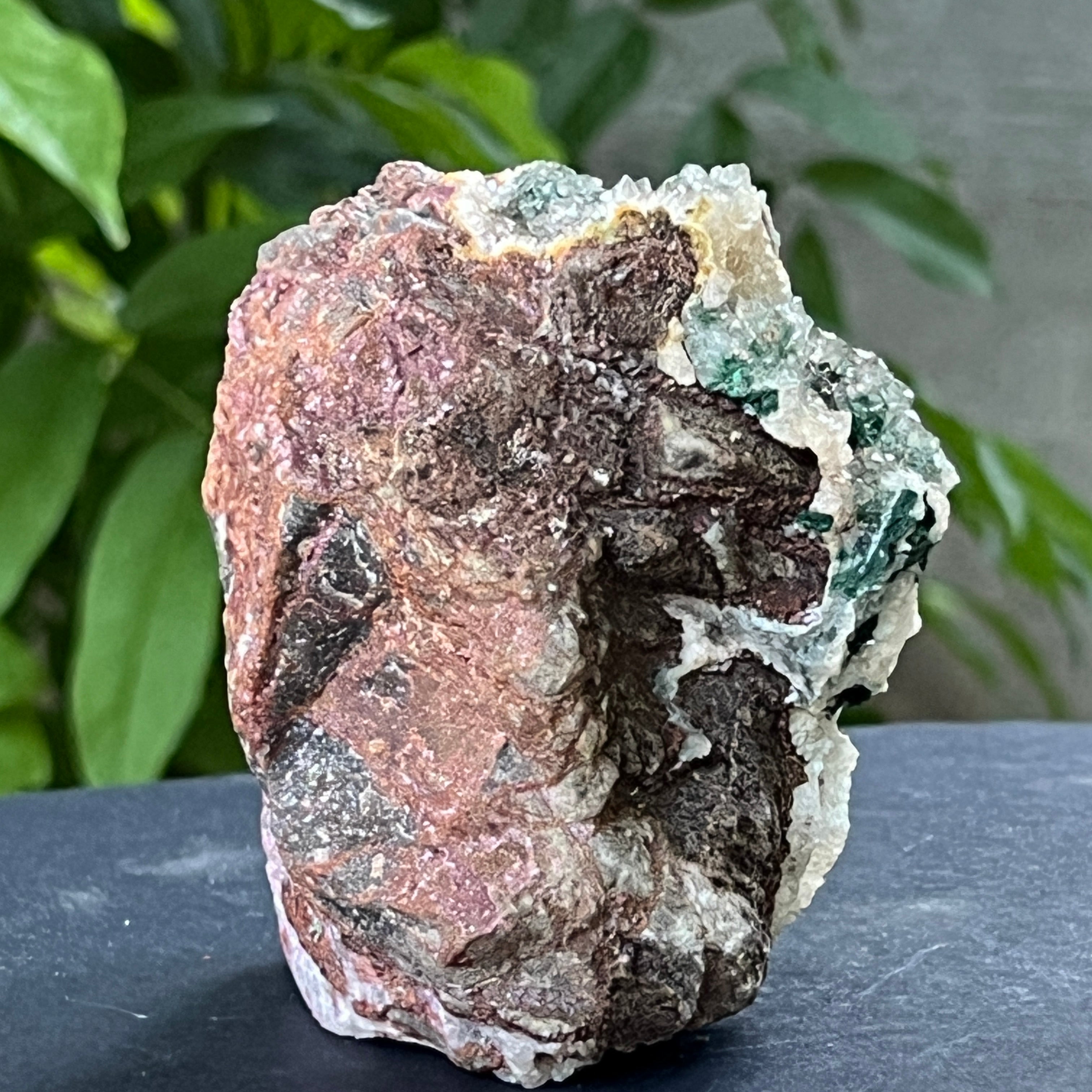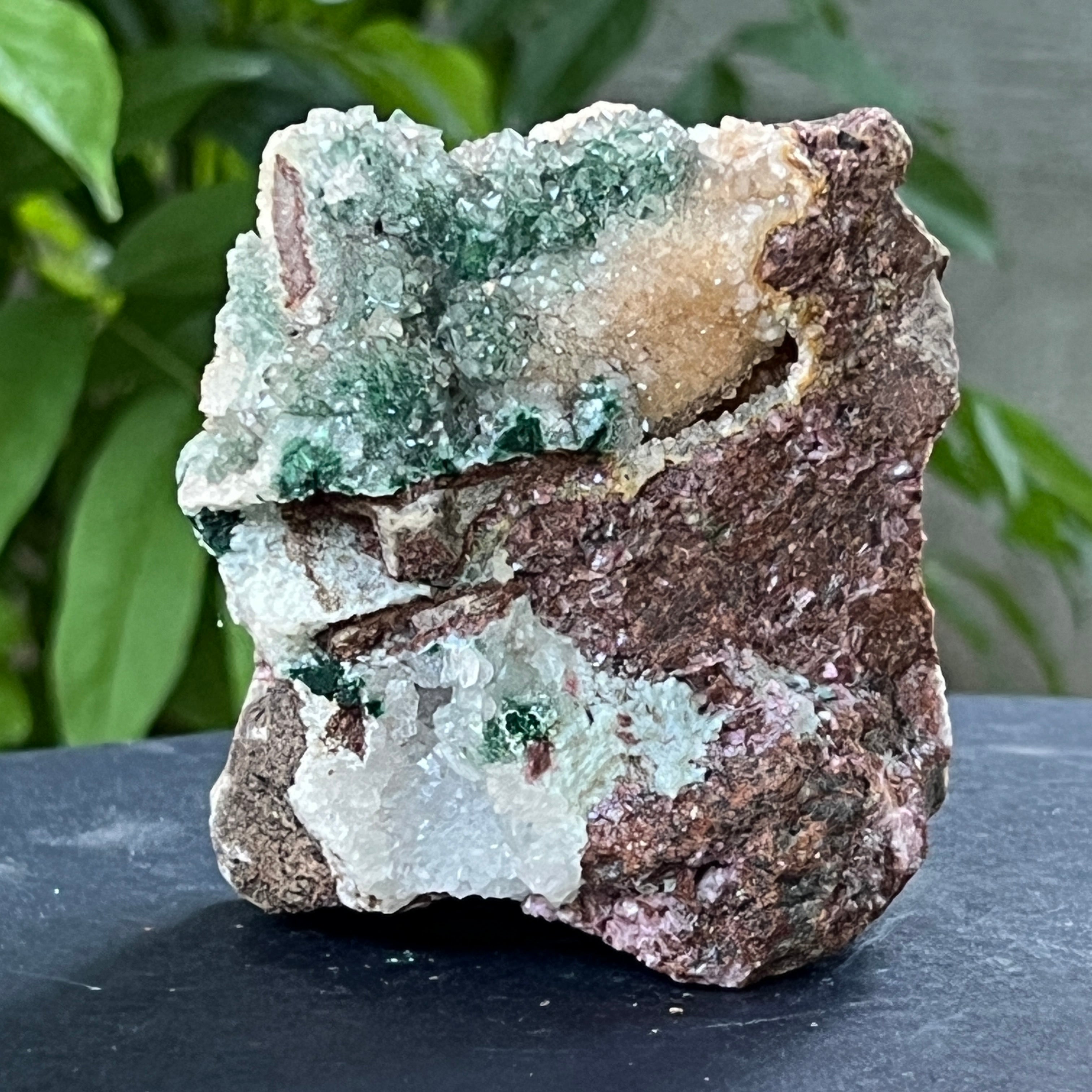 Редък фрагмент от естествена алхимия, където деликатната светлина на доломита се преплита с наситеното зелено на малахита, всички вкоренени в силна медна матрица. Този автентичен кластер носи в себе си бавната история на земята – среща между спокойствие, трансформация и жизнена сила.