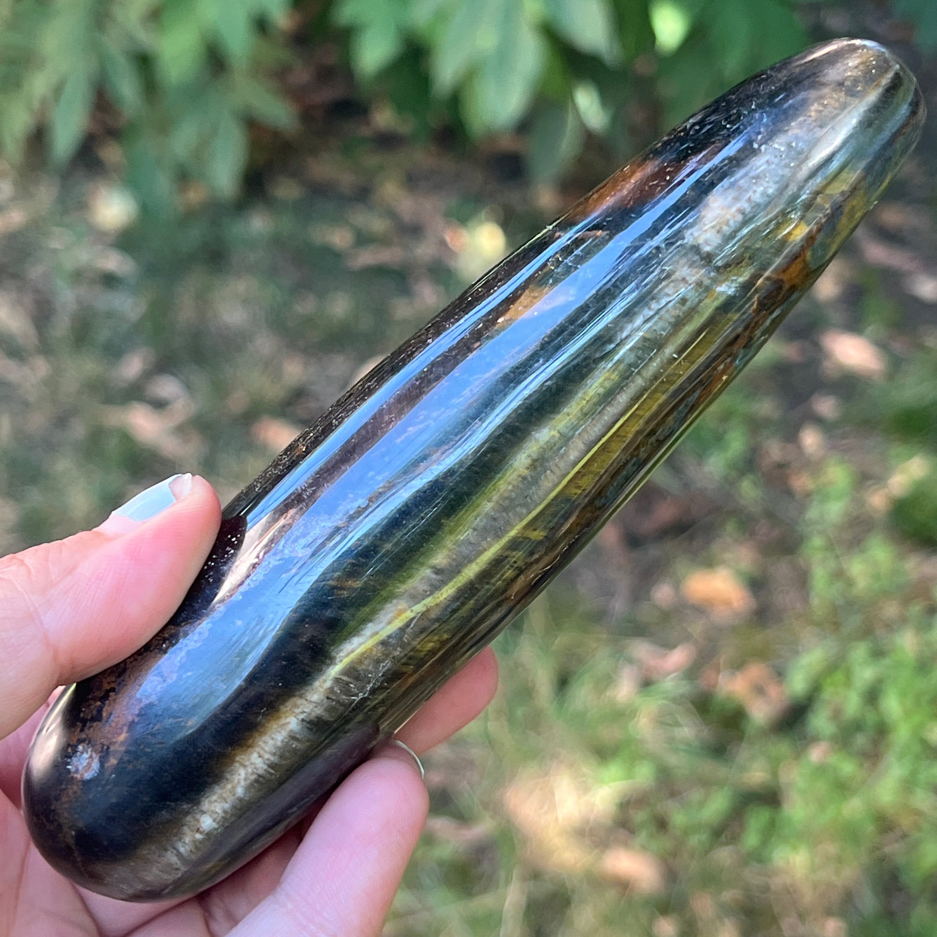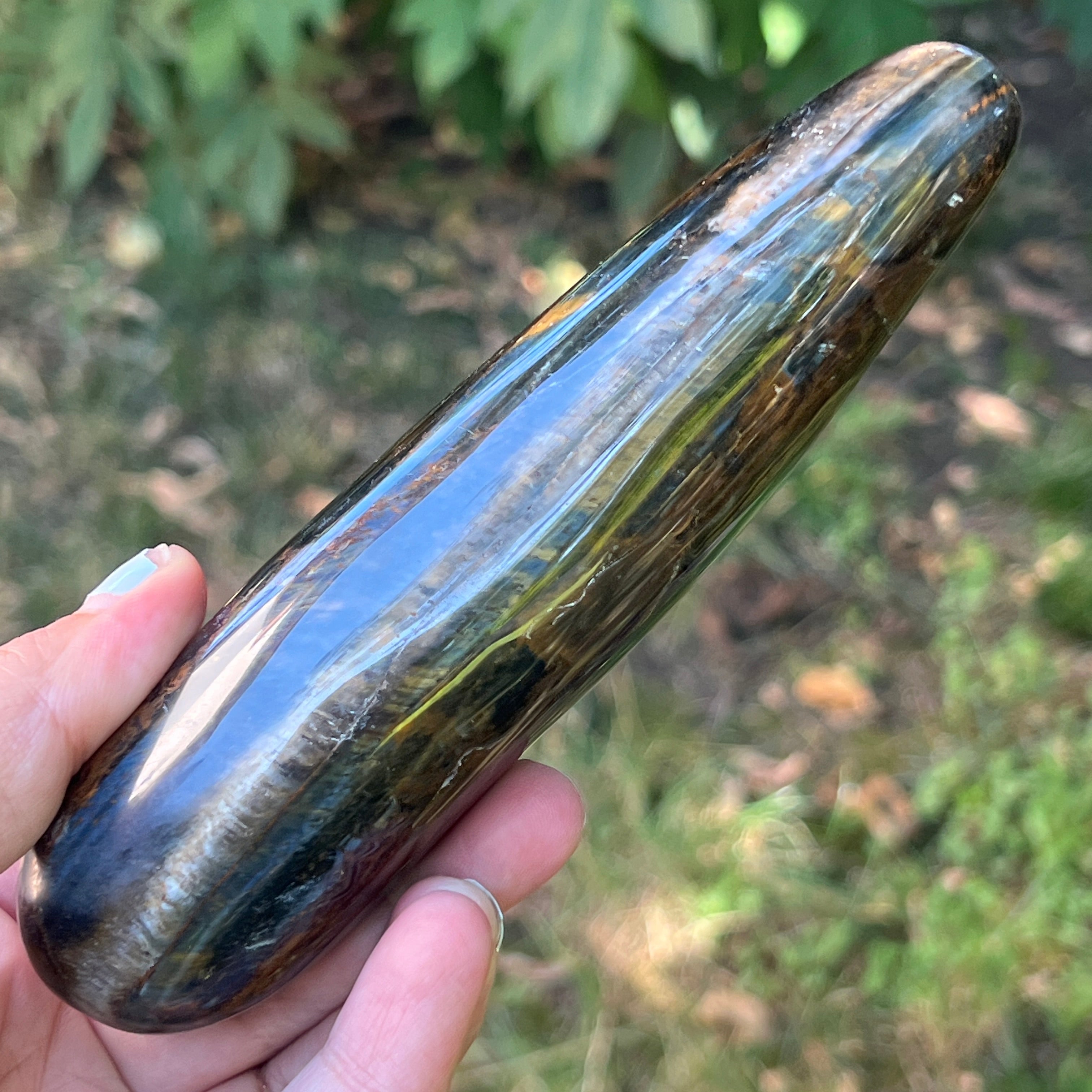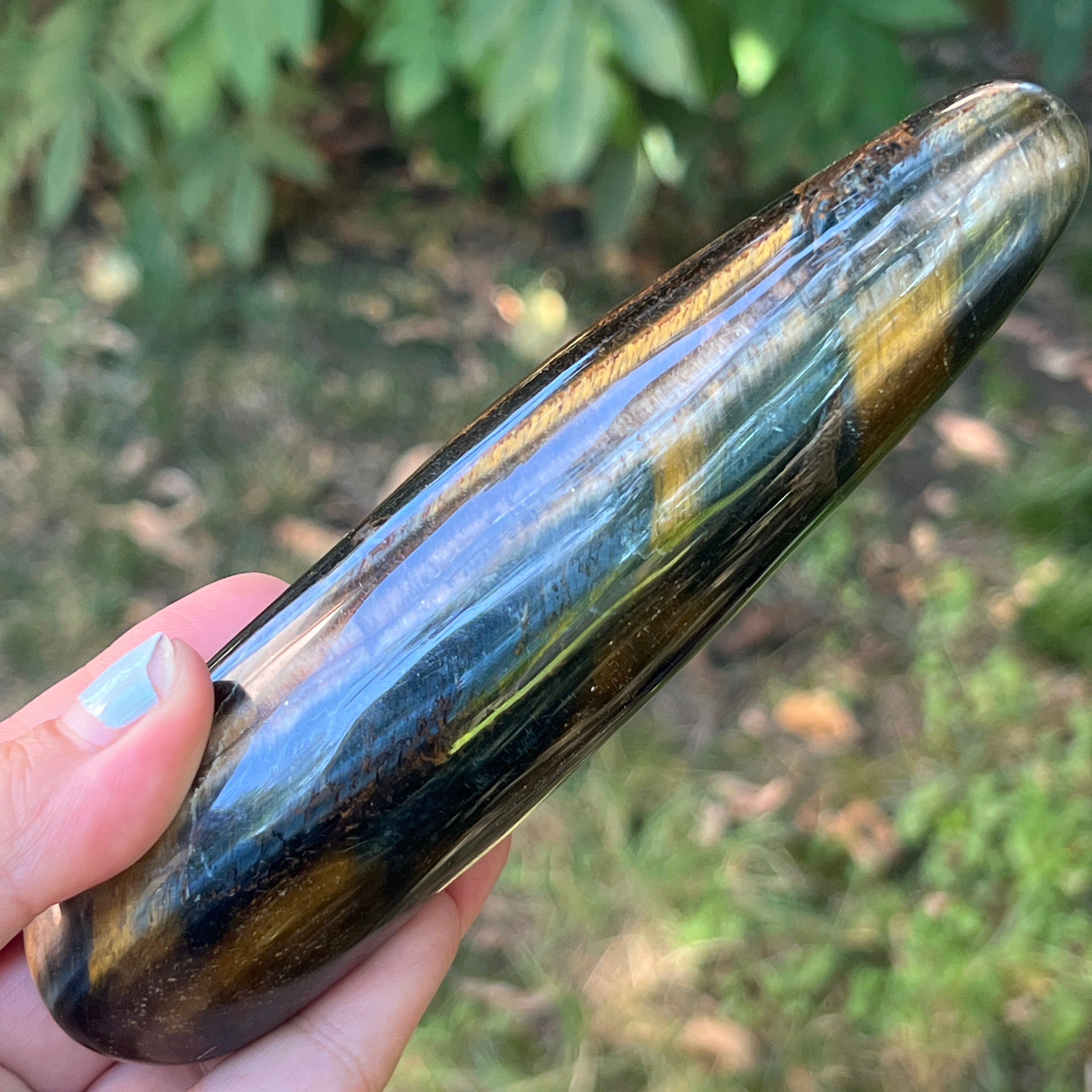 Тази масажна пръчица от тигрово око е уникален артикул, изсечен и полиран, за да канализира концентрираната енергия на Земята чрез ергономична форма, идеална за лечебни ритуали, енергиен масаж или дълбока релаксация.