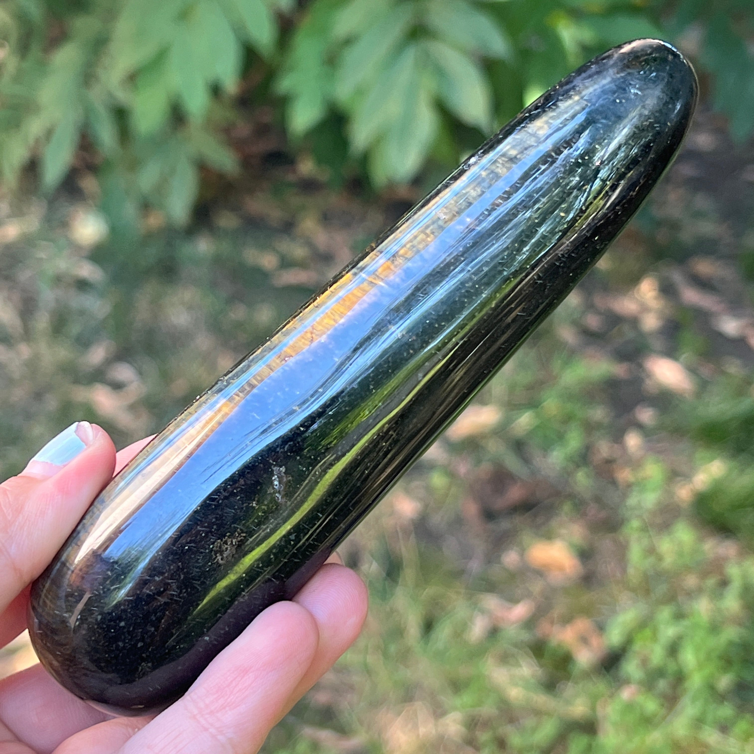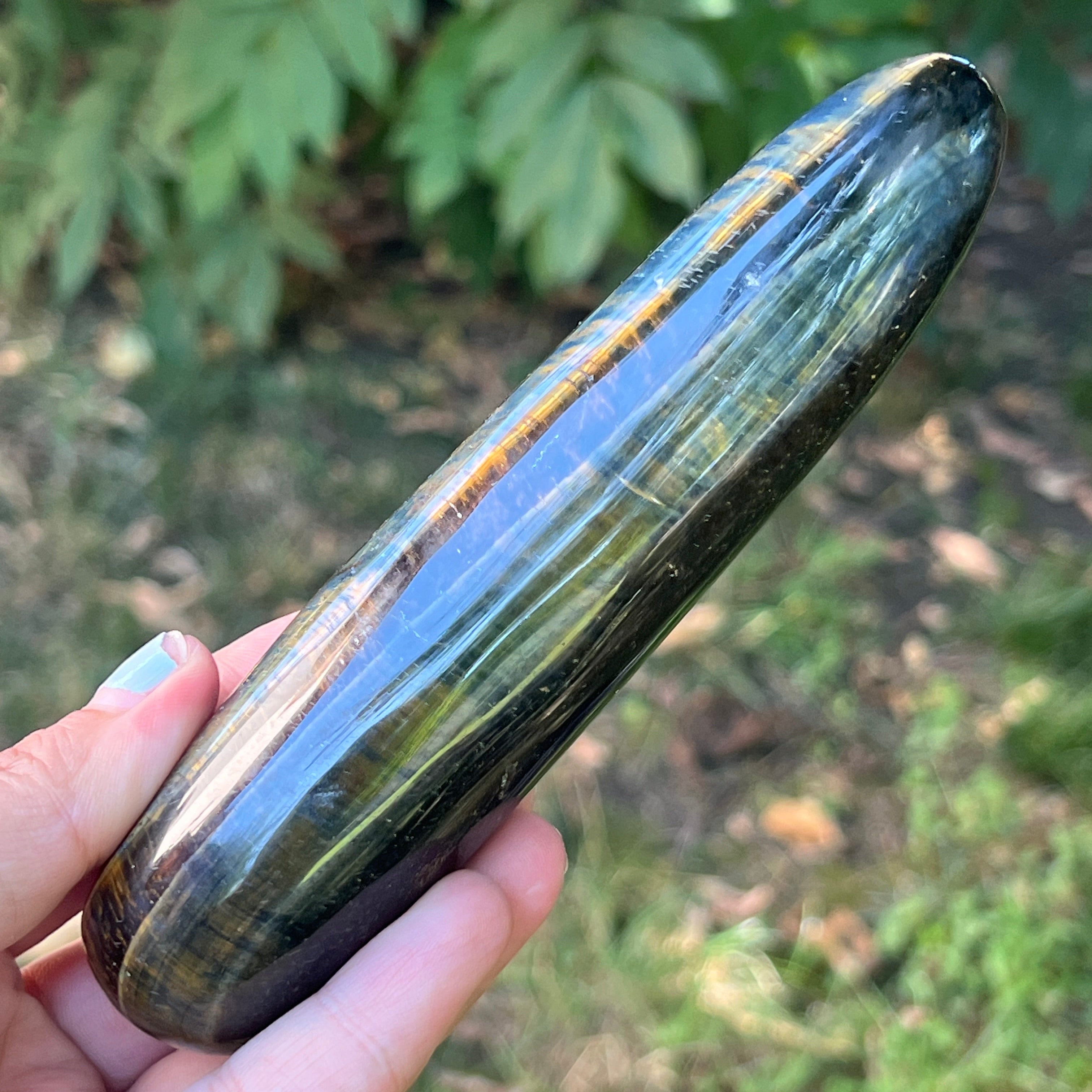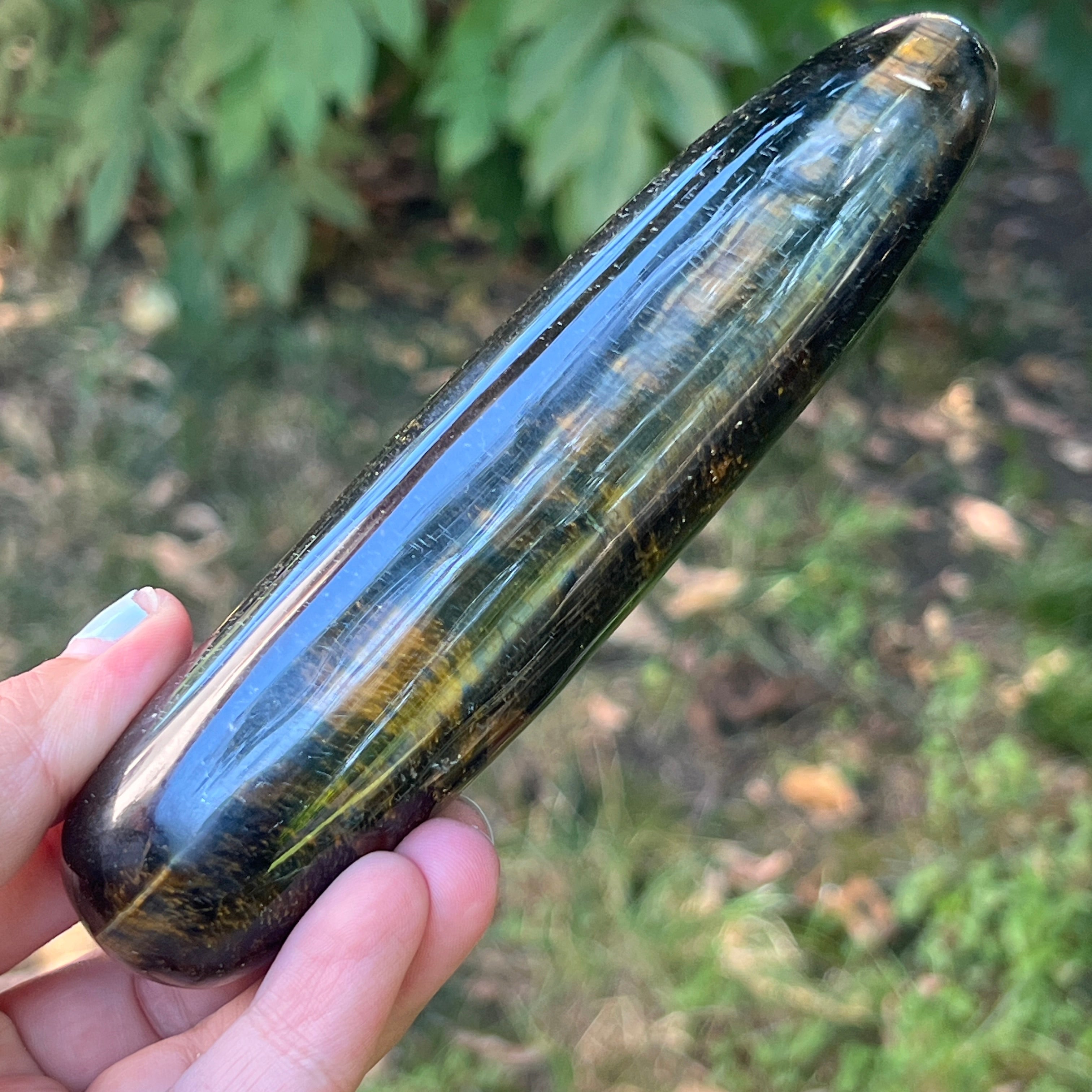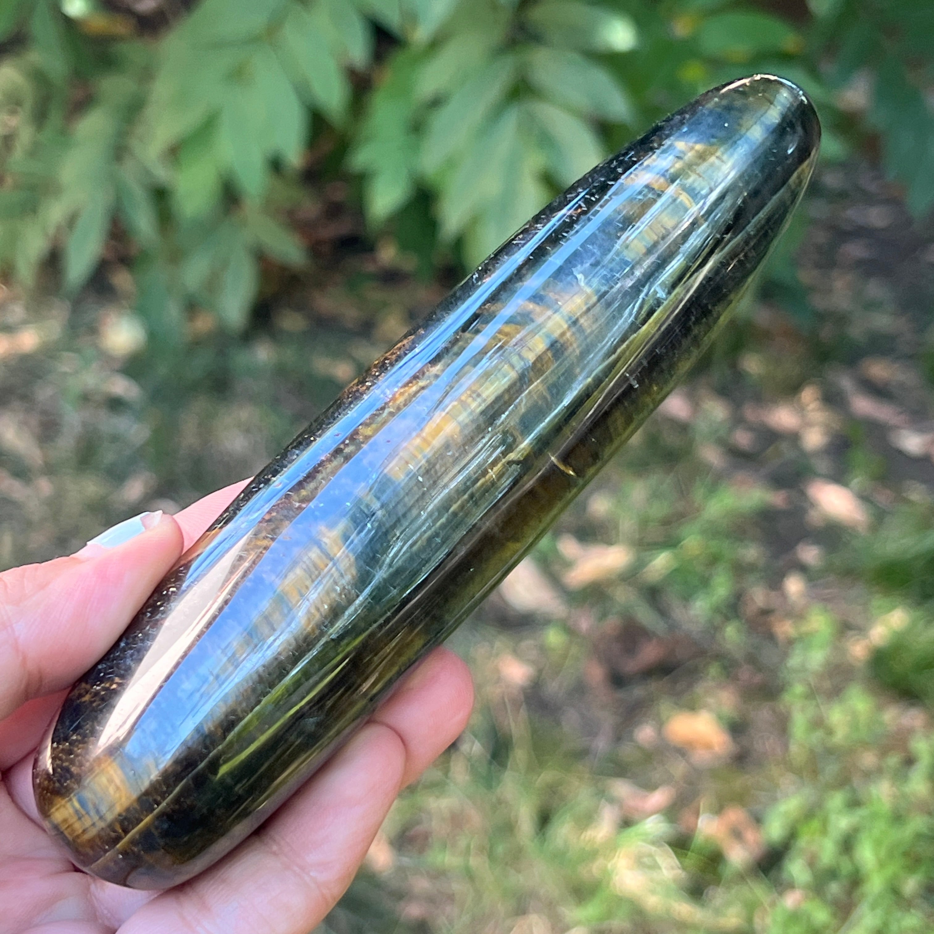Тази масажна пръчица от тигрово око е уникален артикул, изсечен и полиран, за да канализира концентрираната енергия на Земята чрез ергономична форма, идеална за лечебни ритуали, енергиен масаж или дълбока релаксация.