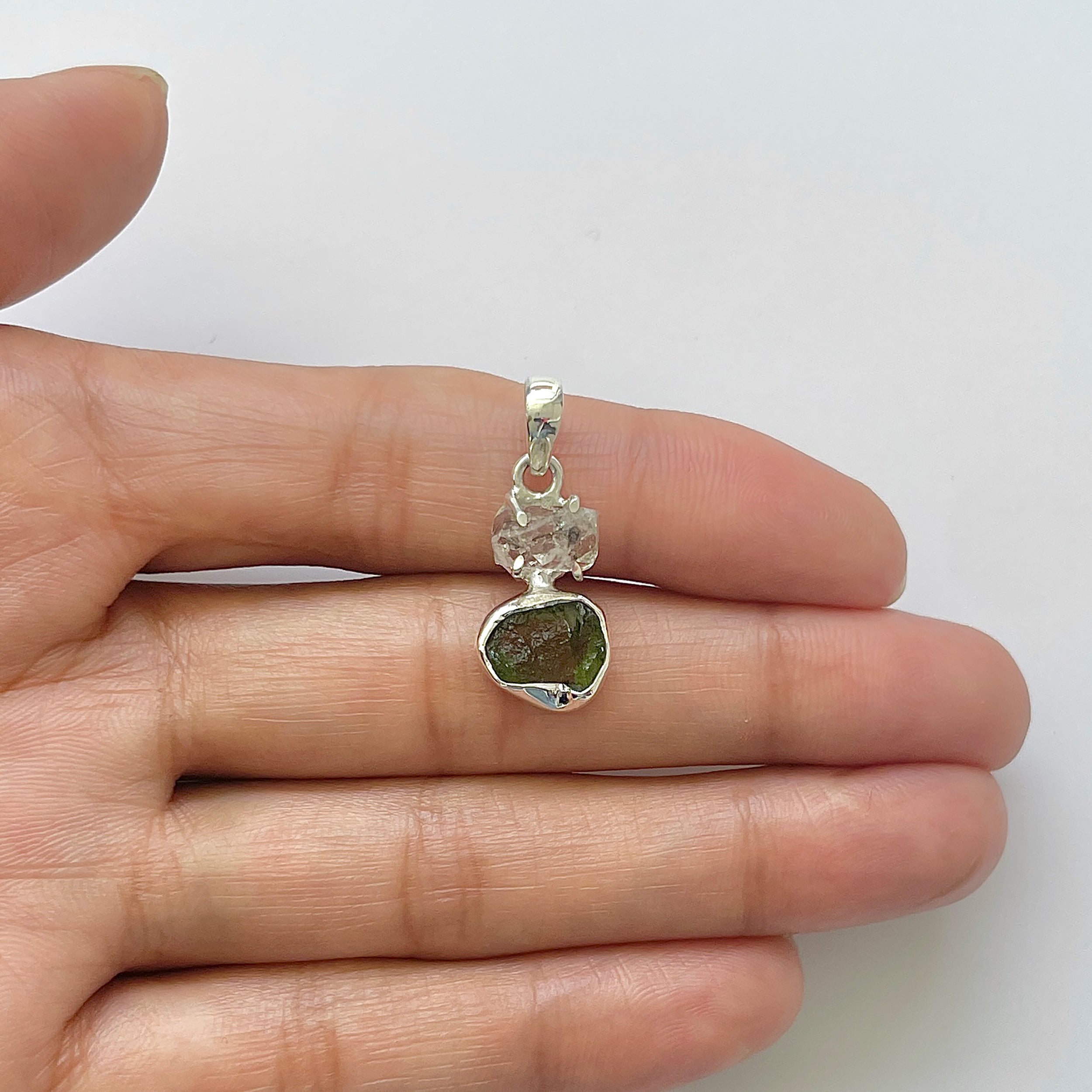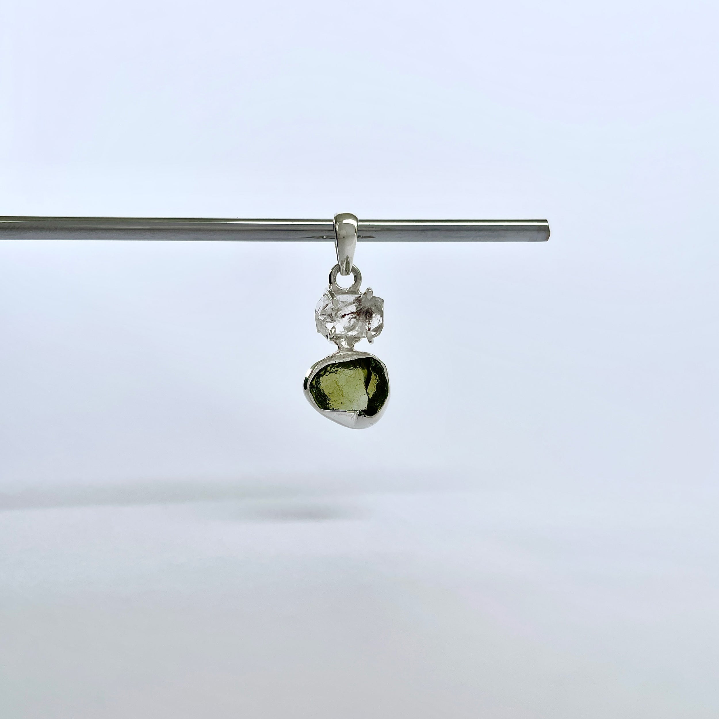 Медальон с изключителна енергия, съчетаващ два от най-мощните кристали, използвани в духовността и кристалотерапията: молдавита и Хъркимер кварца.