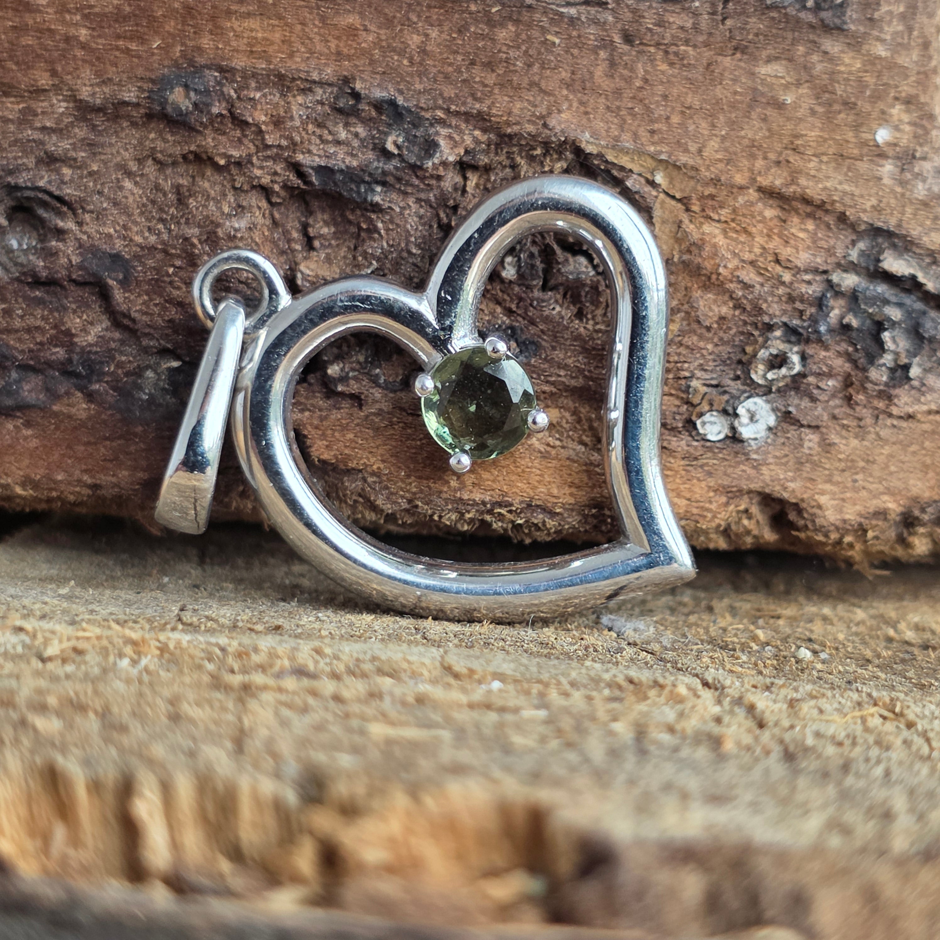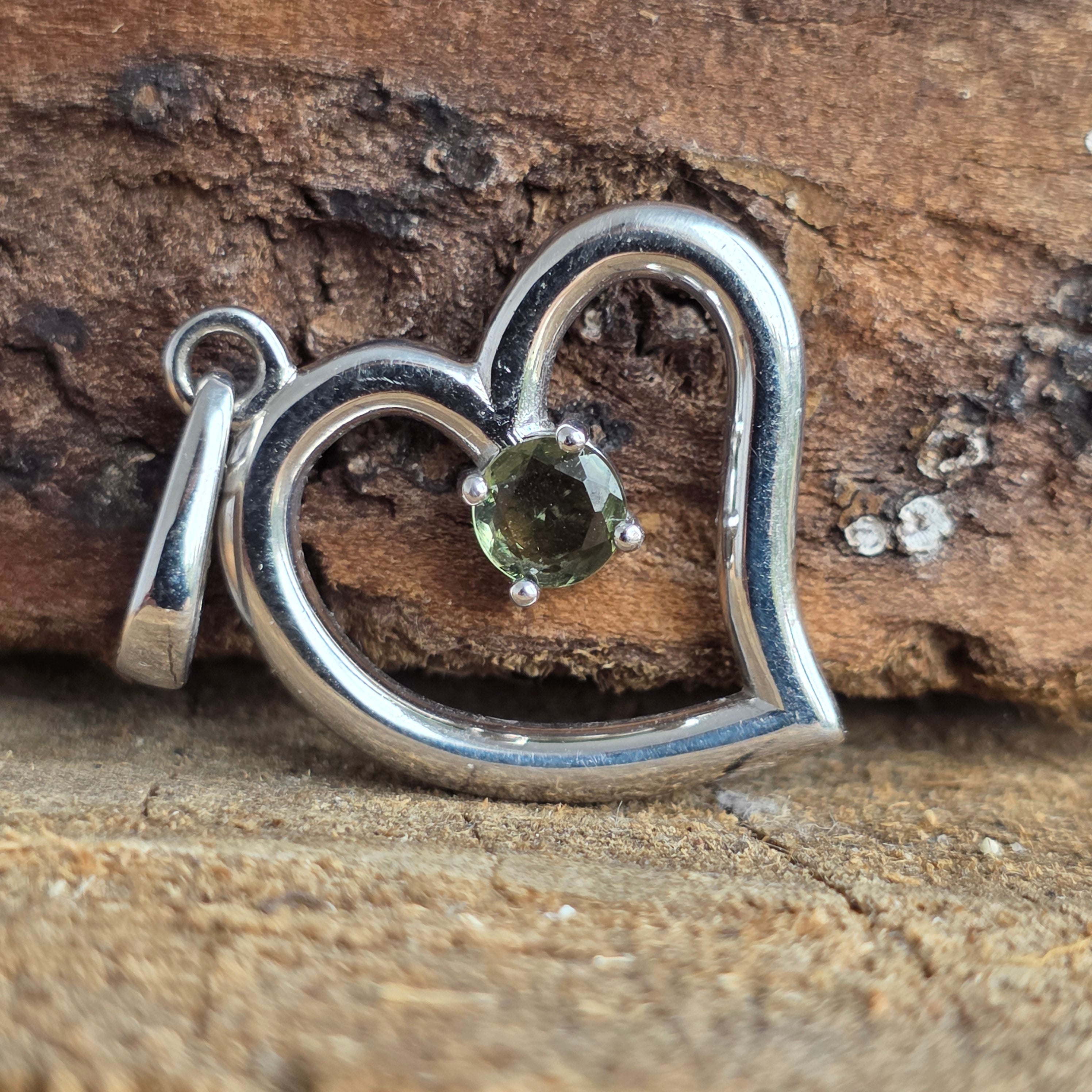 Молдавитът се счита за камък на трансформацията и космическата свързаност, формиран след удар от метеорит преди милиони години. В комбинация с формата на сърце, тази висулка се превръща в символ на любовта, откритостта и лечебната енергия.