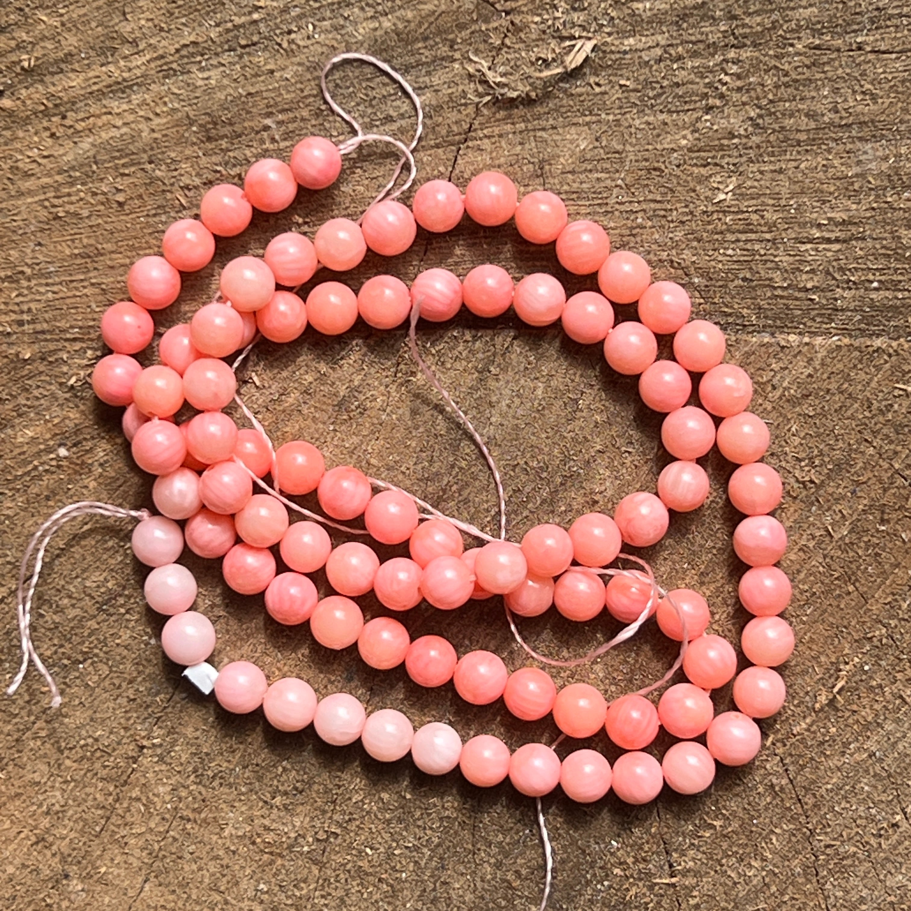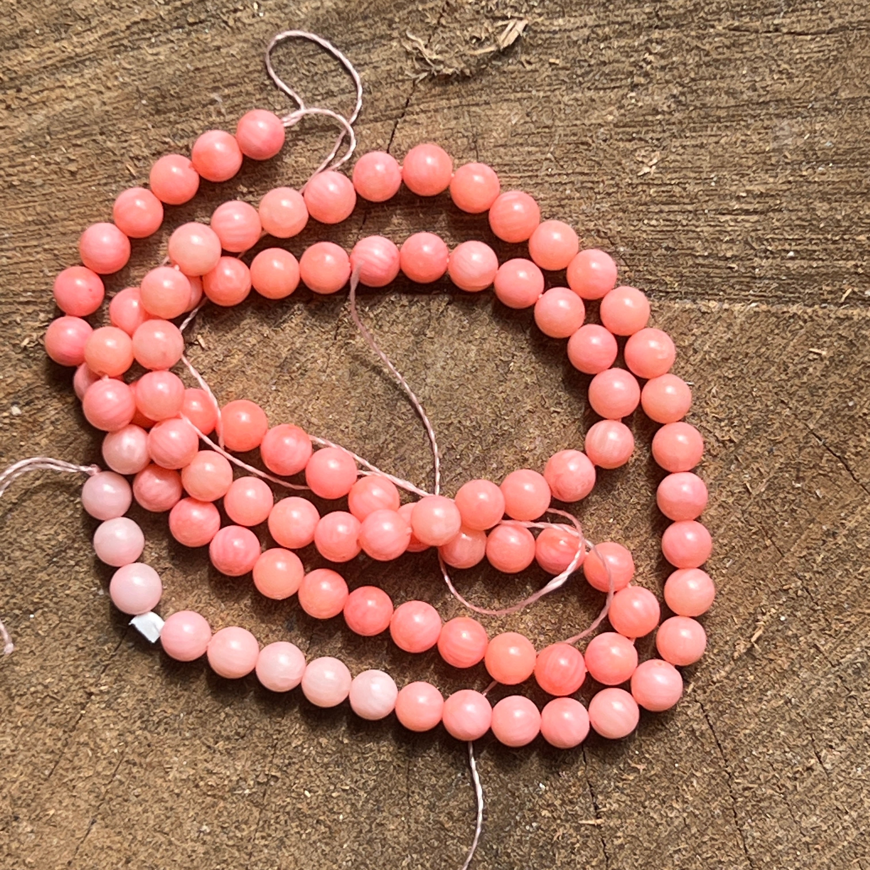 Наниз от КОРАЛ, РОЗОВ съставен от естествени сферични мъниста, идеален за колиета, гривни или други ръчно изработени бижута.