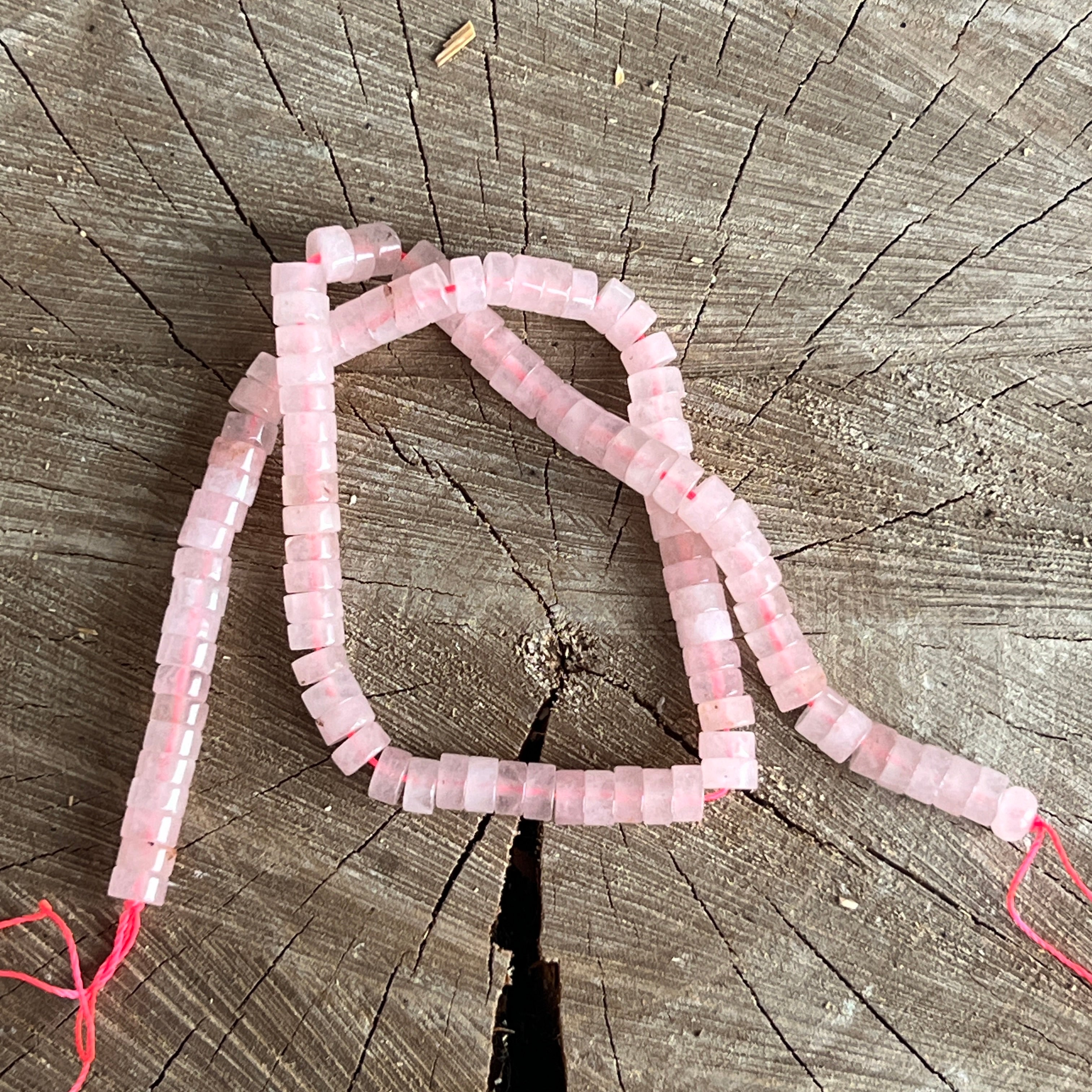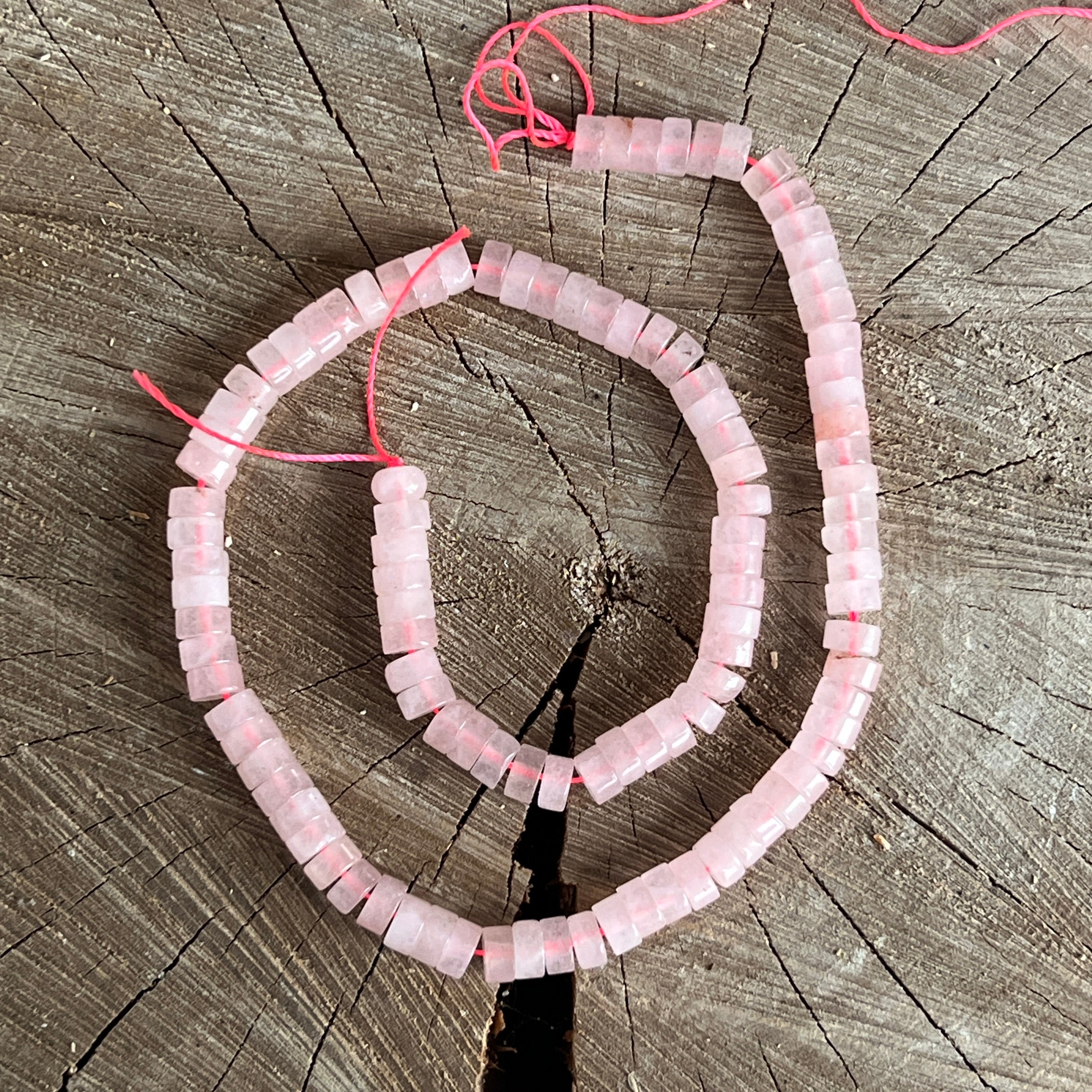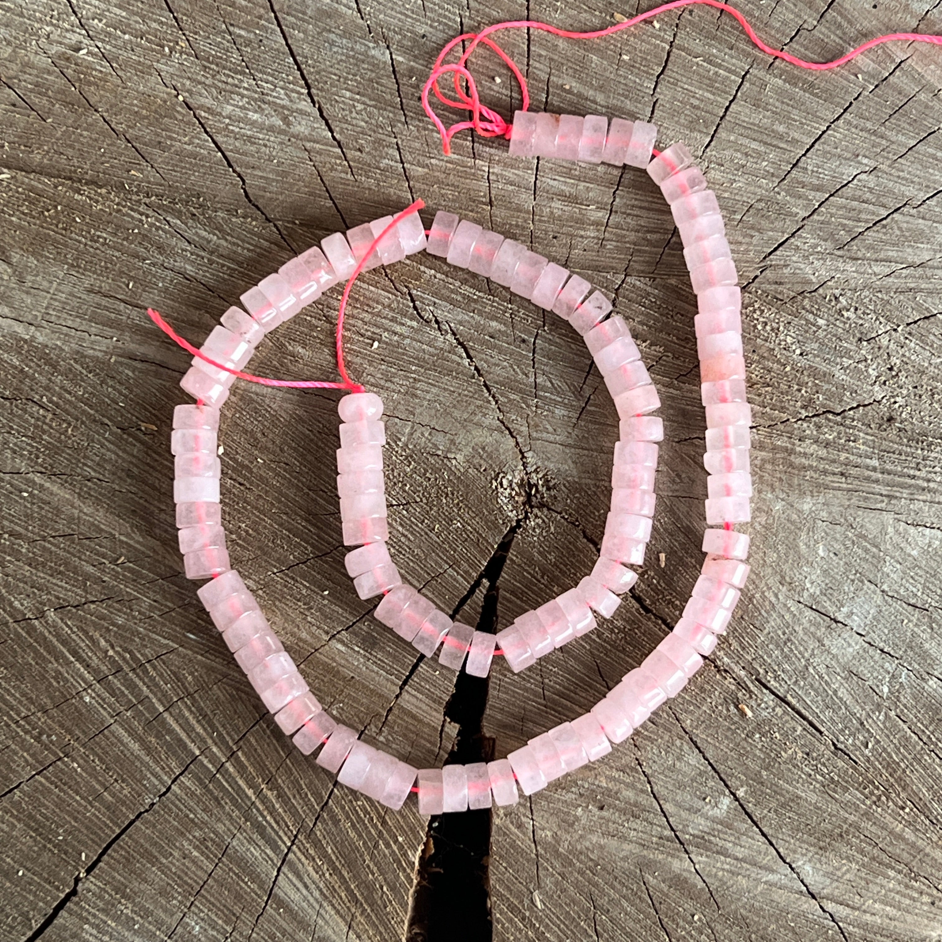 Наниз от дискове от розов кварц, съставен от дискове естествено, идеален за колиета, гривни или други ръчно изработени бижута.