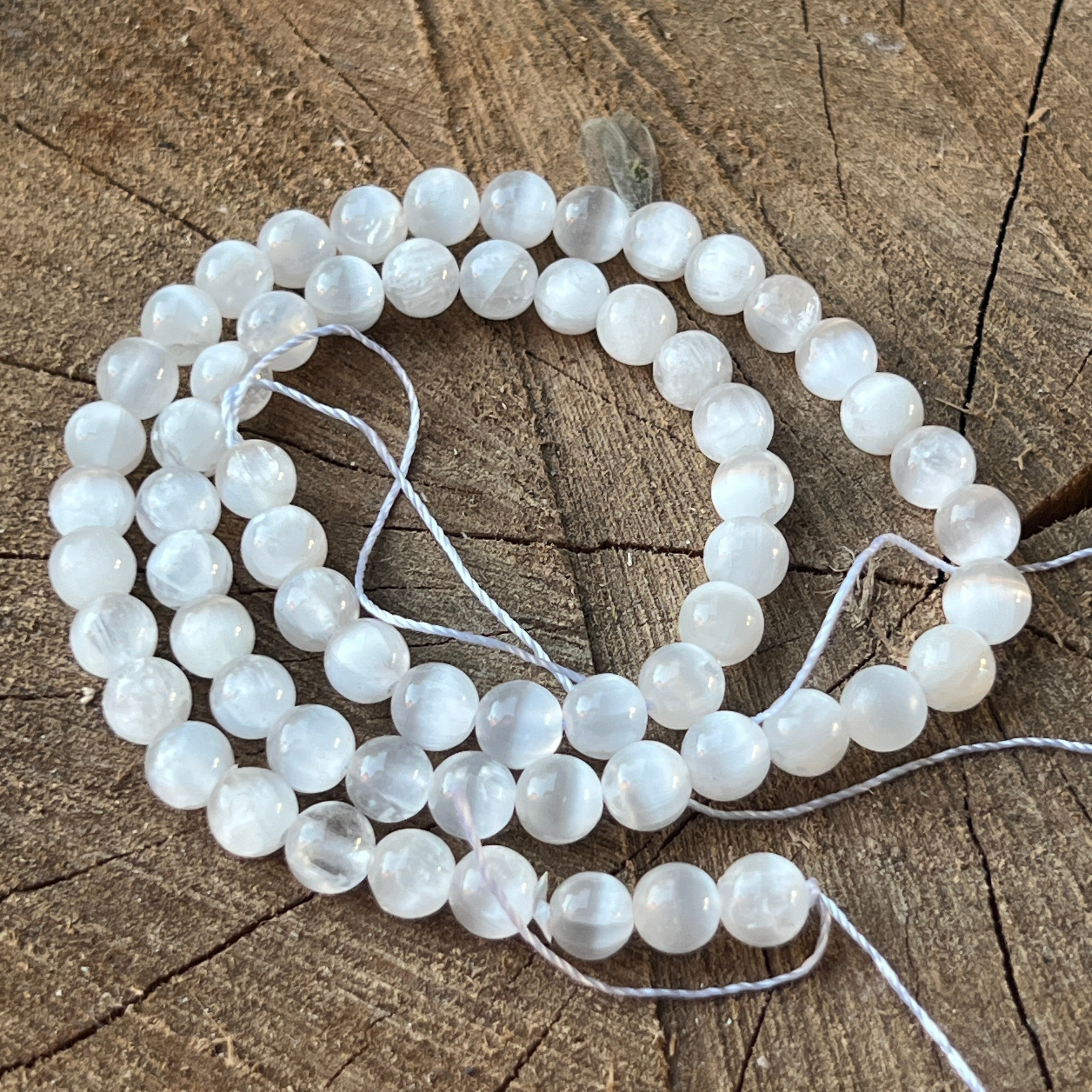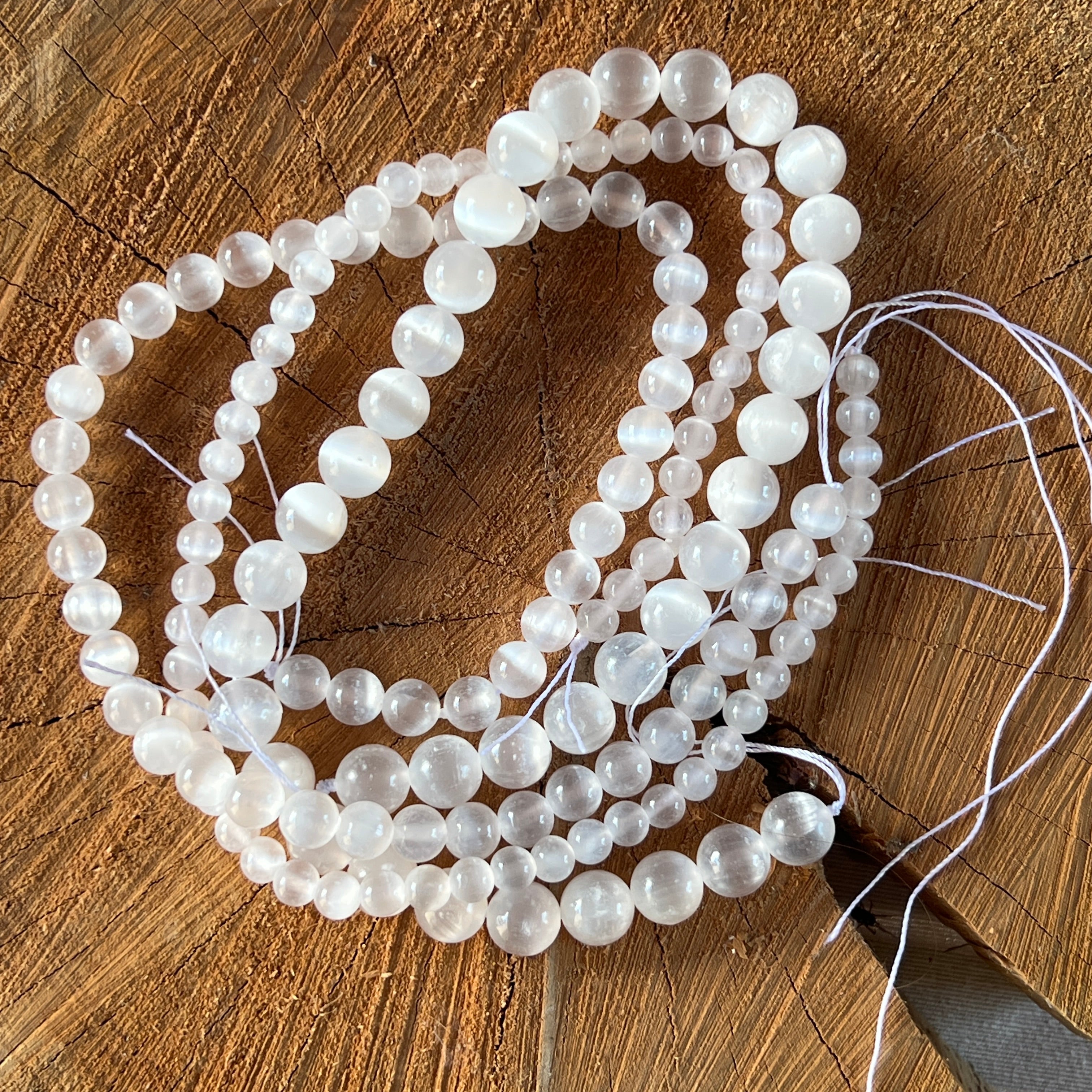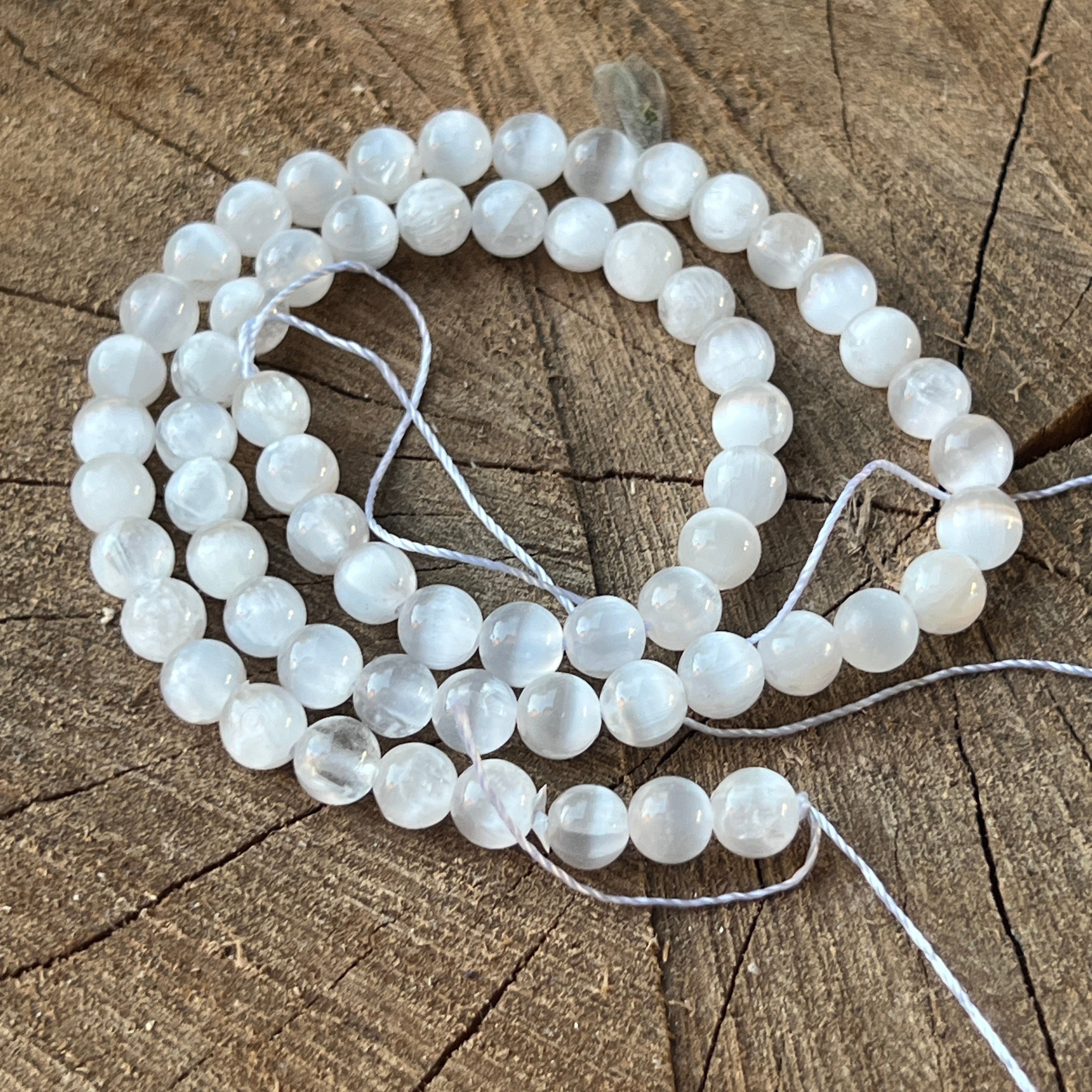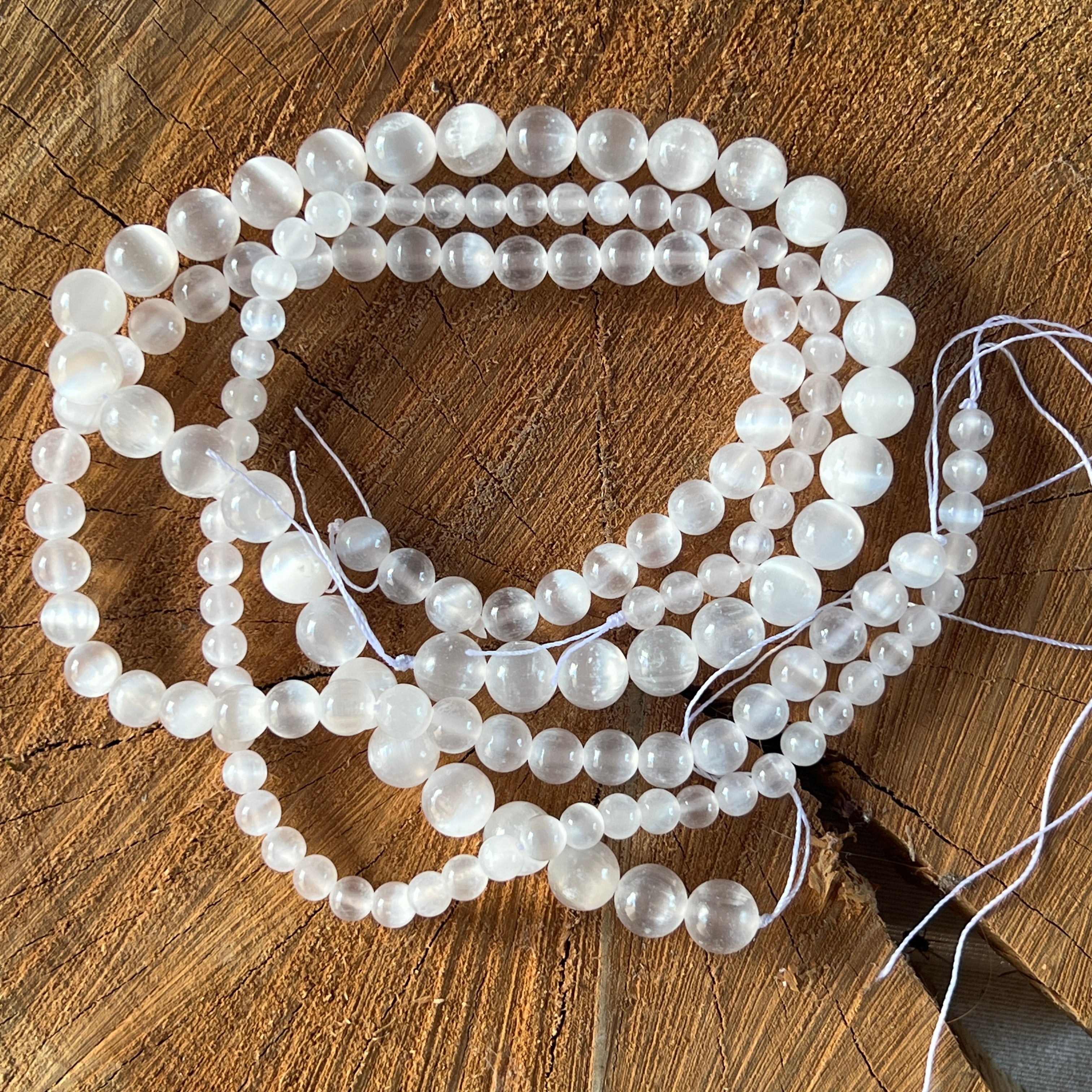 Наниз от СЕЛЕНИТ съставен от естествени топчета, перфектен за колиета, гривни или други ръчно изработени бижута.