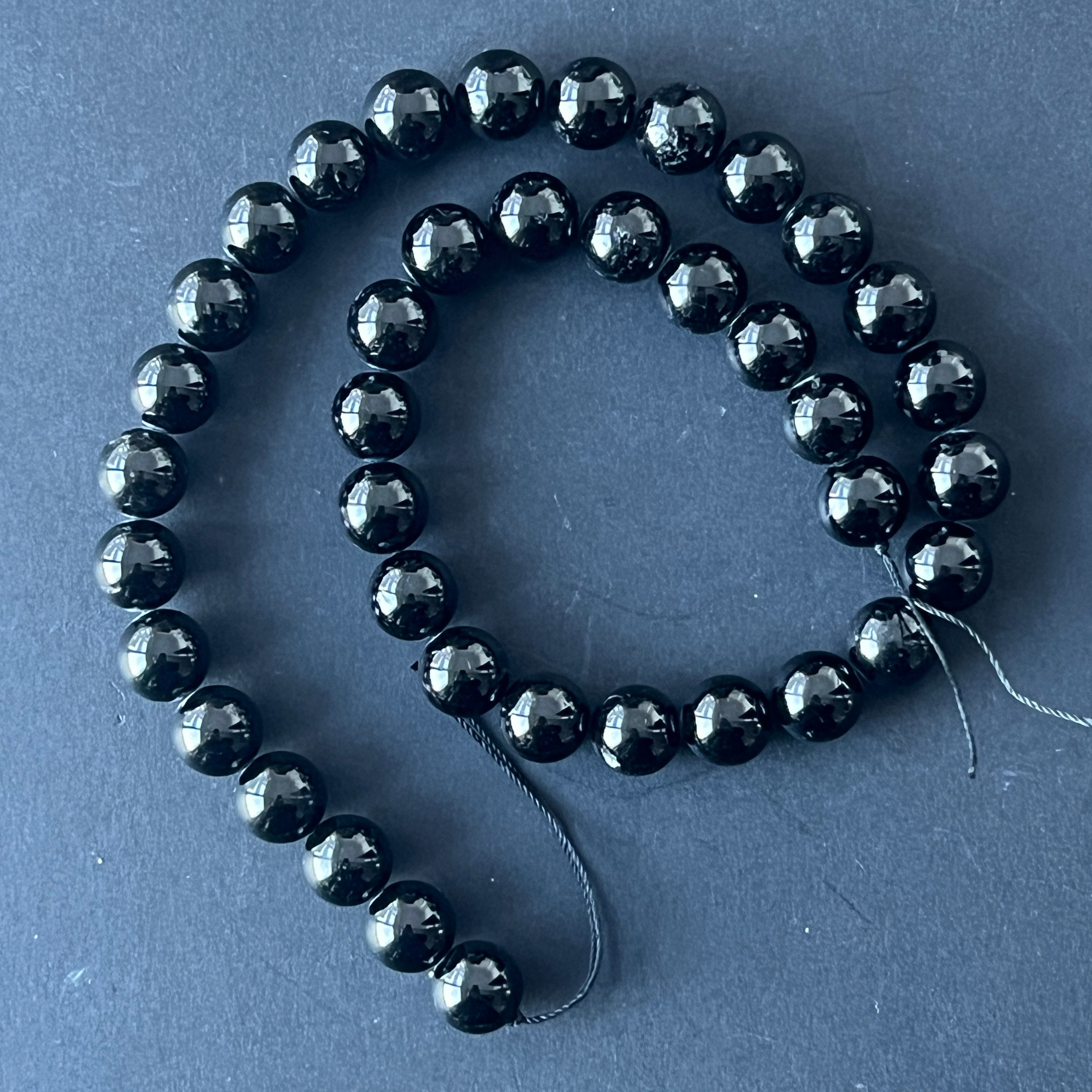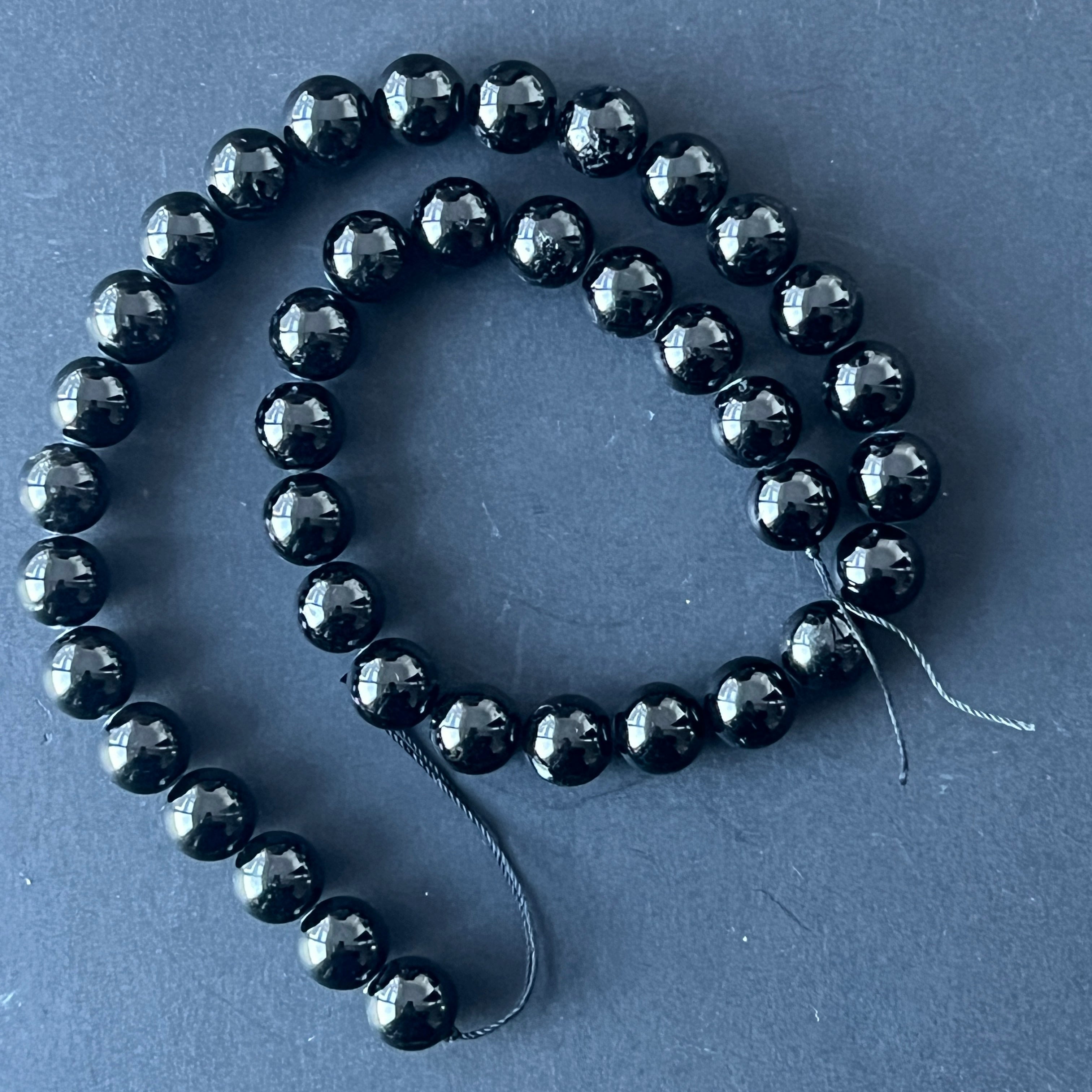 Низът на Черен турмалин natural е изискан избор за тези, които създават бижута със защитна енергия и подчертана елегантност. Всяка 10-милиметрова сфера е ръчно полирана, за да разкрие дълбокия блясък на камъка, нюанс на черно, който сякаш абсорбира светлина и отразява стабилността.