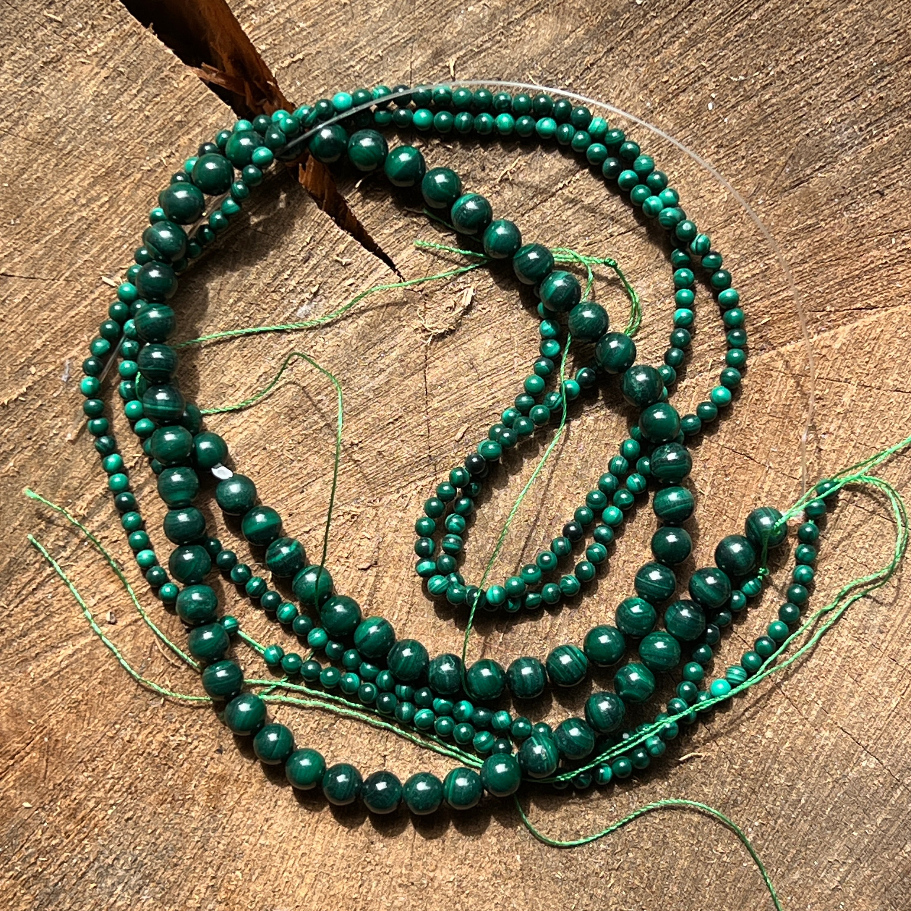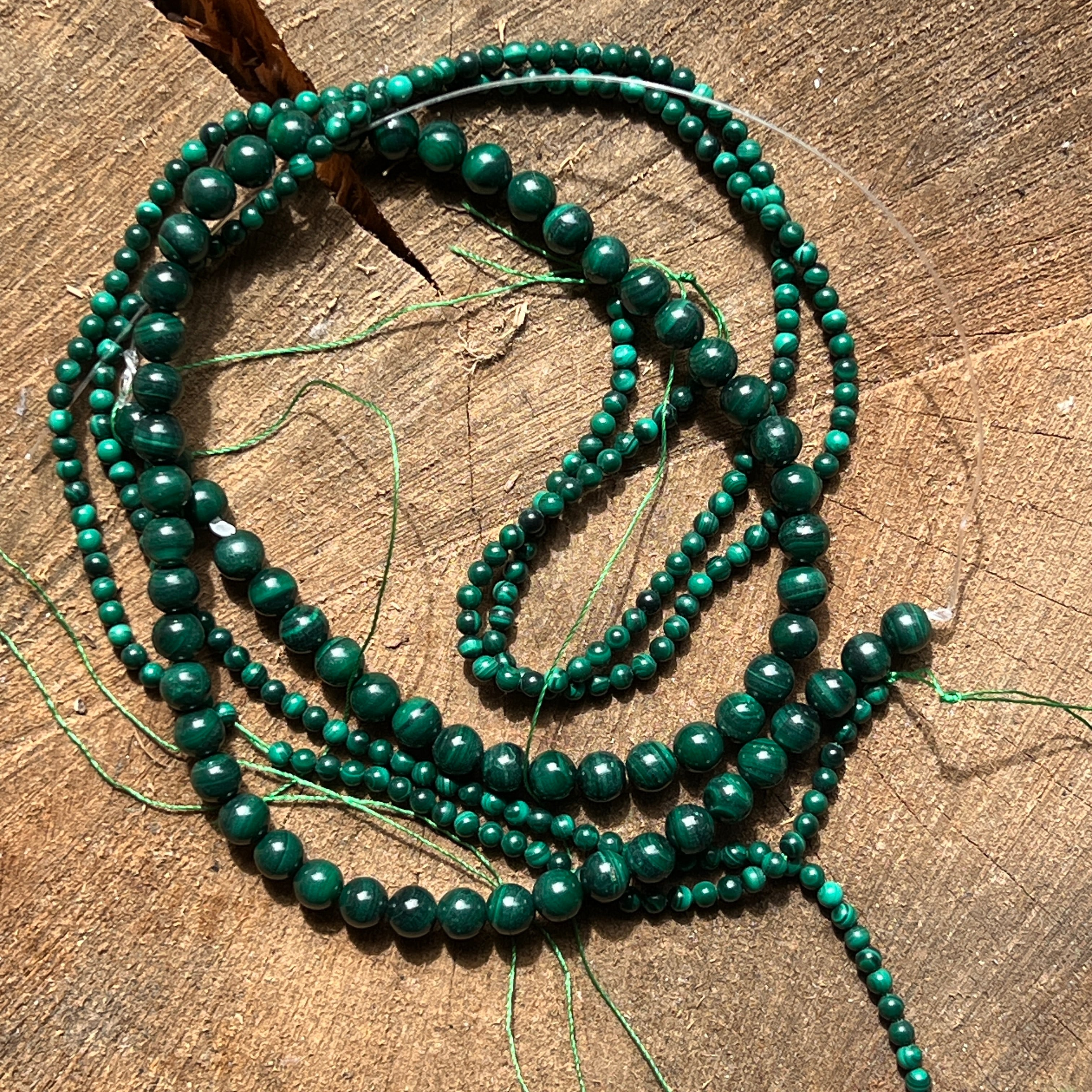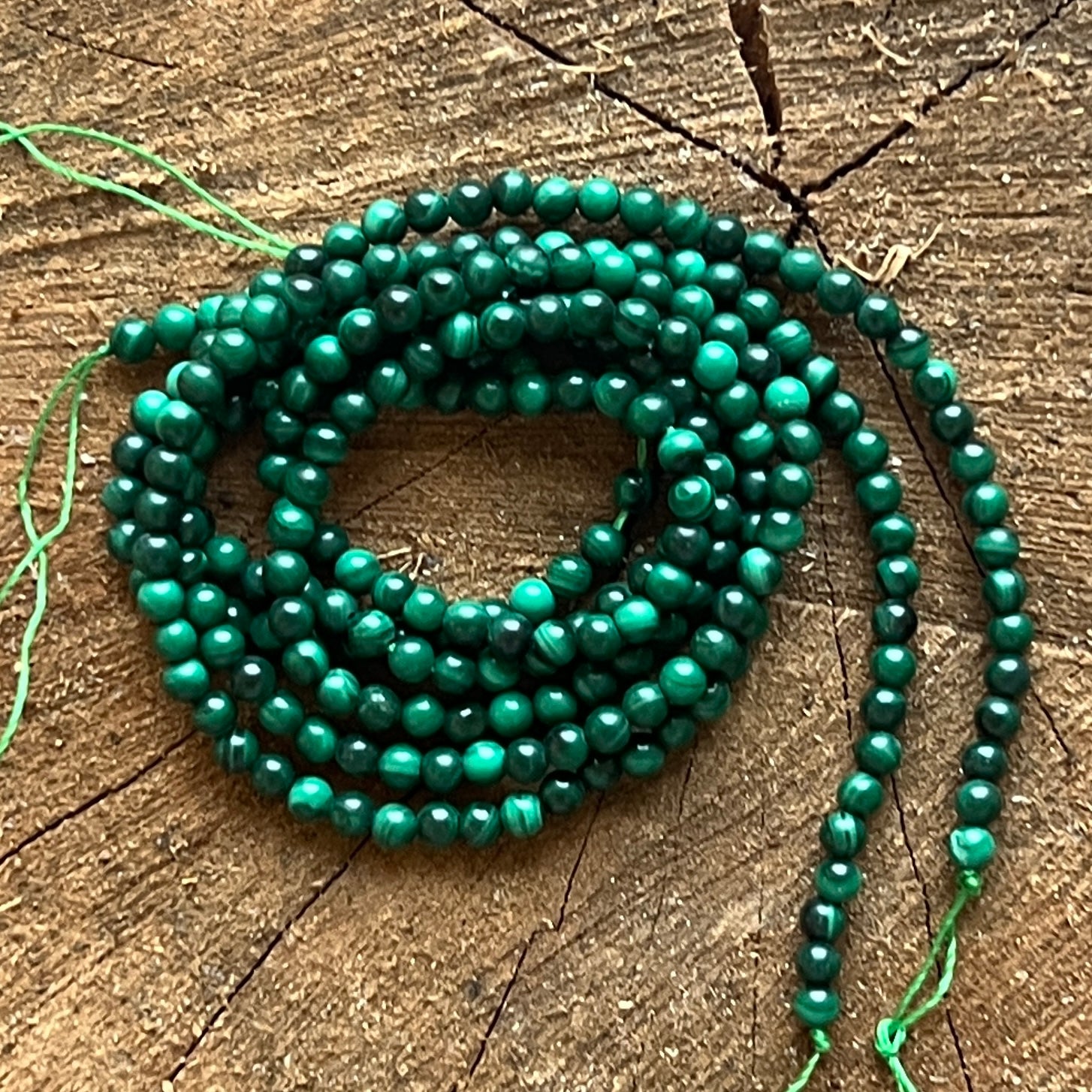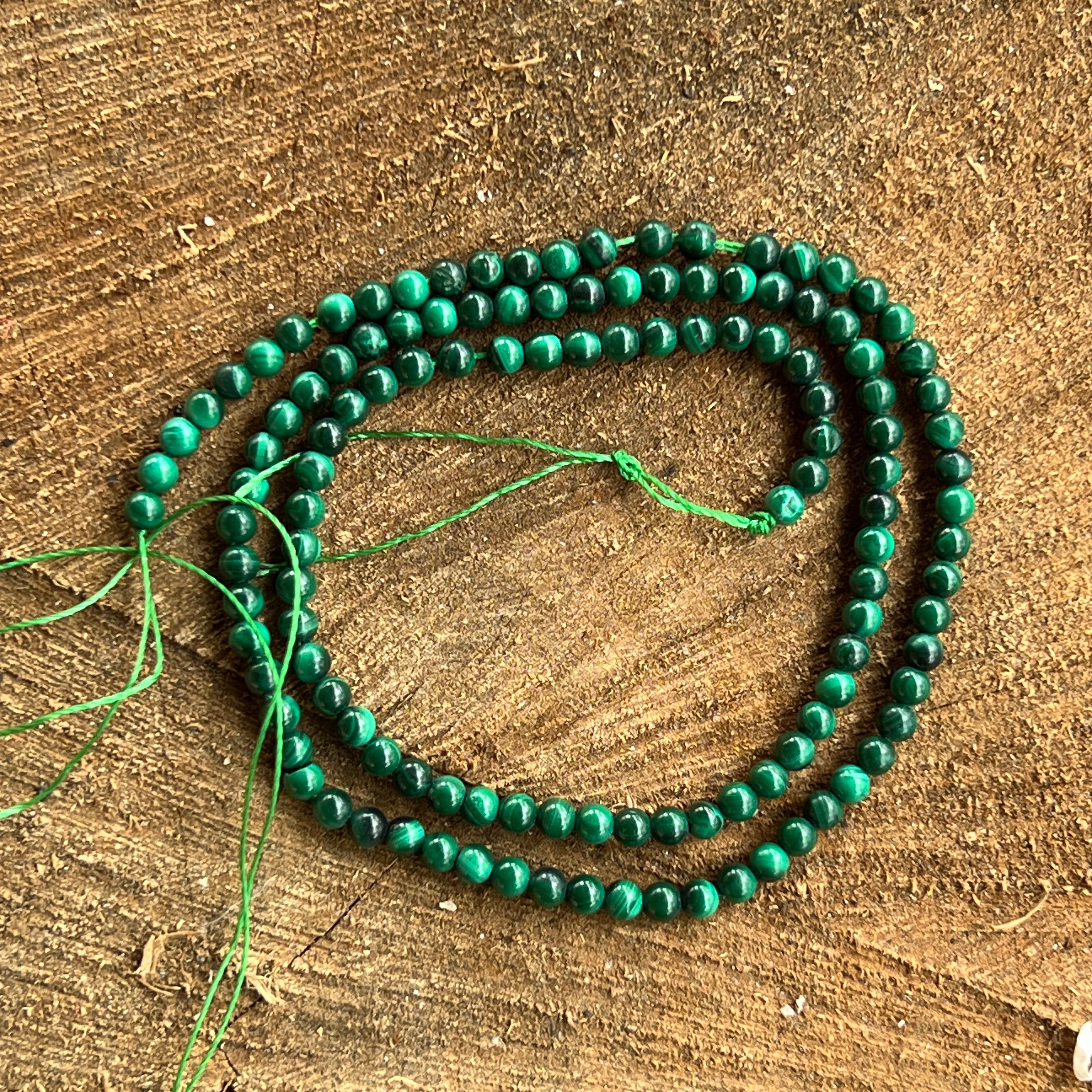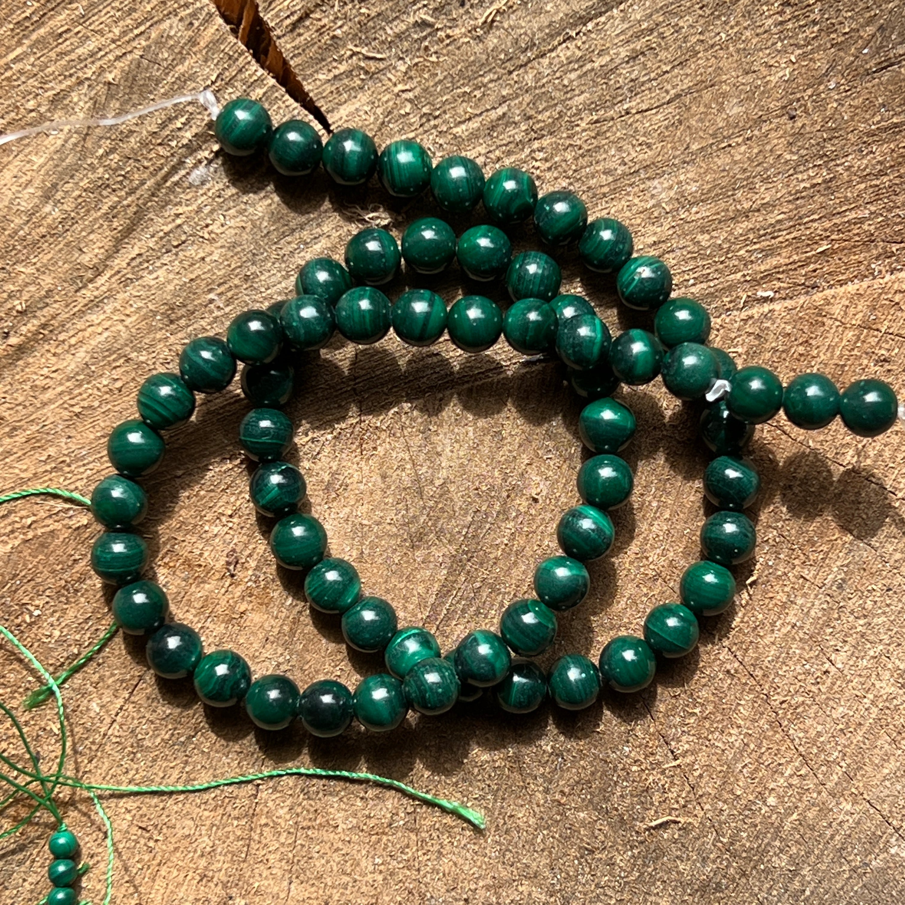 Наниз от малахит, съставен от естествени сферични мъниста, перфектен за колиета, гривни или други ръчно изработени бижута.