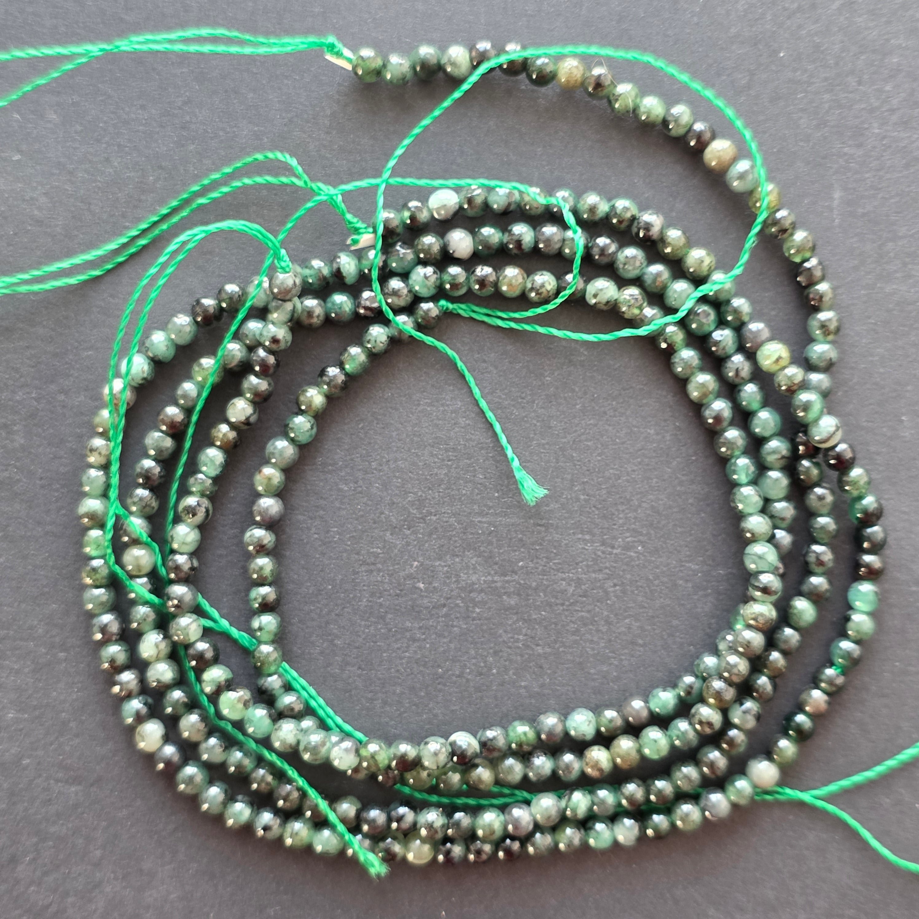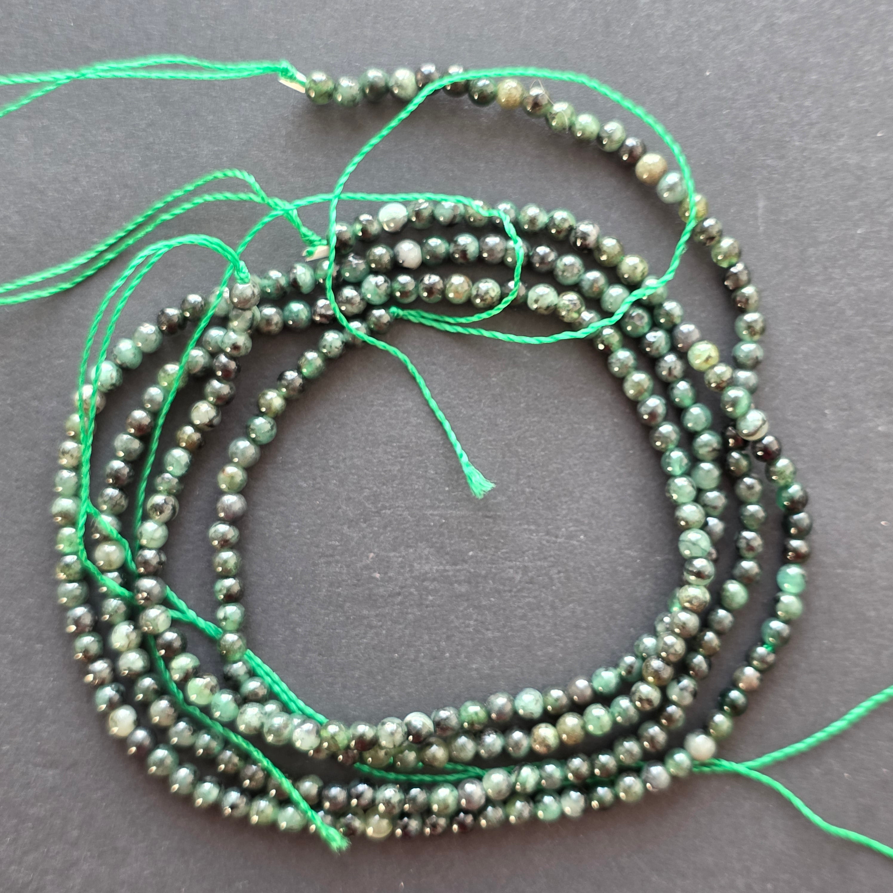 Низ от изумруд, съставен от естествени сферични мъниста, перфектни за колиета, гривни или други ръчно изработени бижута.