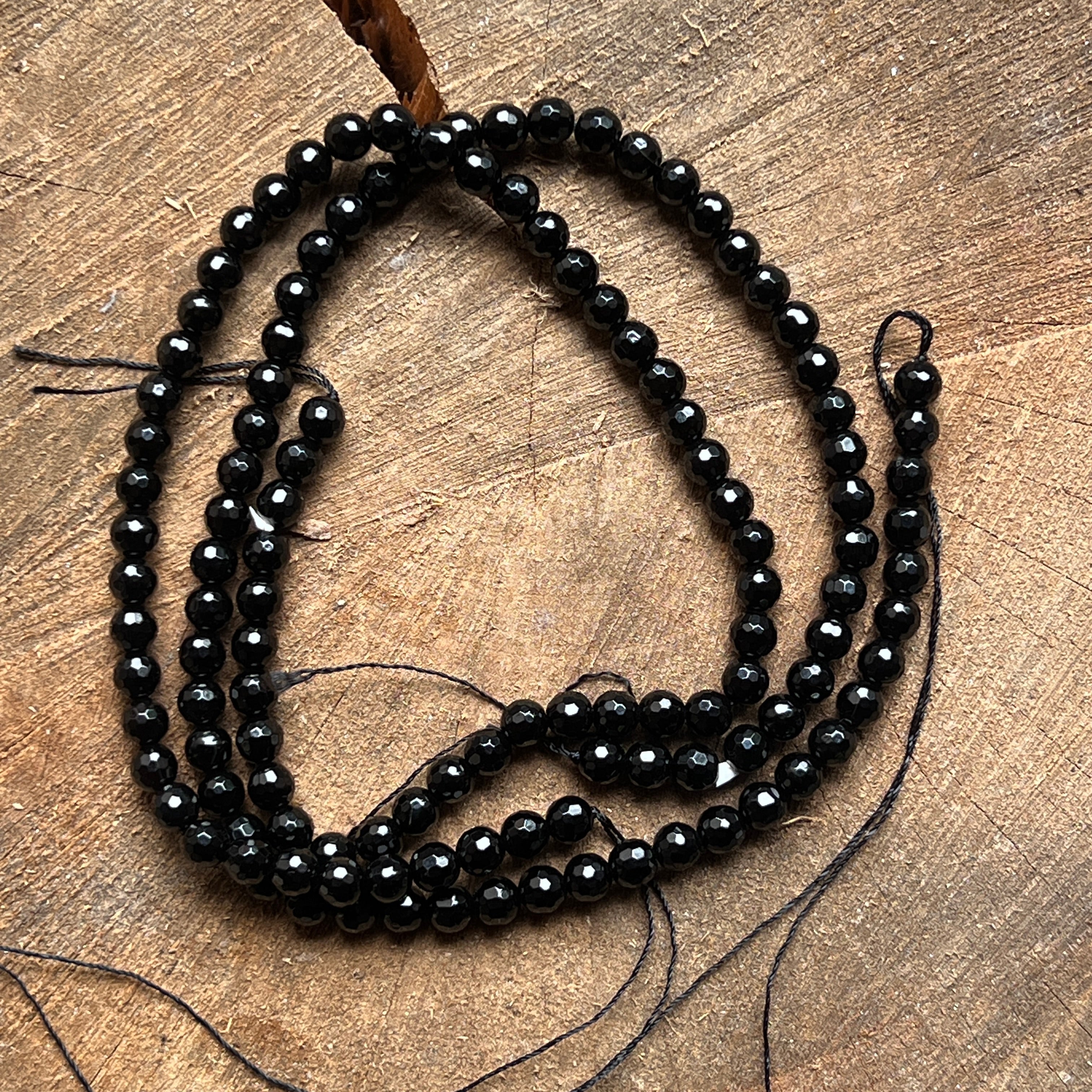 Нишка от черен оникссъставена от естествени фасетирани сферични мъниста,перфектни за колиета, гривни или други ръчно изработени бижута.