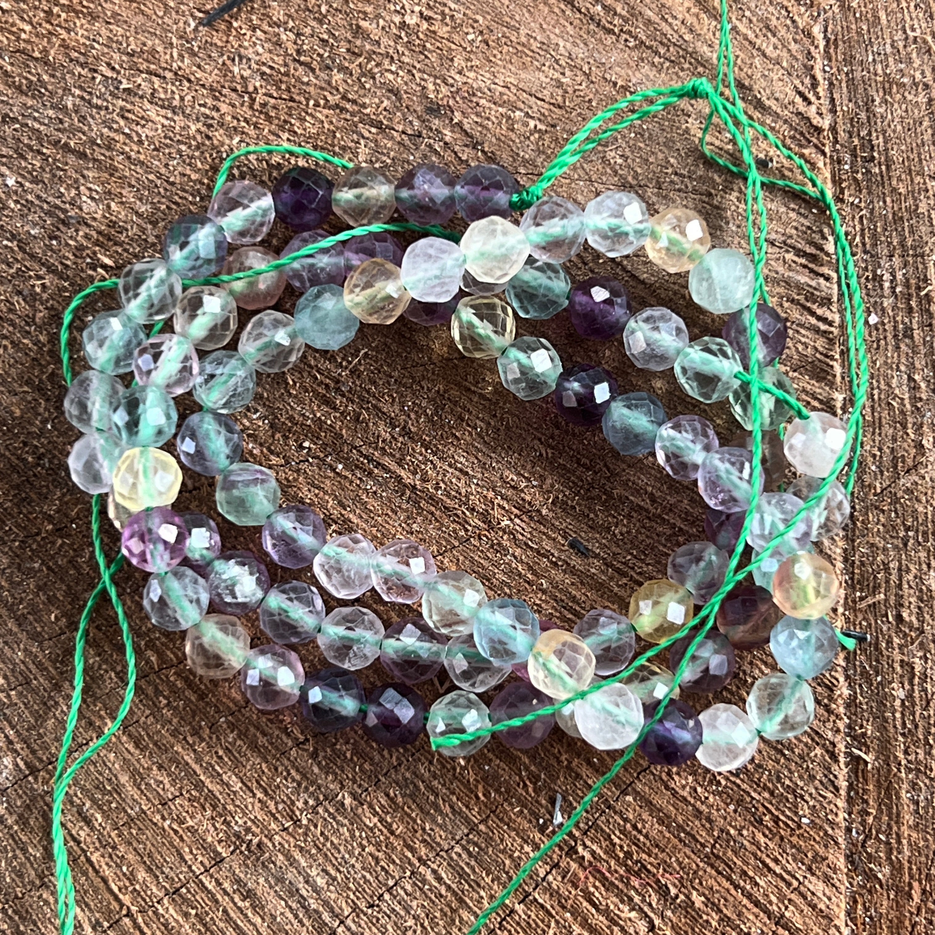Низ от ФЛУОРИТ, съставен от естествени фасетирани сферични мъниста, идеален за колиета, гривни или други ръчно направени бижута.