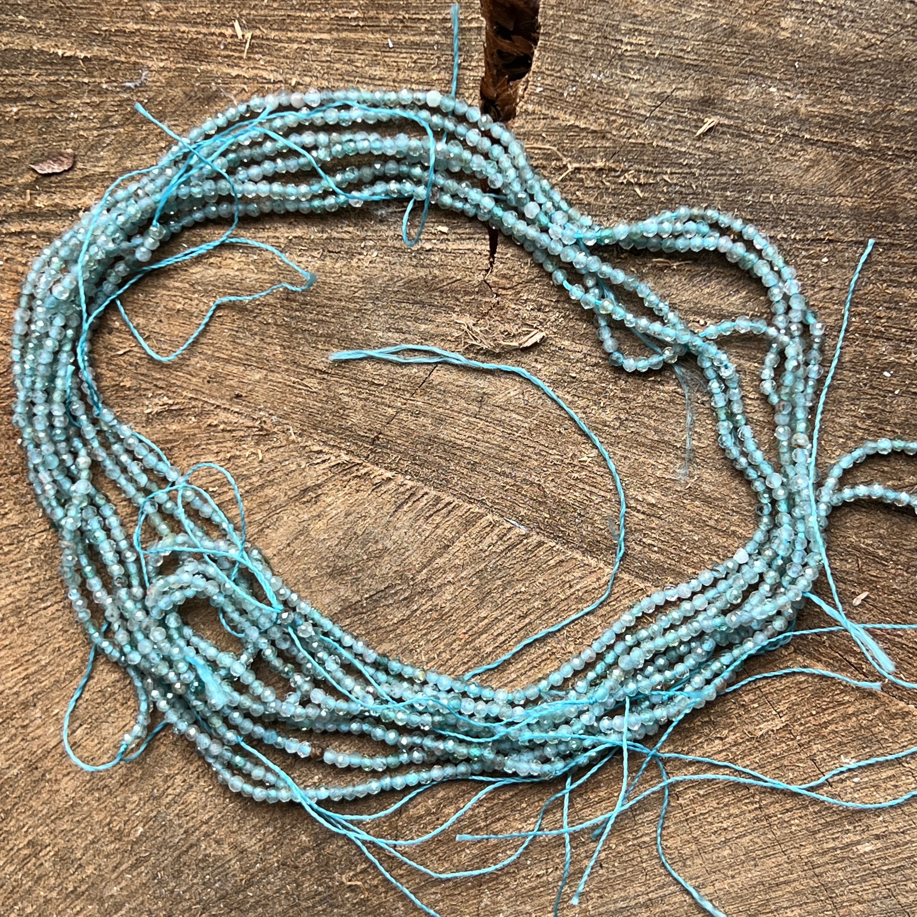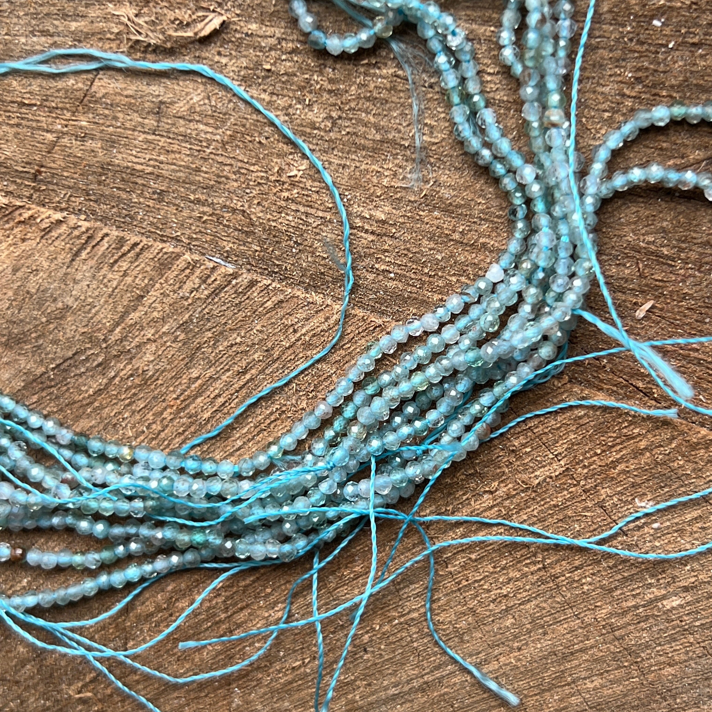 Низ от АПАТИТ, съставен от естествени фасетирани сферични мъниста, идеален за колиета, гривни или други ръчно изработени бижута.