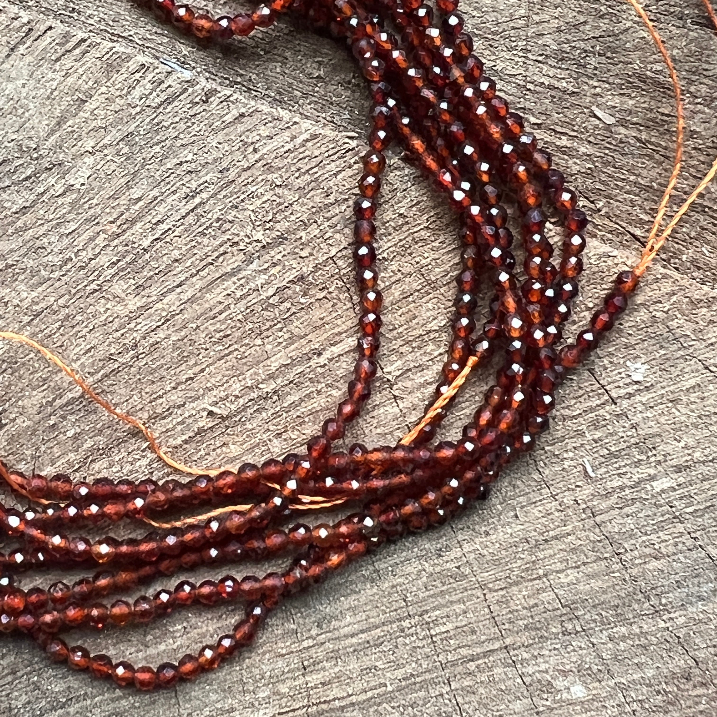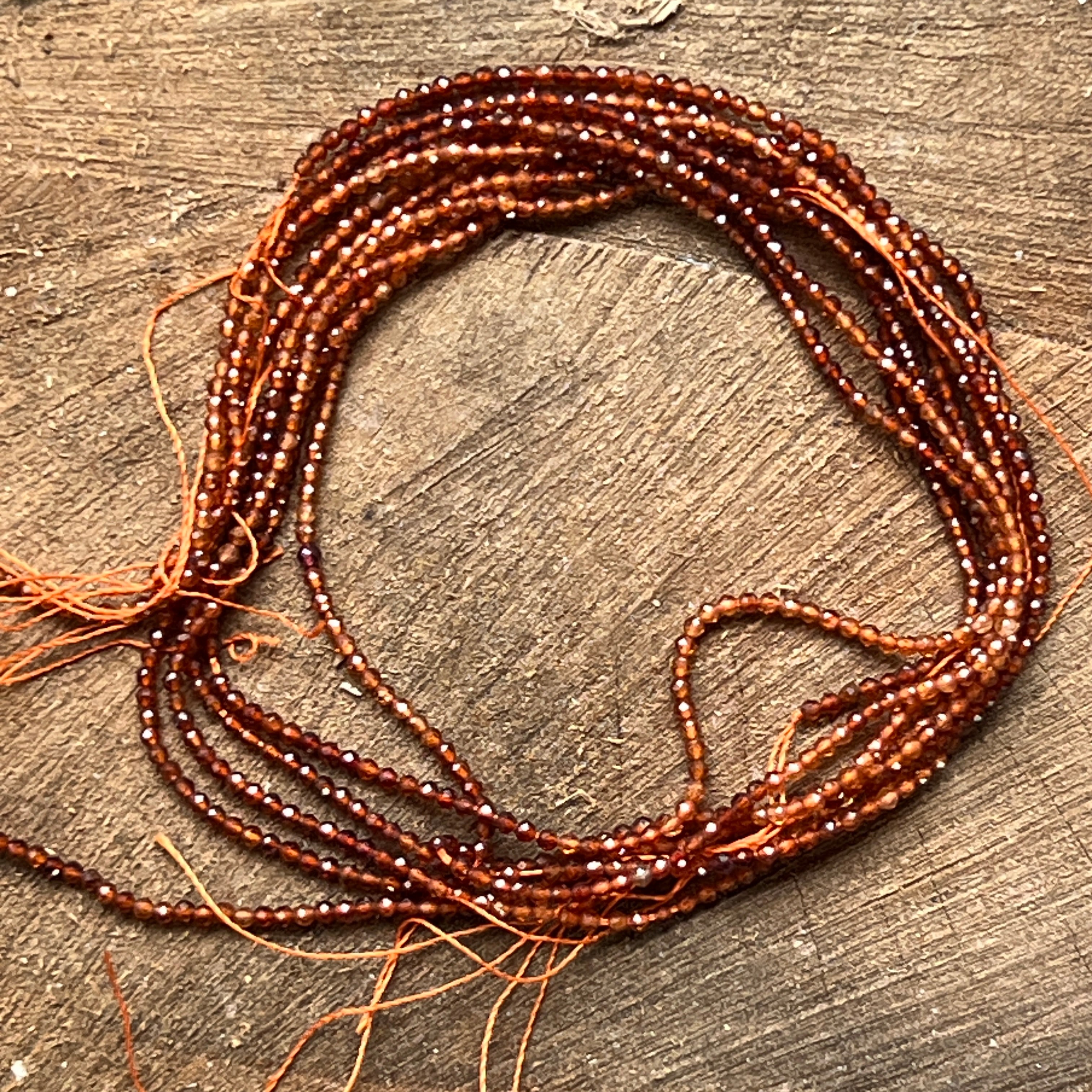 Низ от ТЪМНО ОРАНЖЕВ ГРАНАТ, съставен от естествени фасетирани сферични мъниста, перфектен за колиета, гривни или други ръчно изработени бижута.