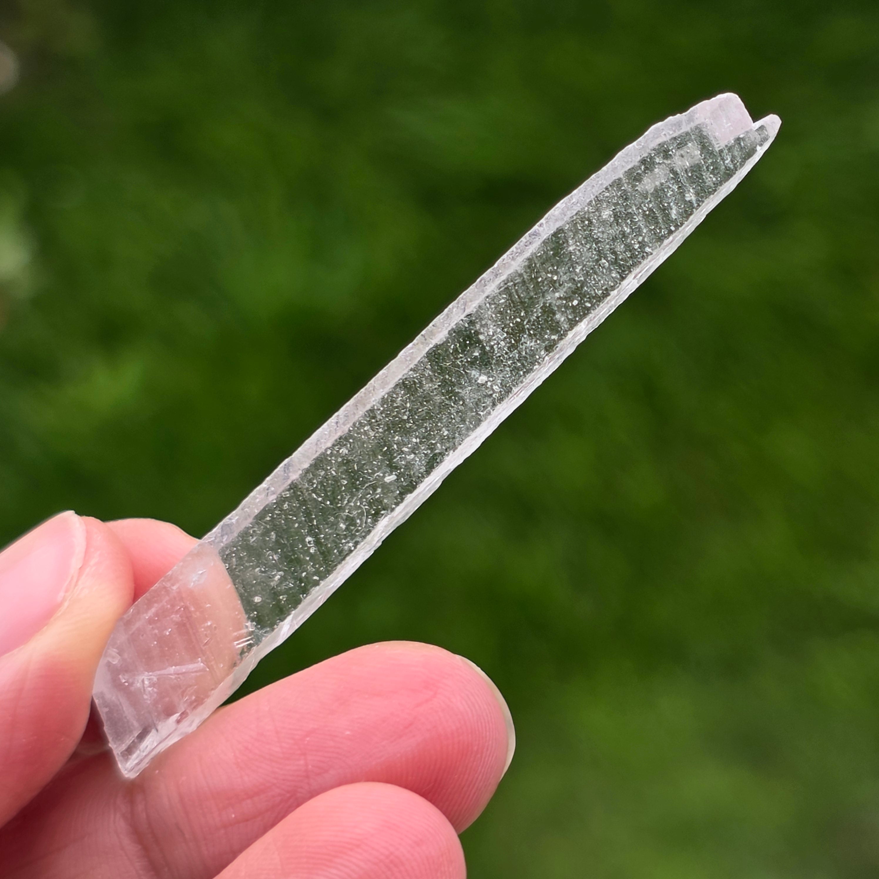 Кристалите са представени във височинна призматична форма, с ясни върховес висока прозрачност и дискретен блясък, почти стъклен. Тяхната удължена форма и начин на растеж придават на всеки екземпляр въздушен, визуално крехък, но минералогично добре дефиниран характер. Чистият и равномерен вид прави тези образци изключително ценени за колекционните витрини.
