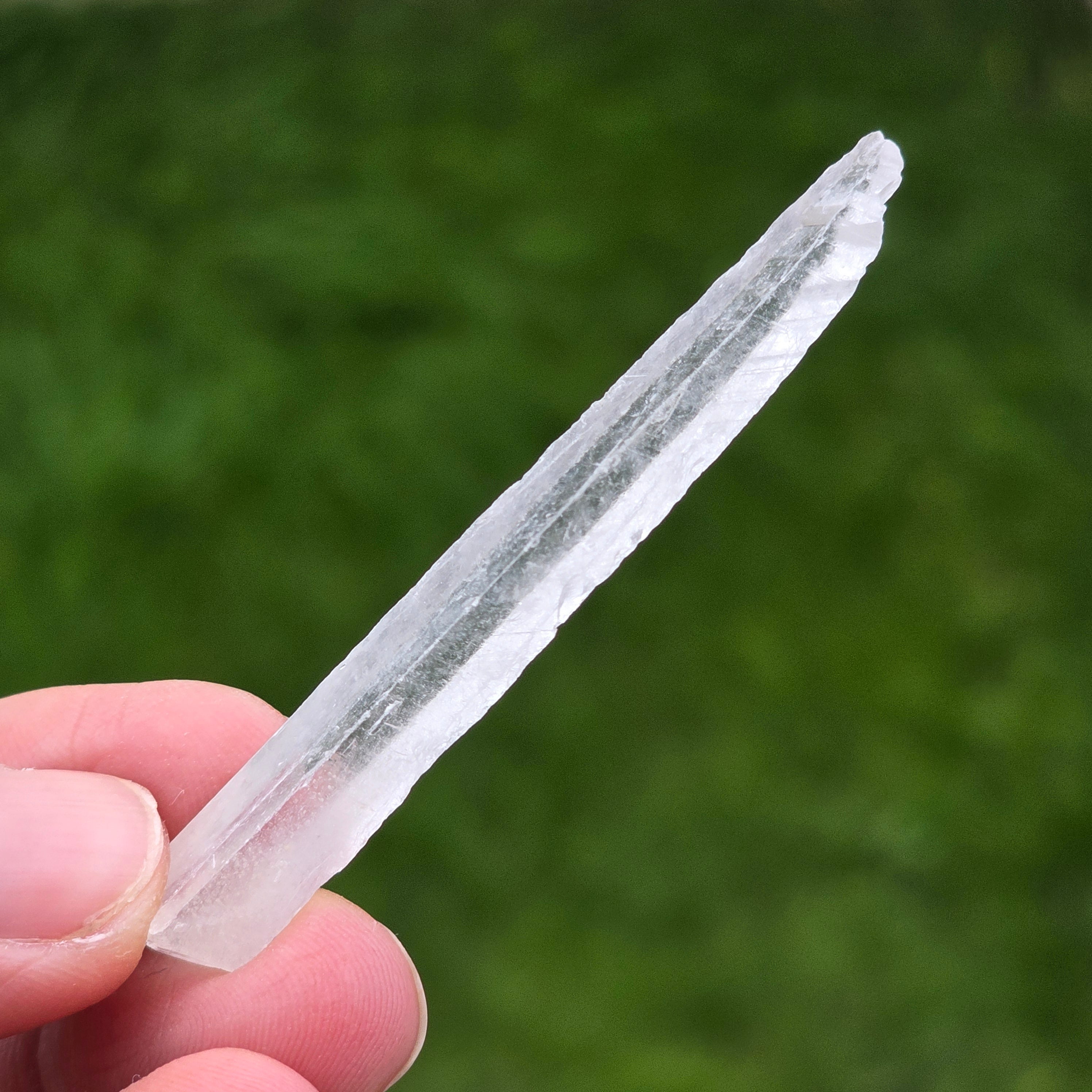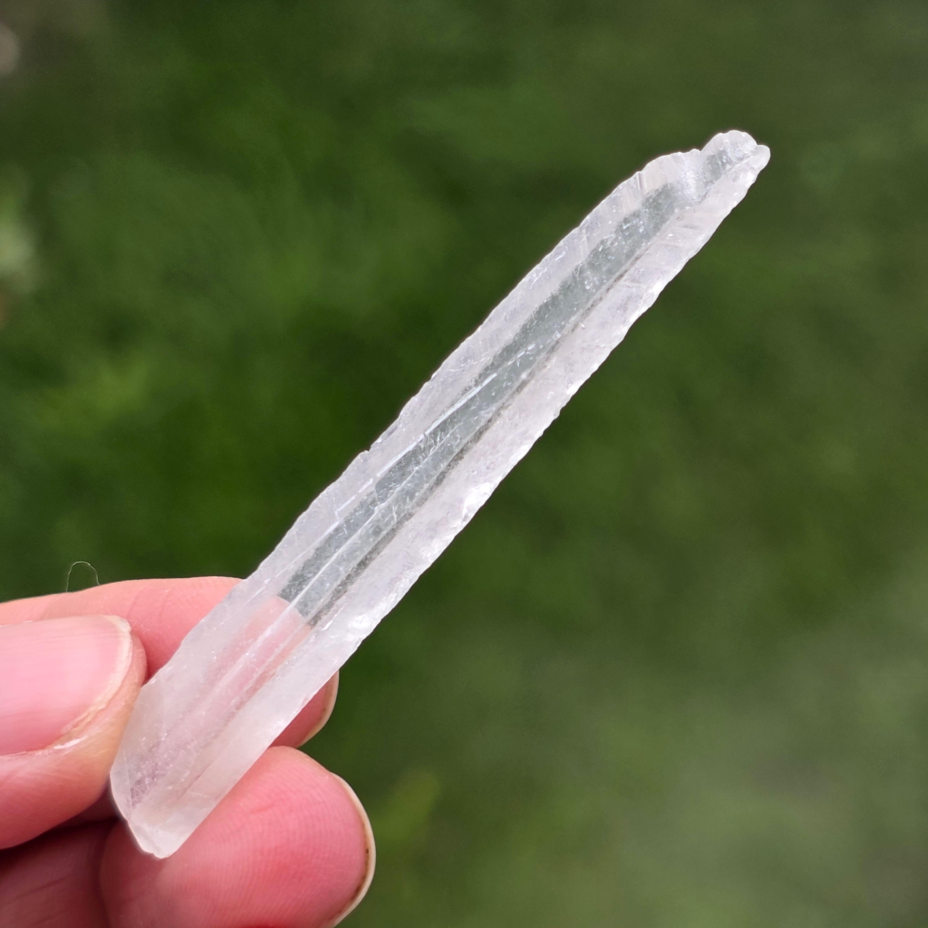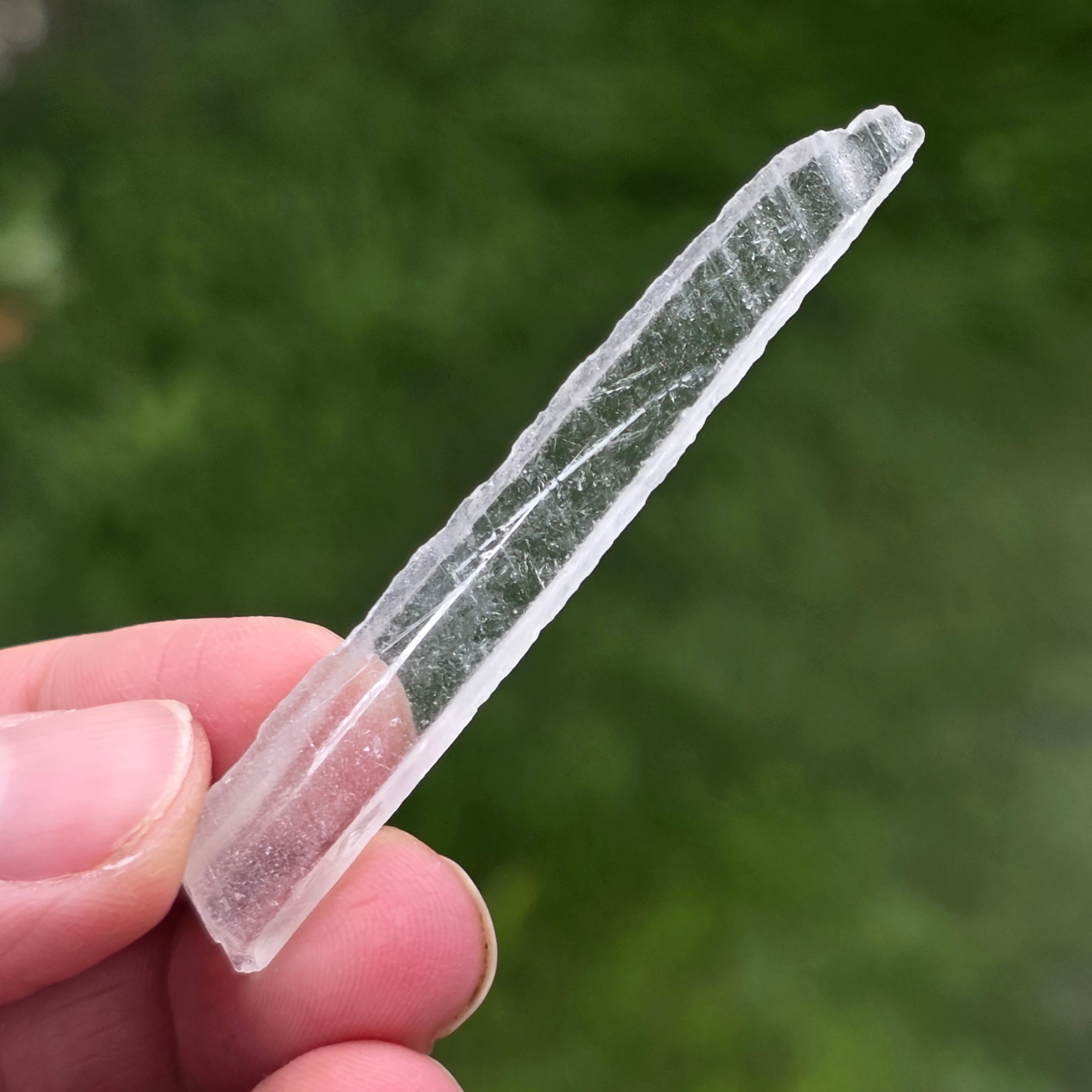 Кристалите се представят във тънка призматична форма с ясни върхове, с висока прозрачност и дискретен, почти стъклен блясък. Издължената им форма и начинът на растеж придават на всеки екземпляр въздушен характер, визуално крехък, но добре дефиниран минералогично. Чистият и еднороден външен вид прави тези образци изключително ценни за колекционните витрини.