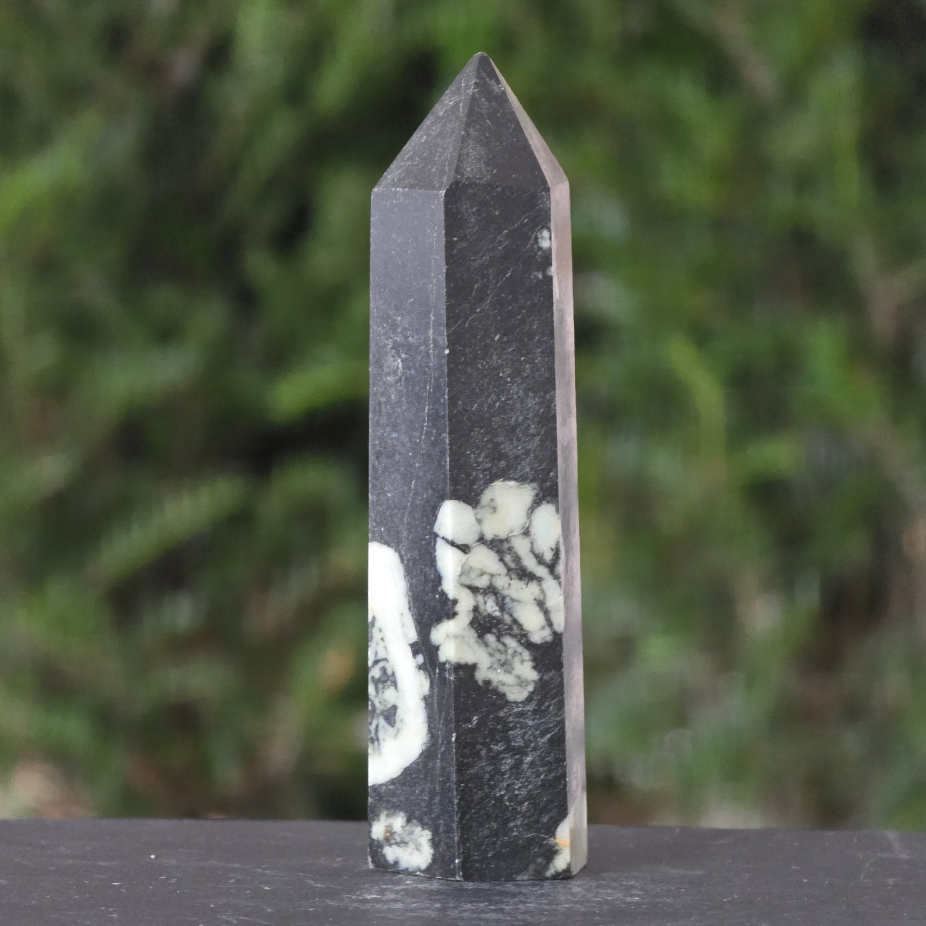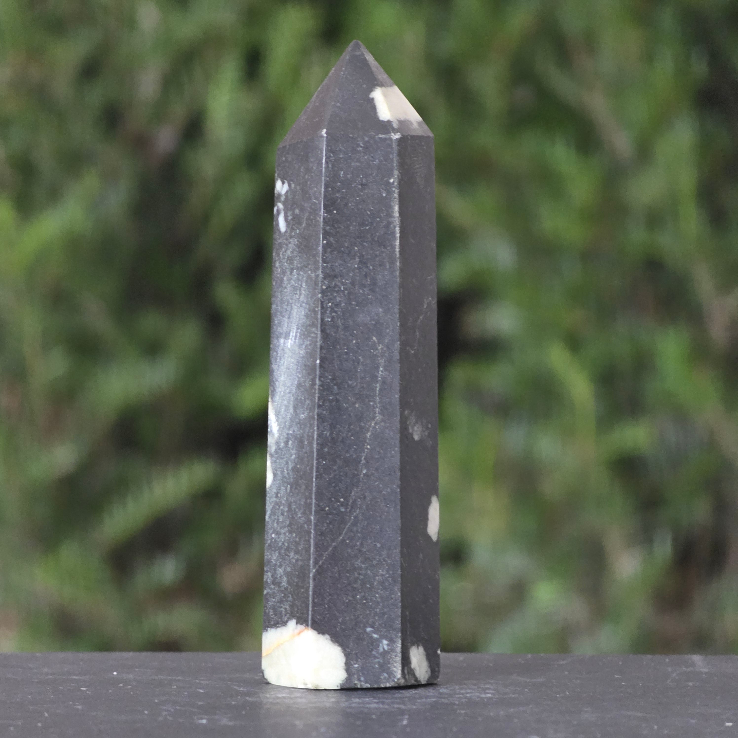 Формата на обелиск, символ на духовното извисяване, усилва енергията на камъка и я насочва към яснота, кураж и удовлетворение.