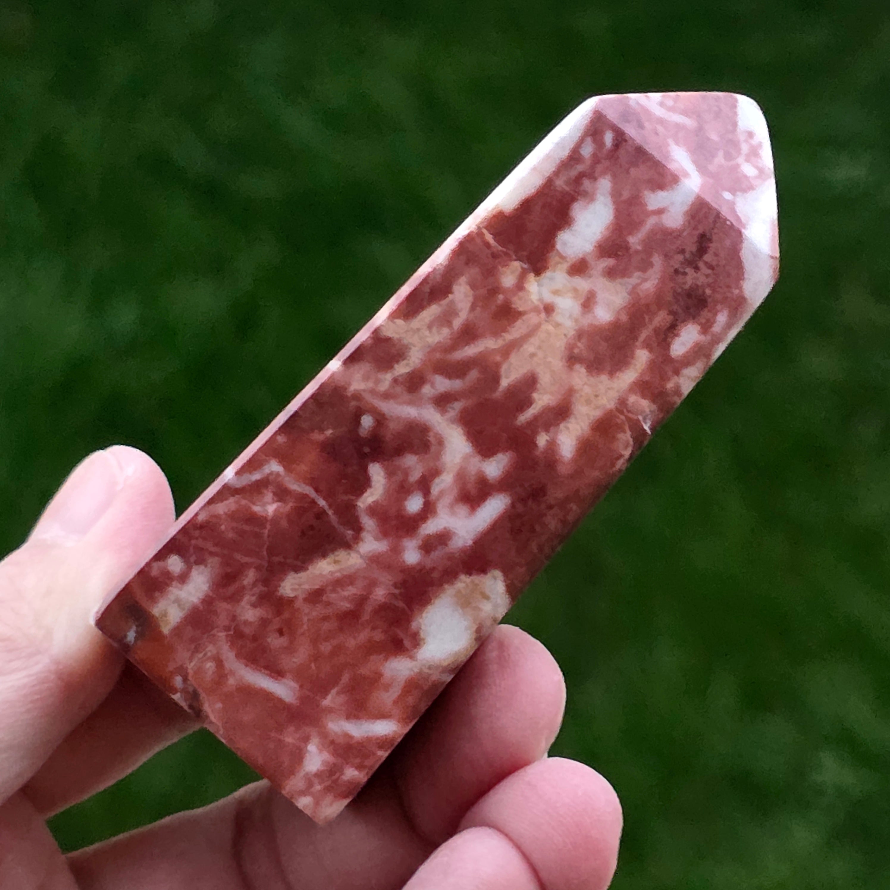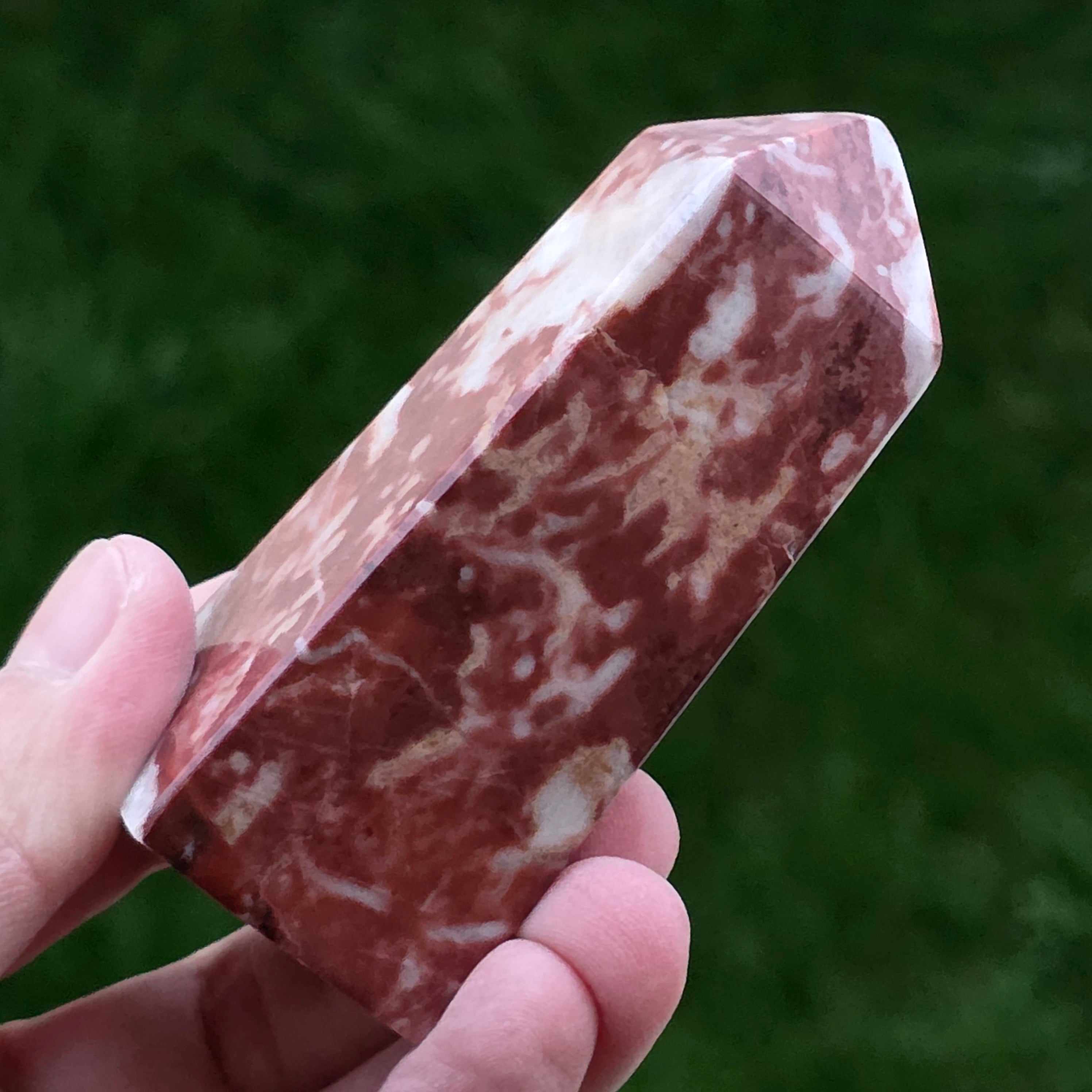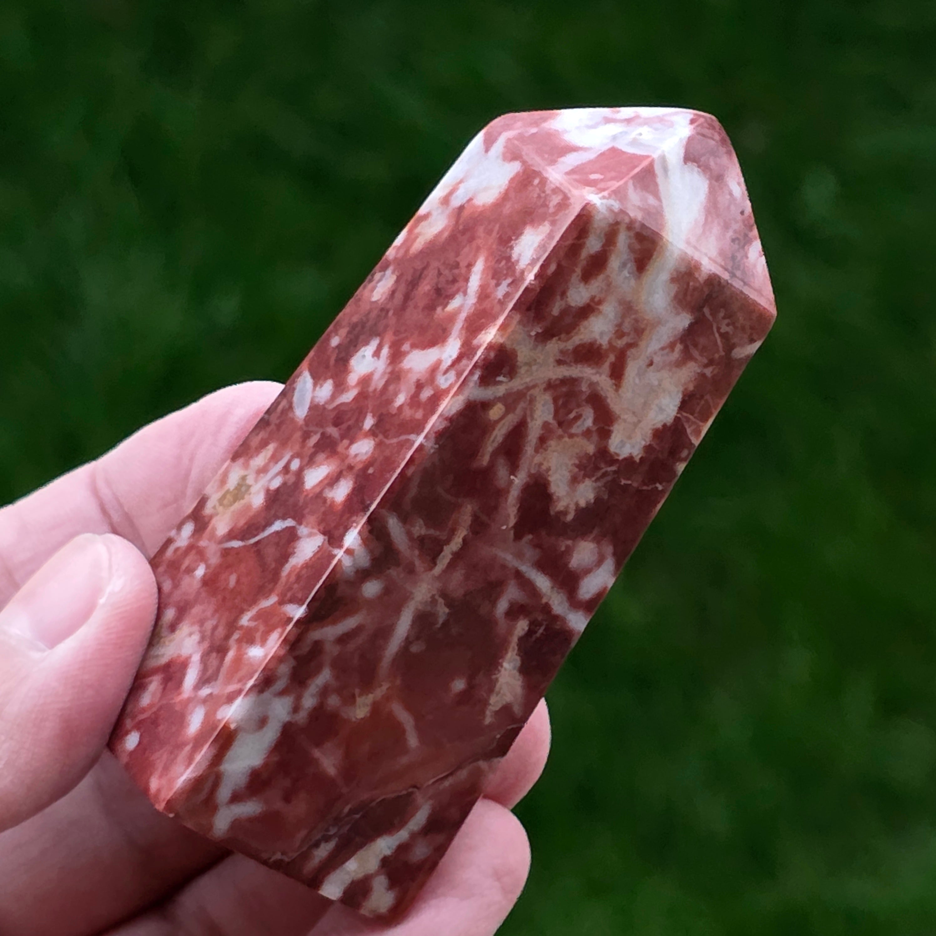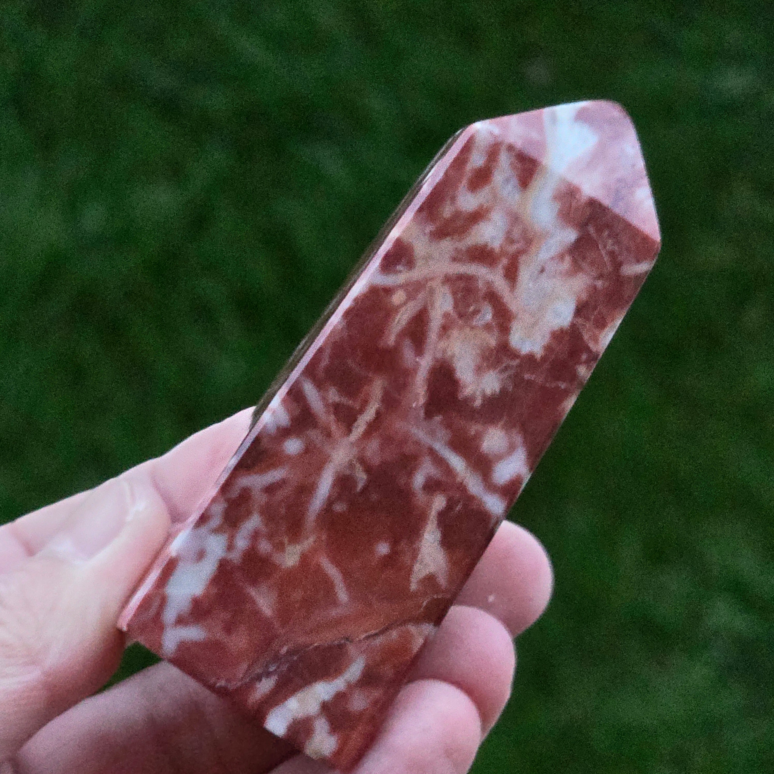 Обелискът от Яспис Strawberry е пълен с жизненост, внимателно издялан, за да подчертае наситените оттенъци на ягодово червено и естествените текстури, характерни за този вид яспис. Всеки обелиск е уникален, с органични модели, напомнящи за древни седиментни скали и минерални слоеве, формирани бавно в геологически ритъм.