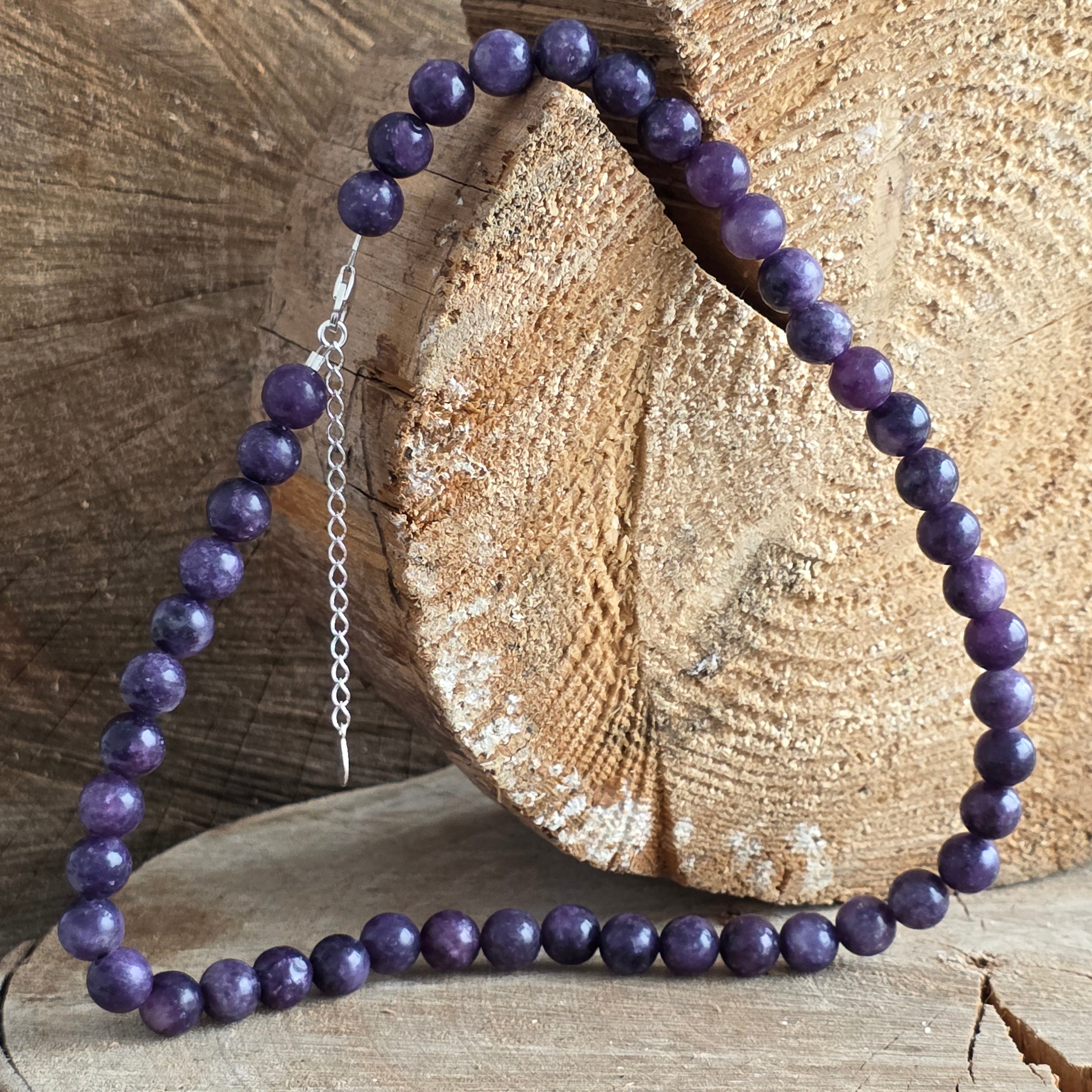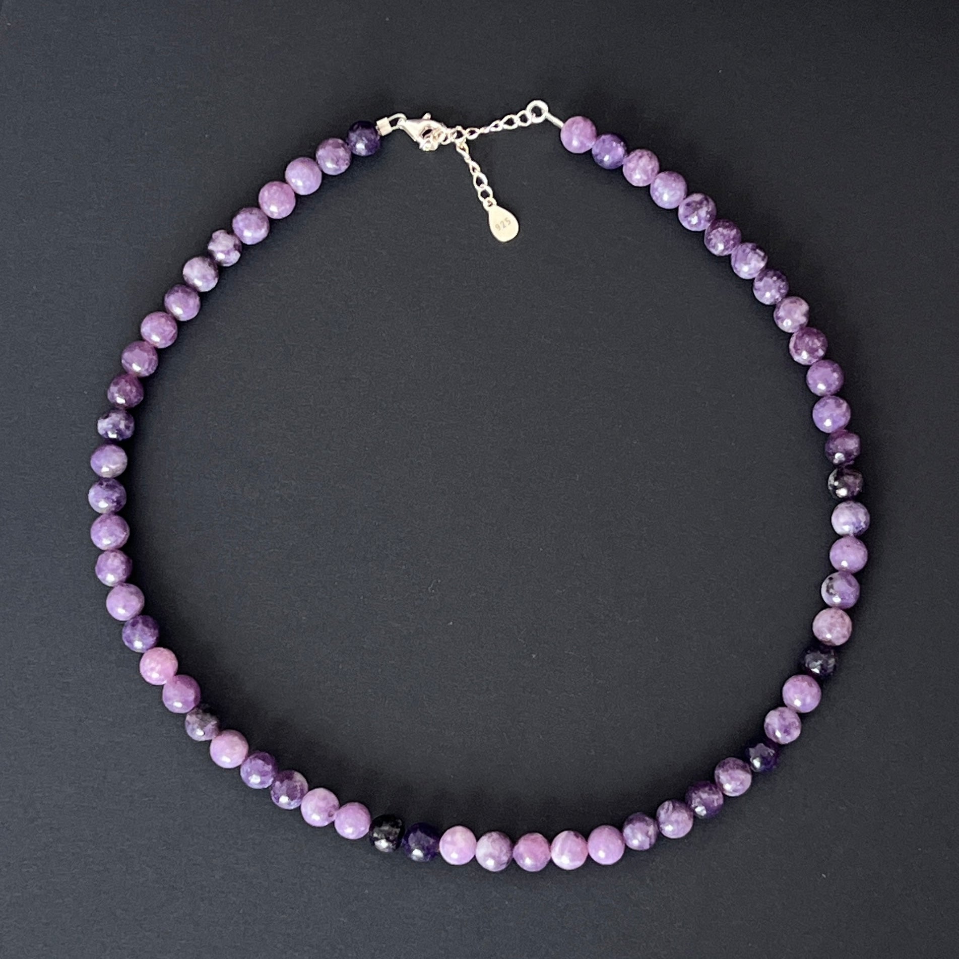 Колие, което излъчва спокойствие и нежност, като лек полъх в здрача или молитва, прошепната в тишина. Мънистата от естествен лепидолит с размер 8-9 мм, с лавандулови и перленосиви отблясъци, създават спокоен и защитен поток.