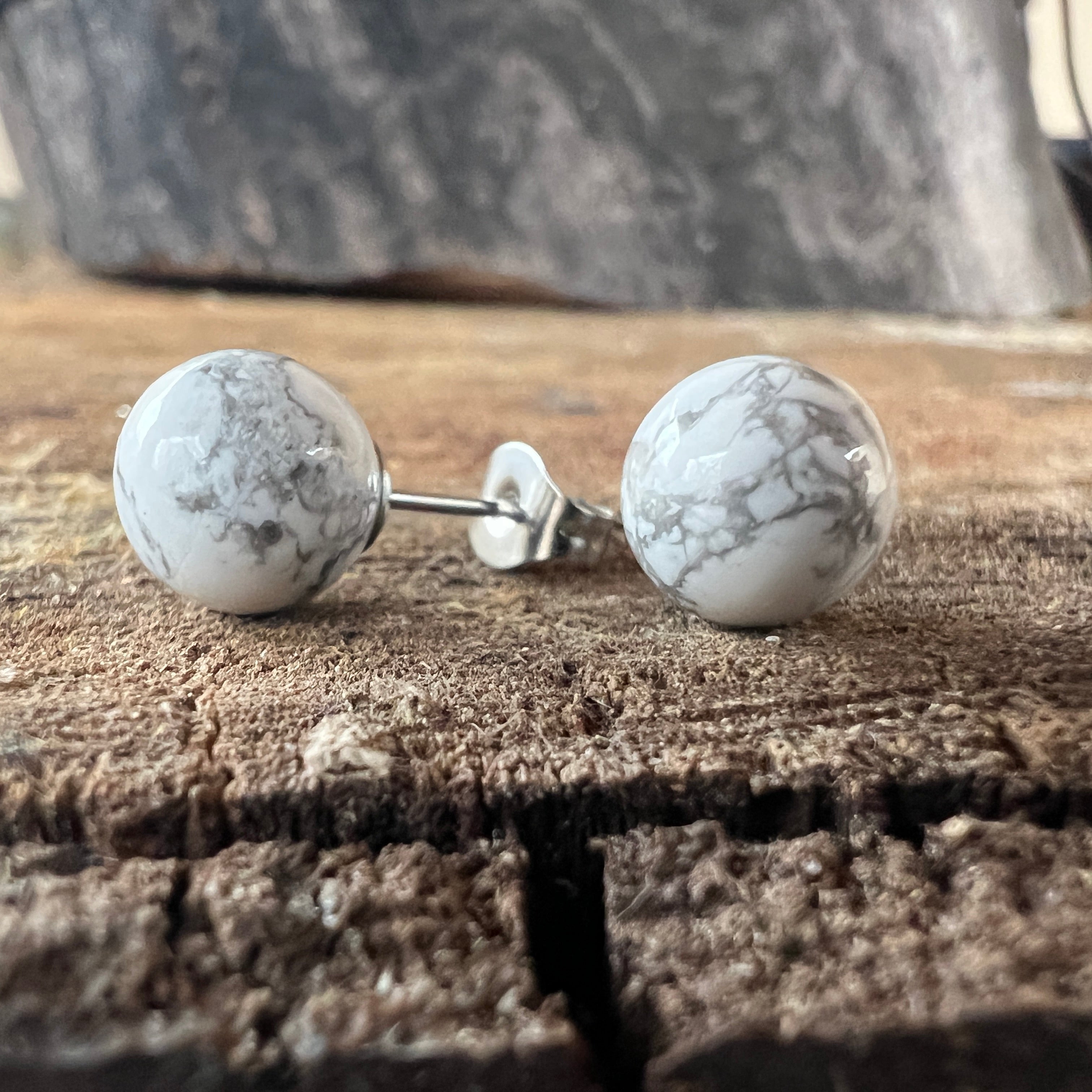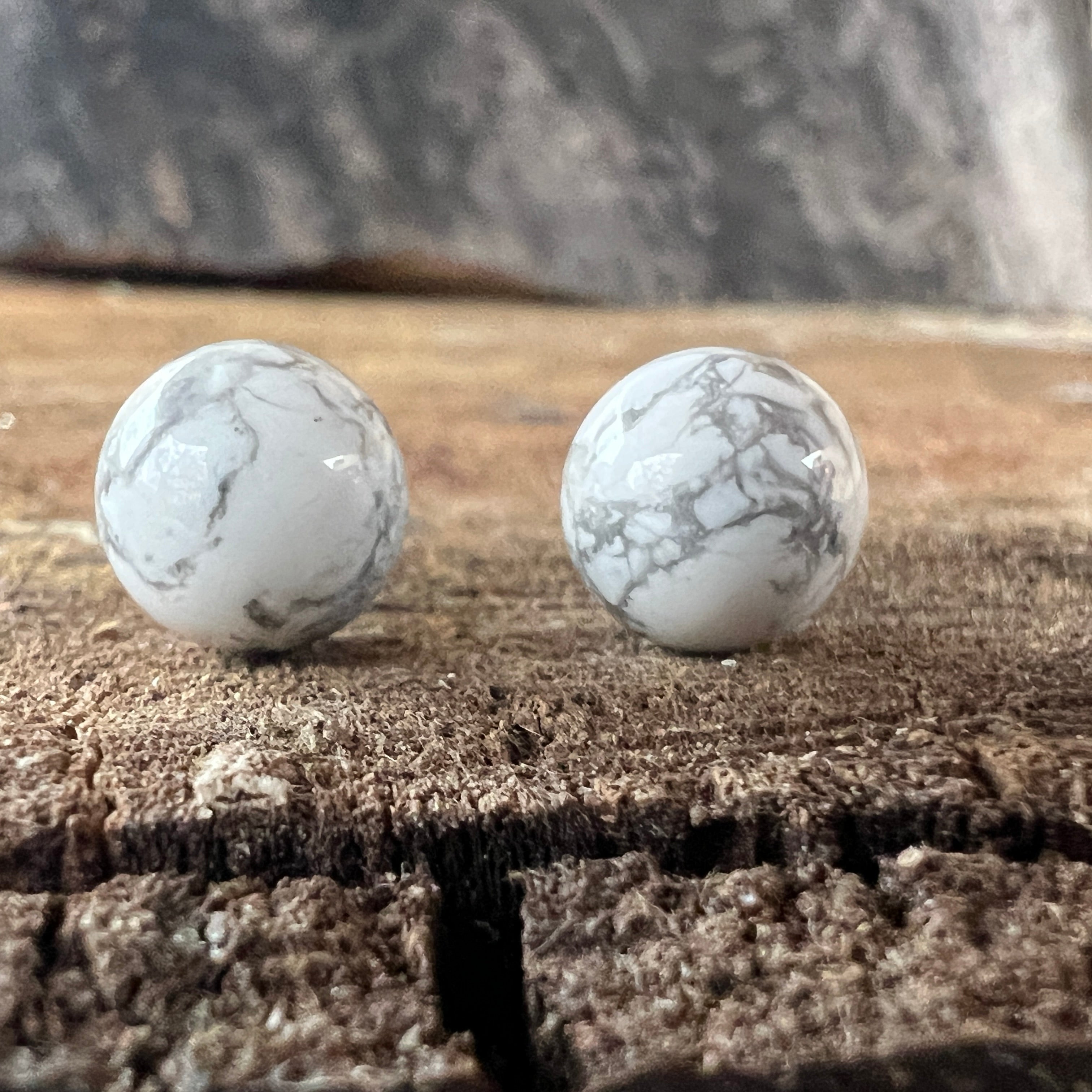 Обeци на гвоздей с бели овални хаулайт топчета 8 мм