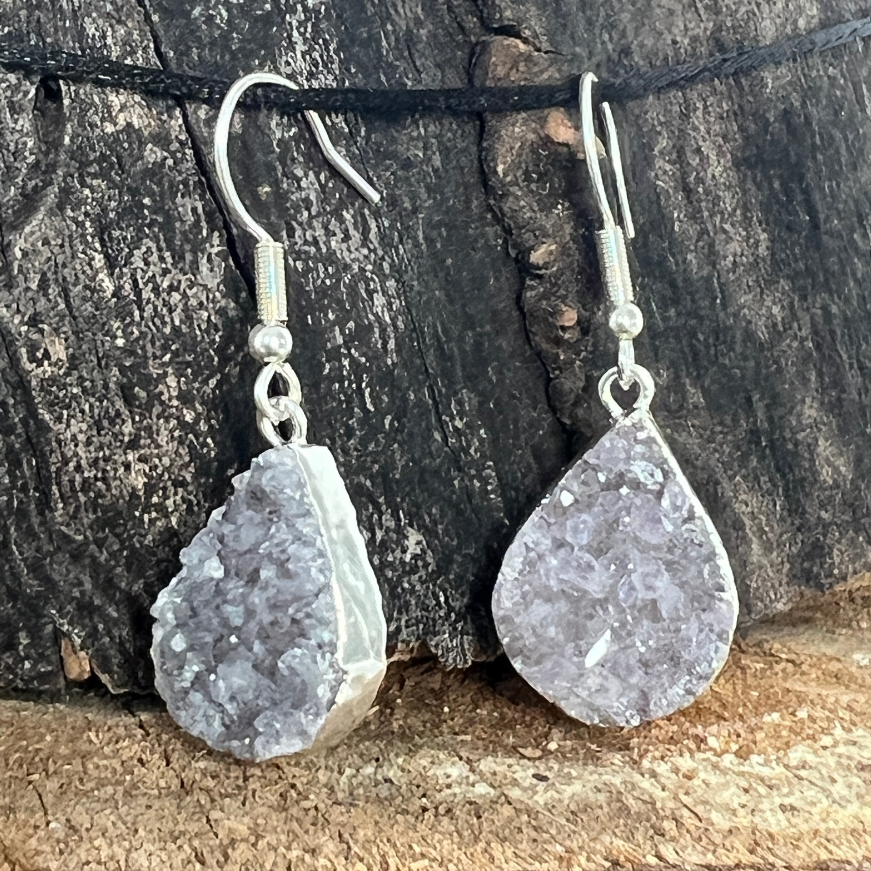 Тези обеци с натурален друши ахат впечатляват със своя кристален вид и блестящите отражения, като всяка двойка е уникална със светлинната игра на камъните. Елегантният дизайн, допълнен от основата позлатена със сребро, ги прави подходящи както за ежедневно носене, така и за специални поводи.