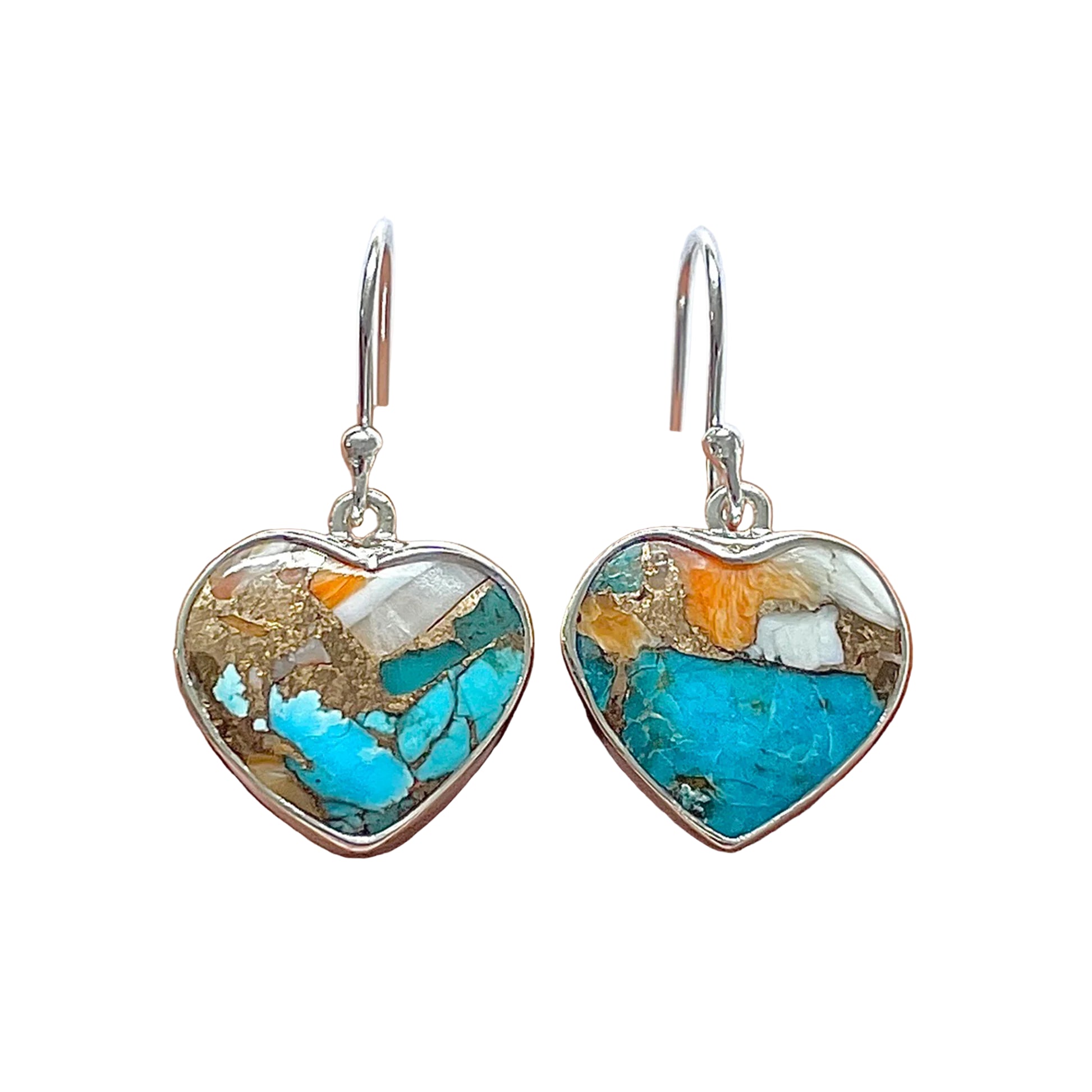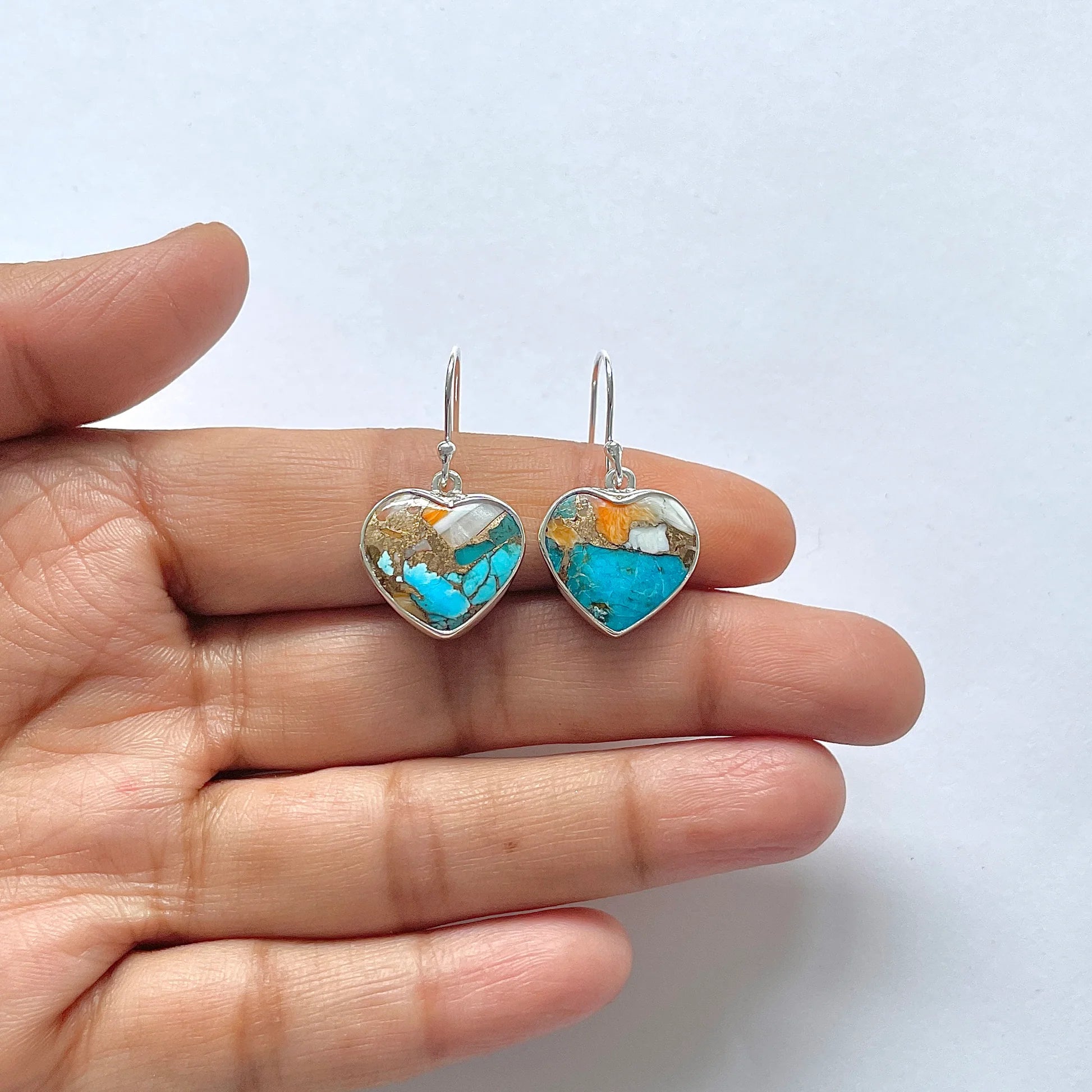 Тези сърцевидни сребърни обеци от 925 с Spiny Oyster Turquoise са празник на цветовете на природата, превърнати в уникално бижу. Природната мозайка от наситен син тюркоаз, фрагменти от оранжева черупка Spiny Oyster и бели перлени вкрапления създават уникален минерален пейзаж, като спомен за морето и небето, съединени в хармония.