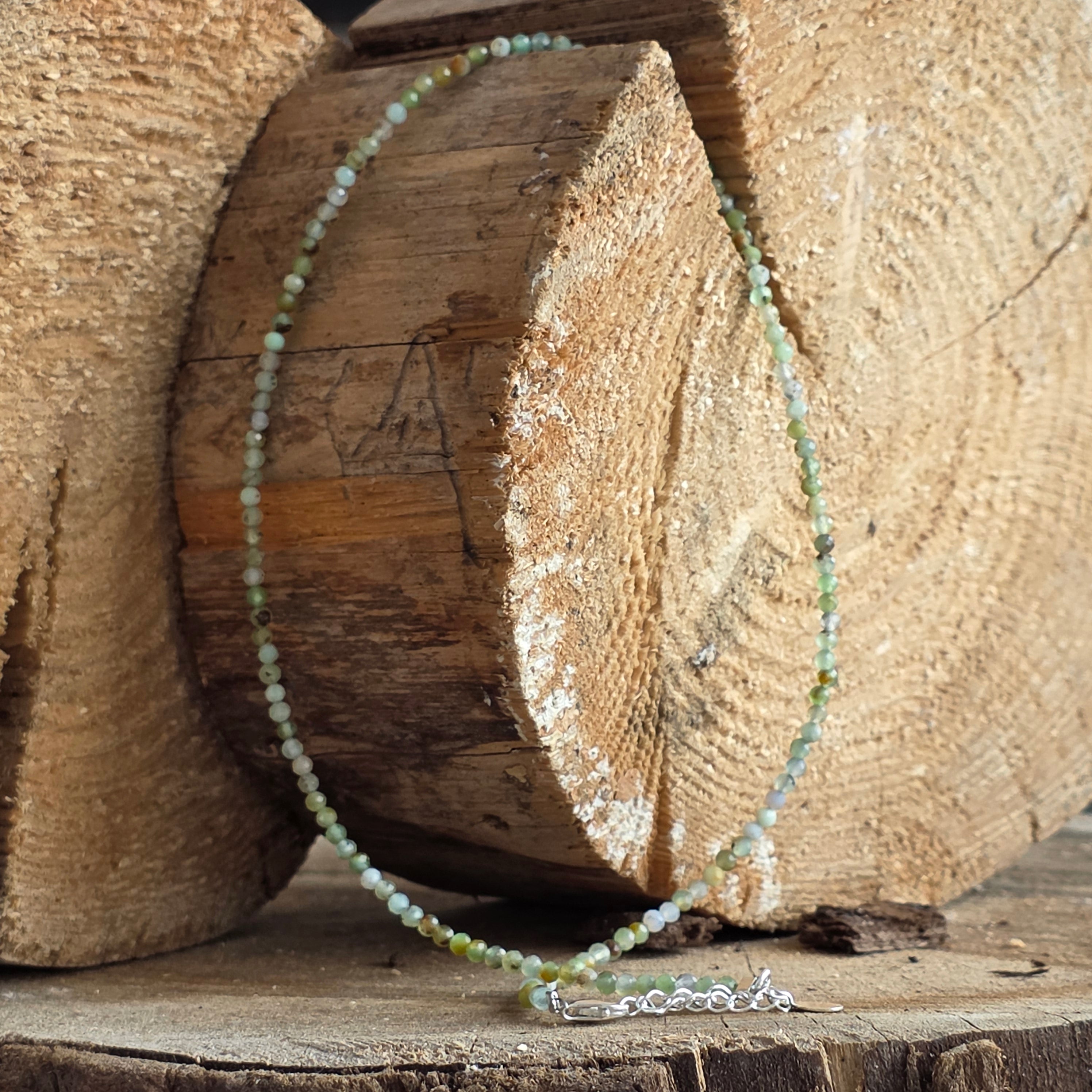 Колие, което носи светлината на лятото и нежността на ново начало. Хризопрасум, със своята ярка и прозрачна зеленина, е открит камък на сърцето — символ на на чиста любов, състрадание и обновление на душата. 3мм фасетените мъниста улавят всеки лъч светлина, превръщайки огърлицата в жив, сияен и деликатен бижу.
