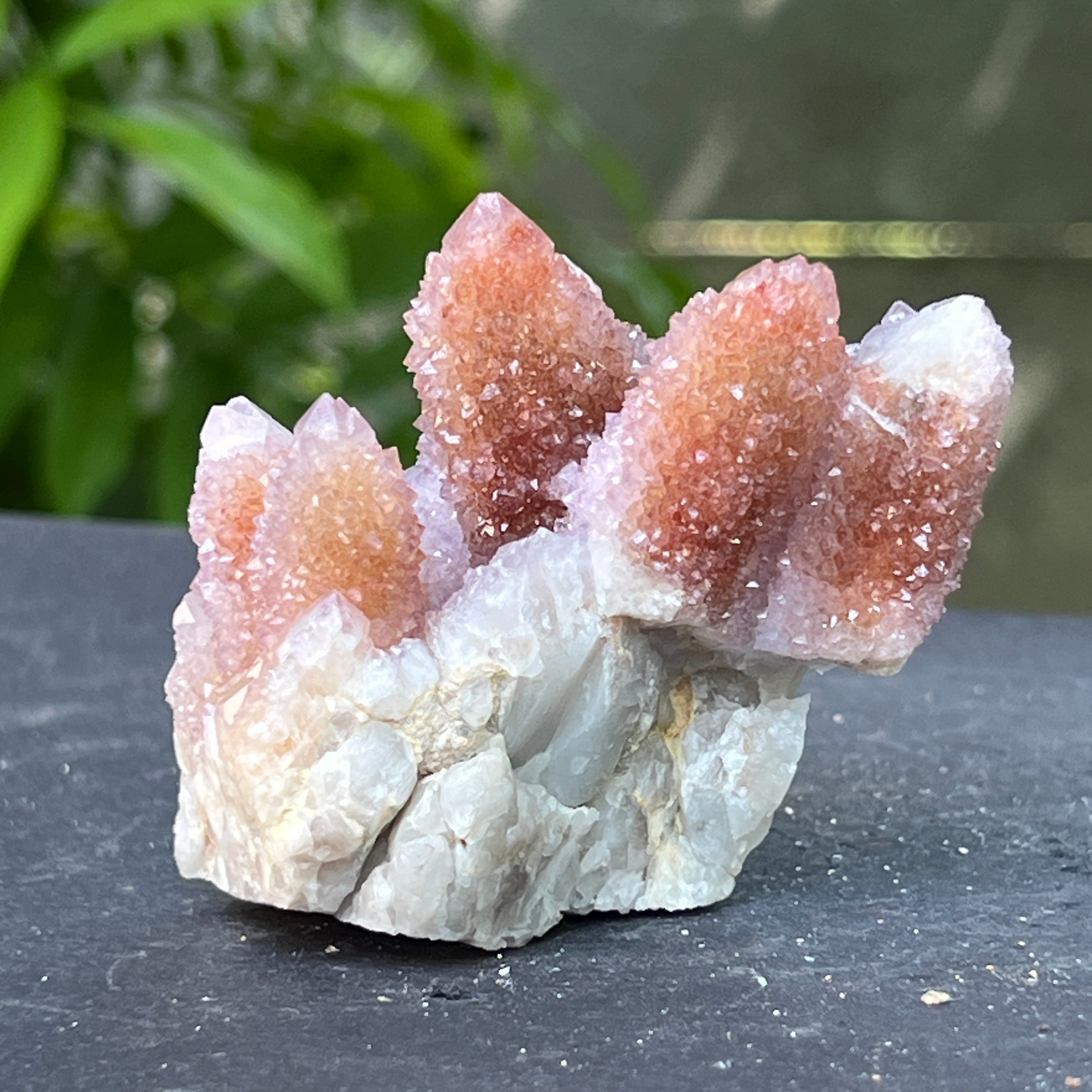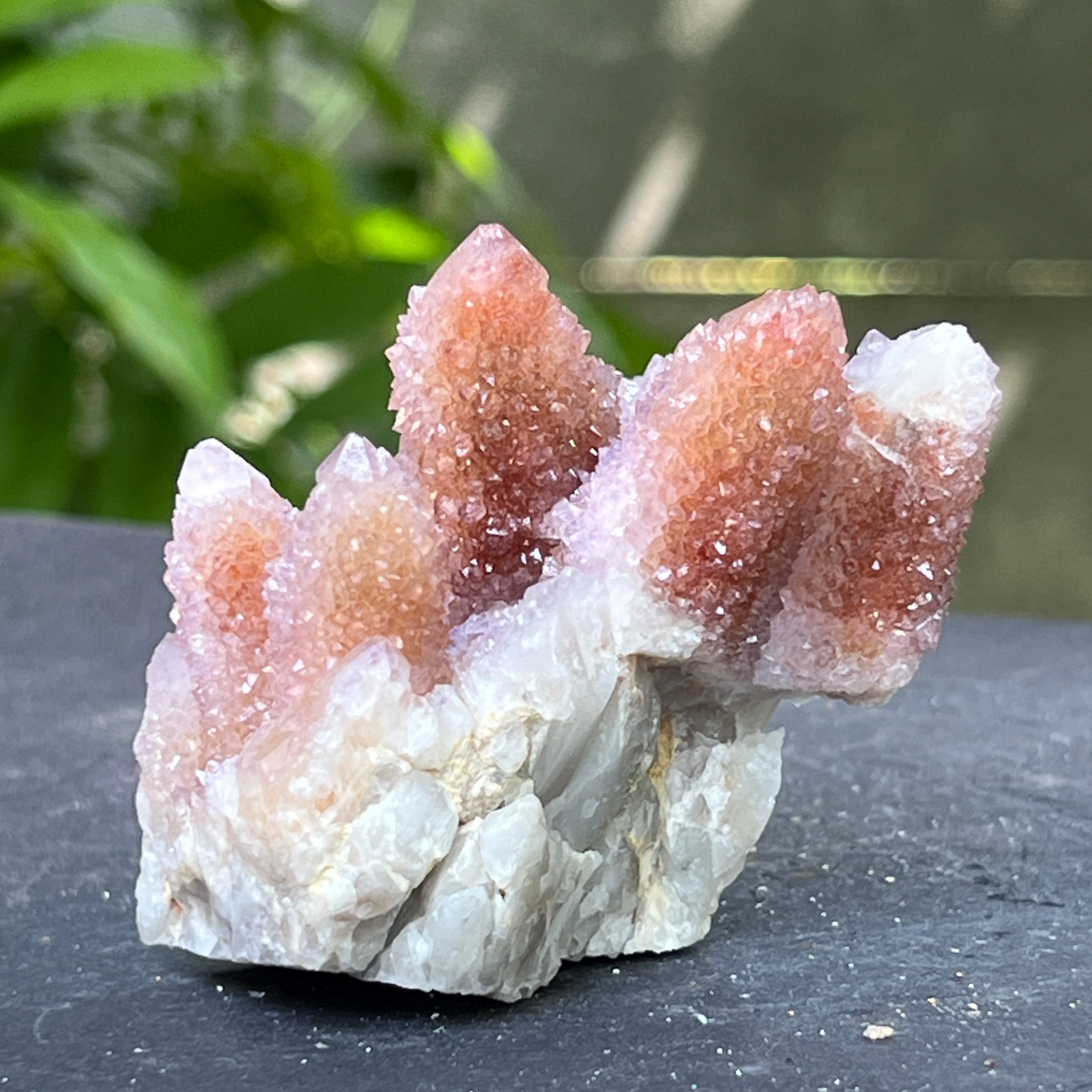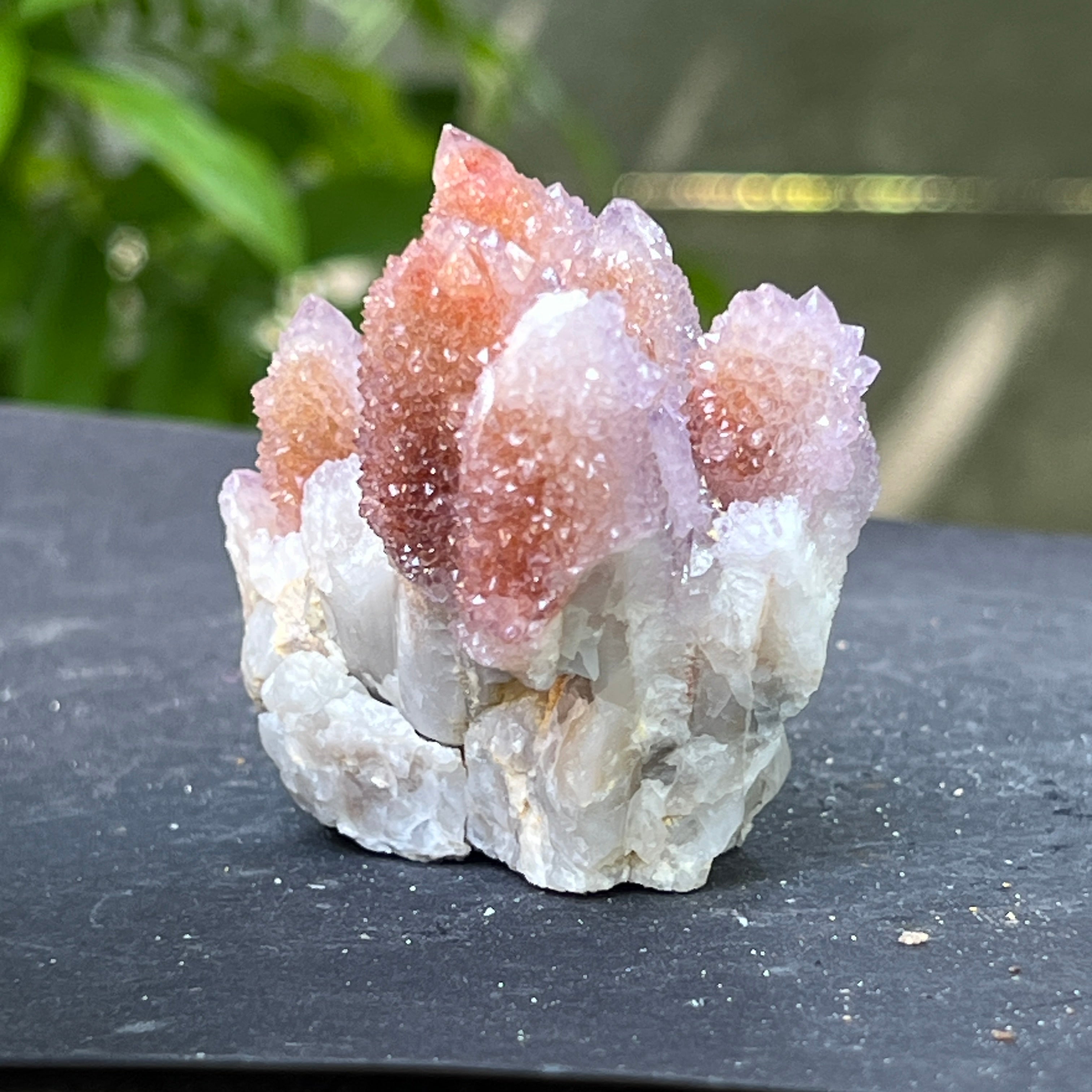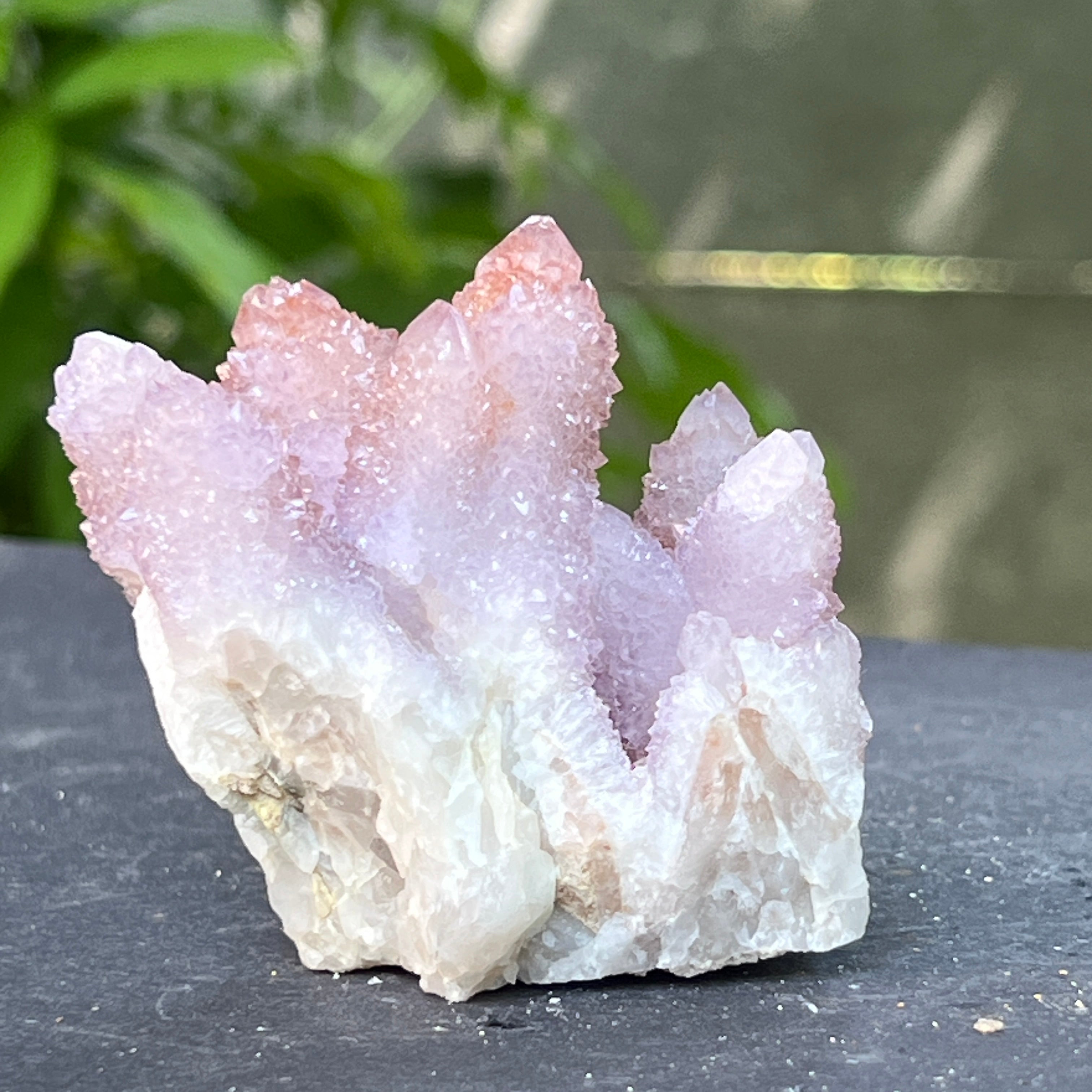 В дълбините на африканската земя, там където мълчанието на планините крие неизказани истории, се ражда кристал с необичайна красота: Аметистовият Spirit Quartz, известен и като „Кактусов кварц“. Това минерално чудо изглежда обвито в мистична аура – една солидна основа, покрита с хиляди деликатни върхове, като общност от кристали, обединени в танц на светлината.