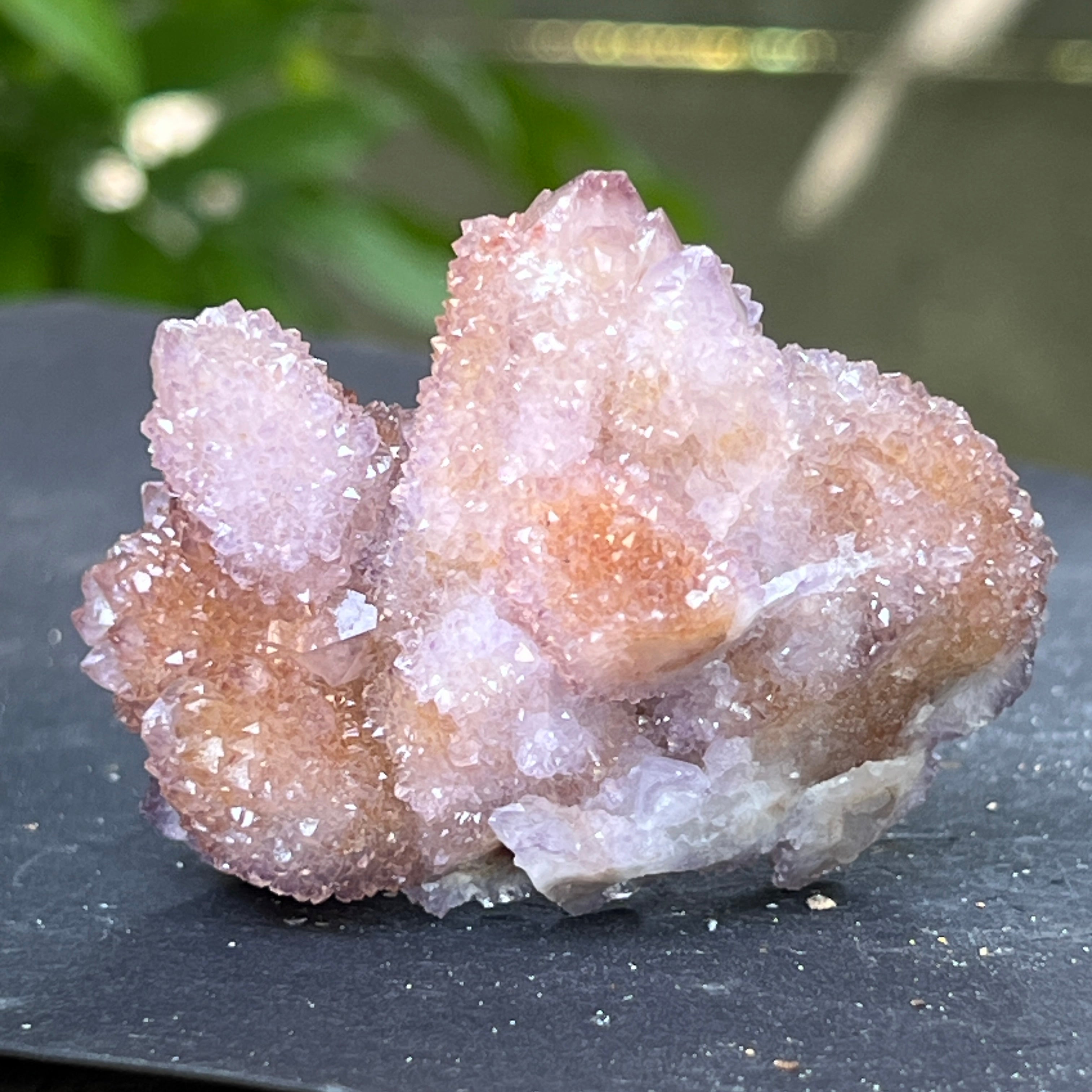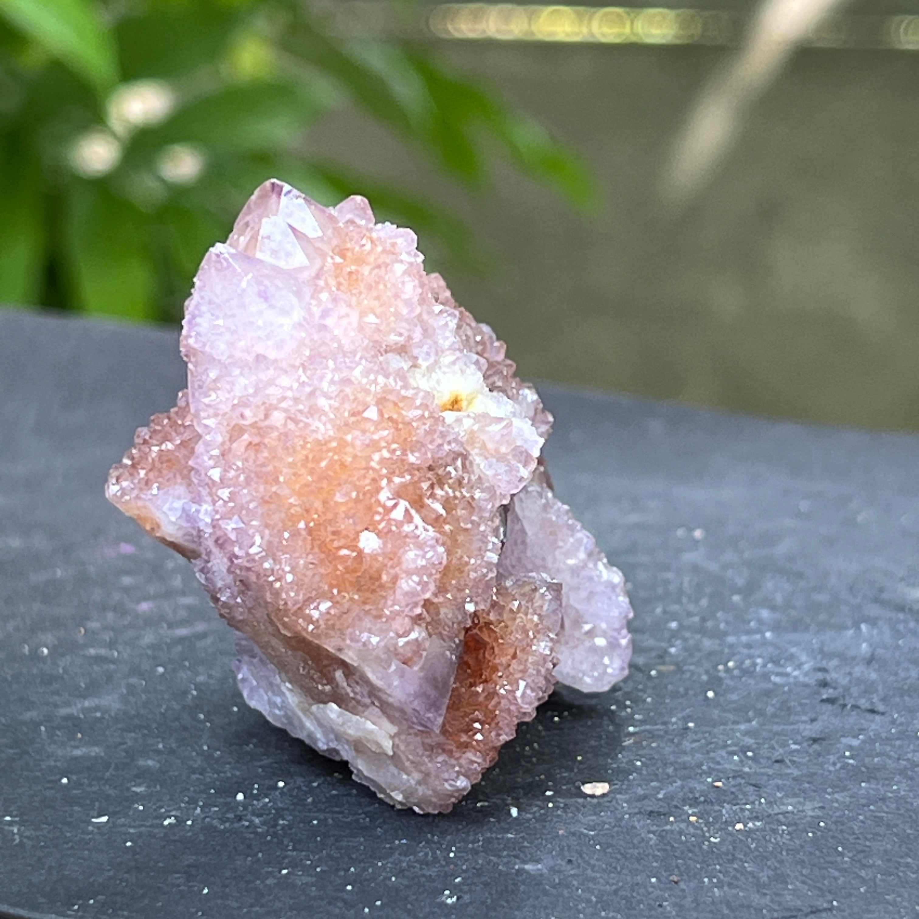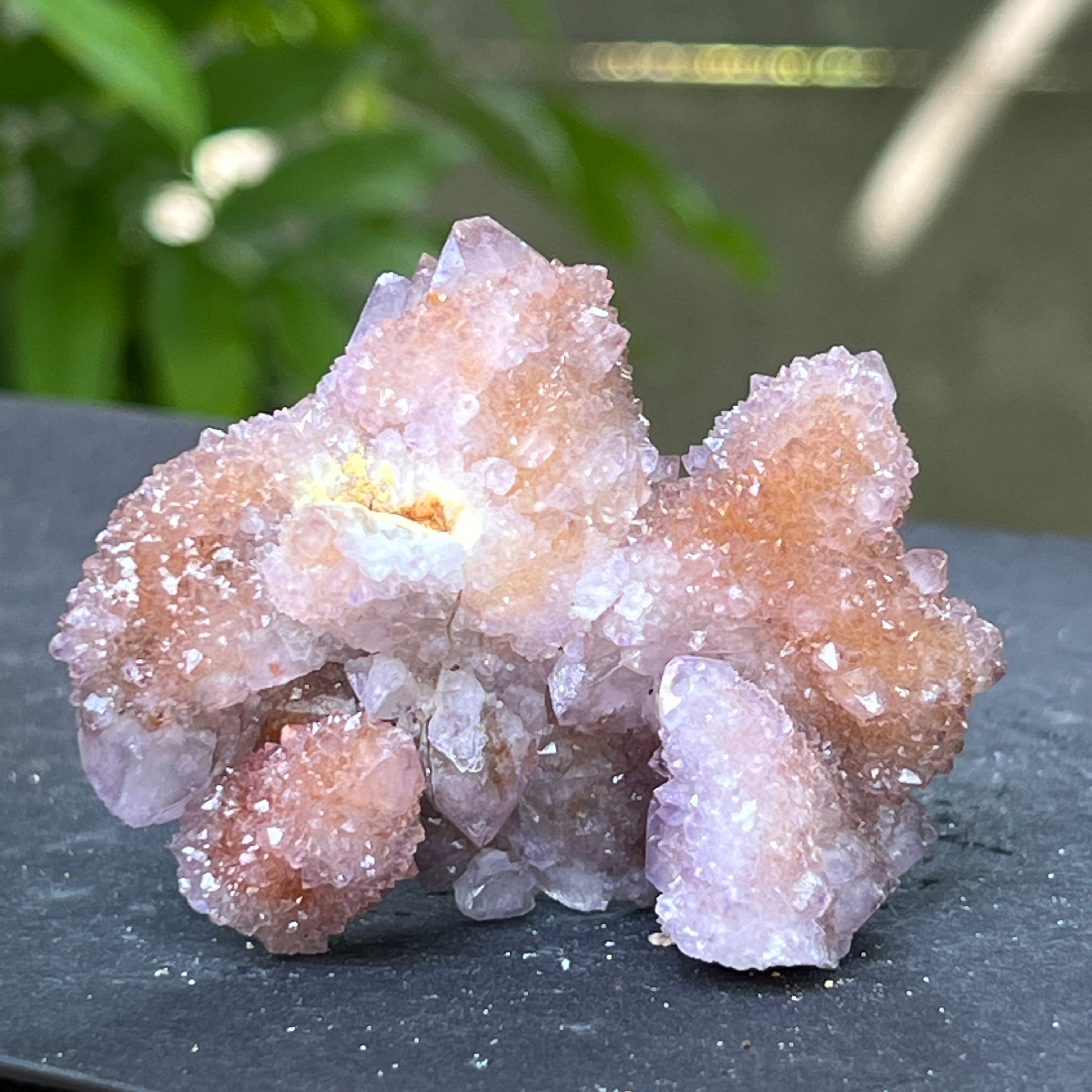 Произхождащ от Южна Африка, този уникален образец съчетава дълбоката енергия на кварца с висшите вибрации на аметиста. Това е камък на сътрудничеството и духовната общност, символ на хармонията между индивидуалността и единството. Всеки малък кристал излъчва от общия център, като мрежа от съзнания в съвършено равновесие.