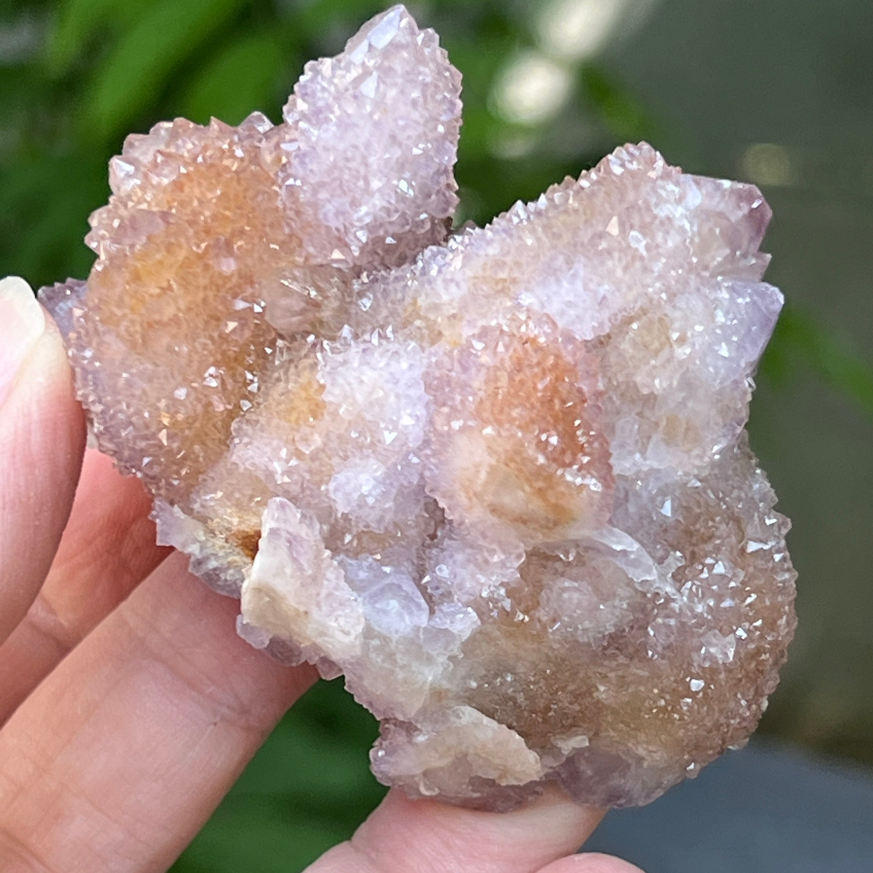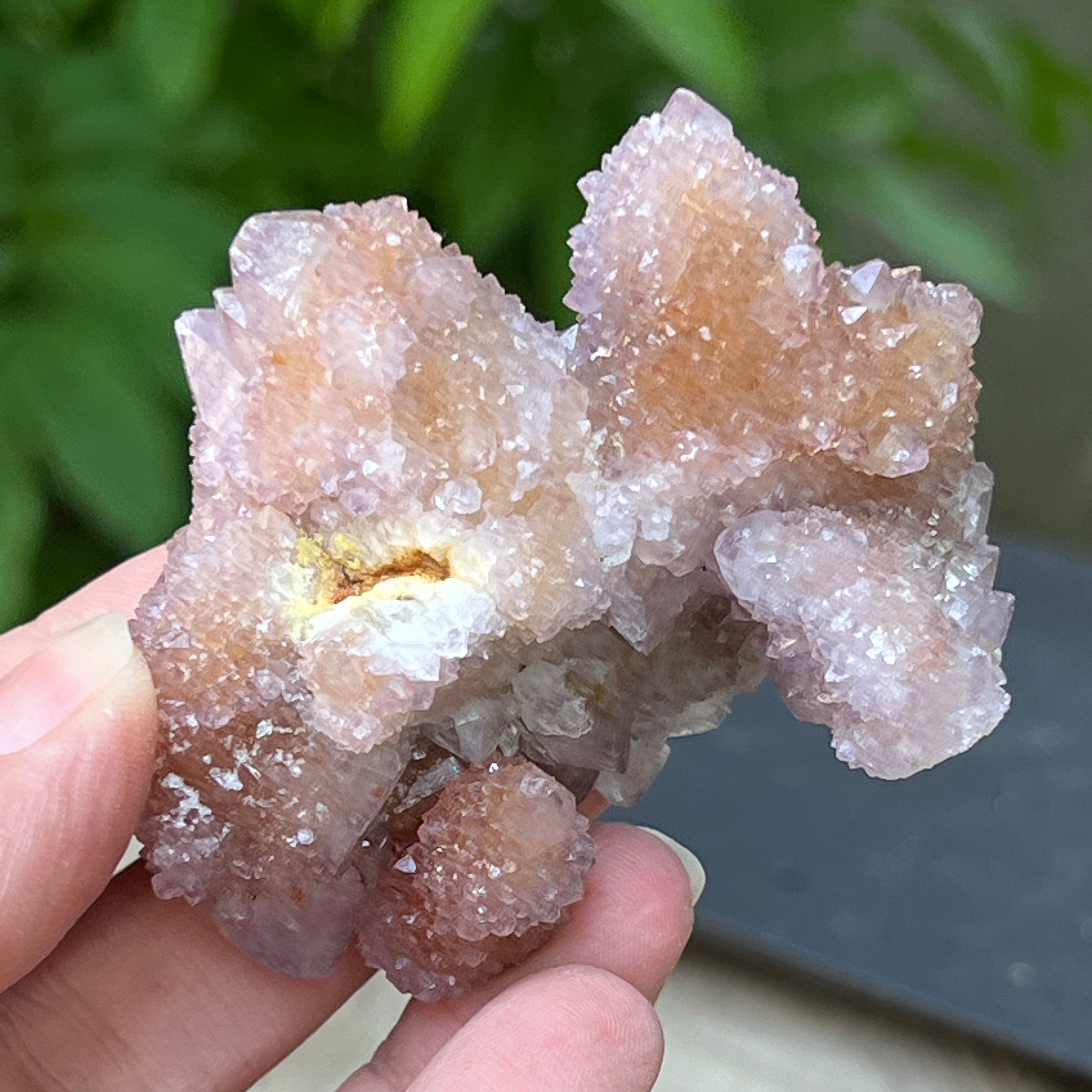 В дълбините на африканската земя, там където тишината на планините крие неразказани истории, се ражда кристал с необичайна красота: Духовният кварцов аметист, известен също като „Кактусов кварц“. Това минерално чудо изглежда обвито в мистична аура – една солидна основа, покрита с хиляди нежни върхове, като общност от кристали, обединени в танца на светлината.