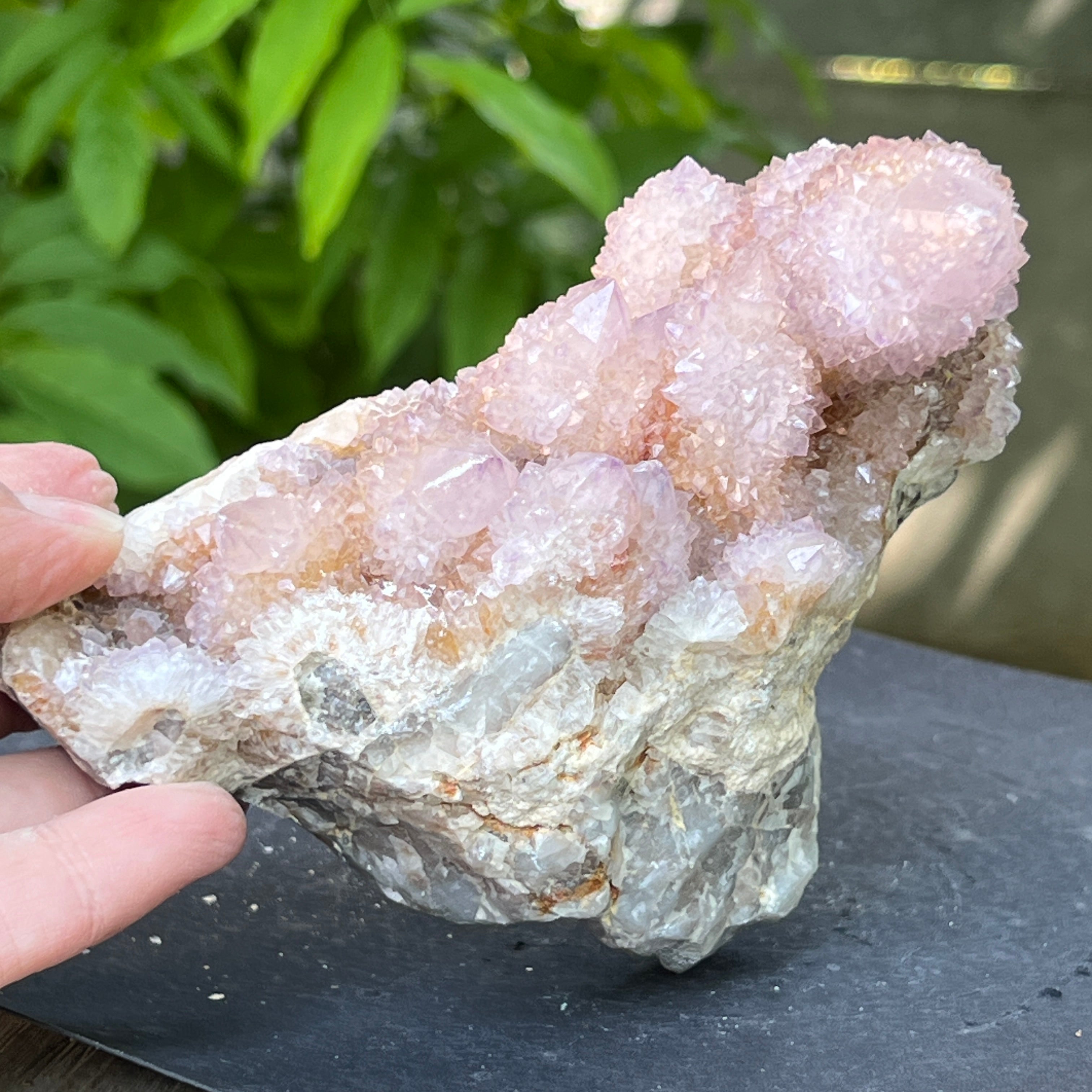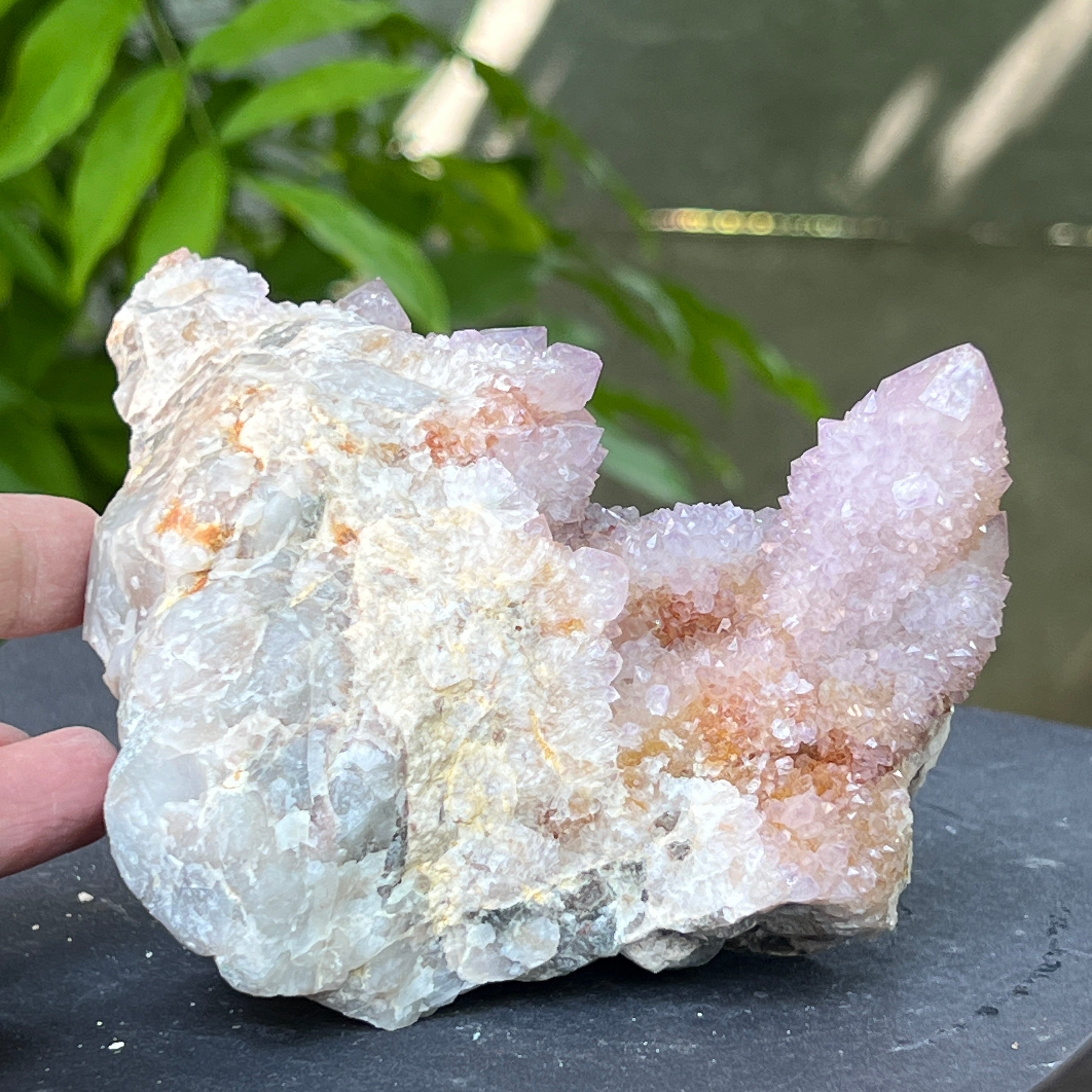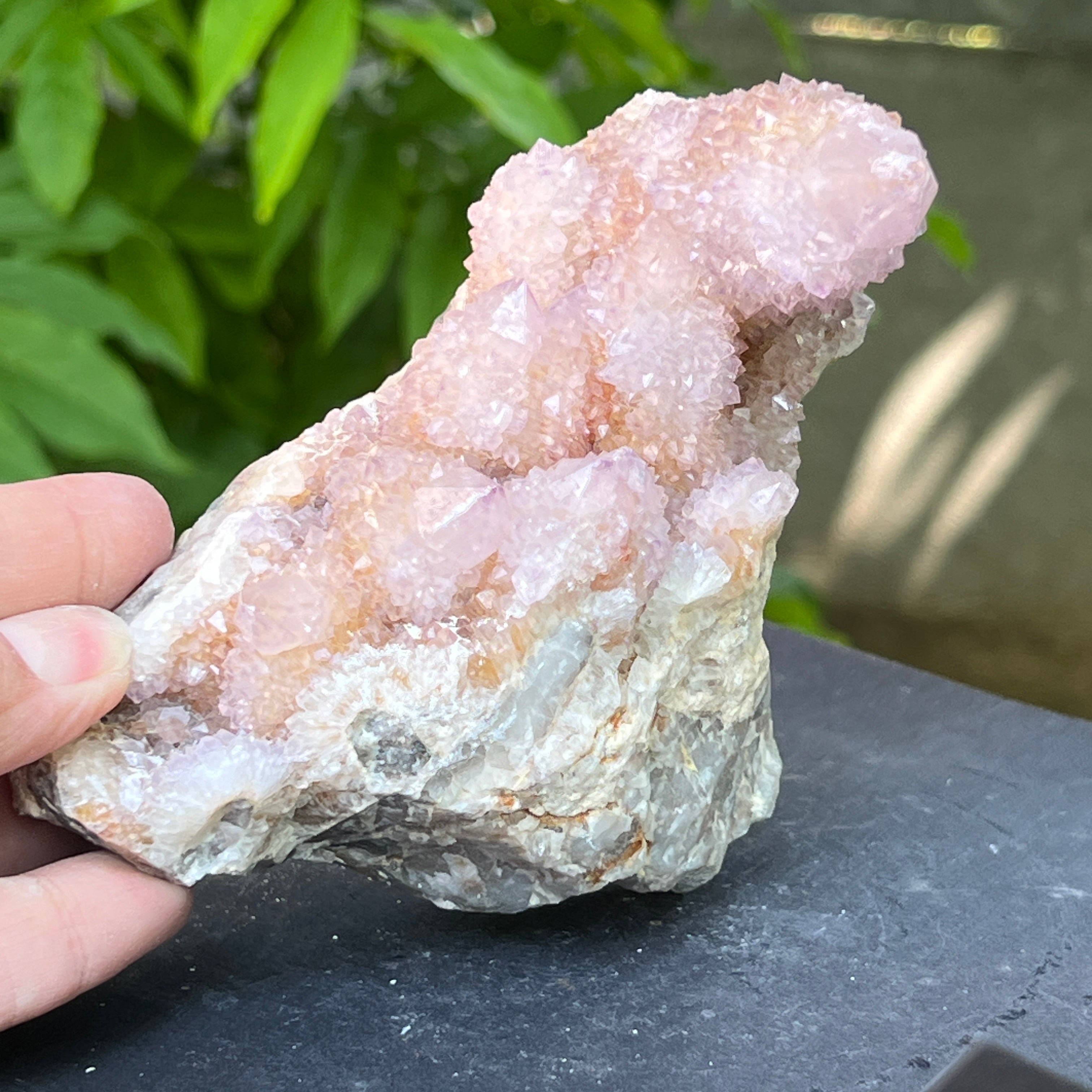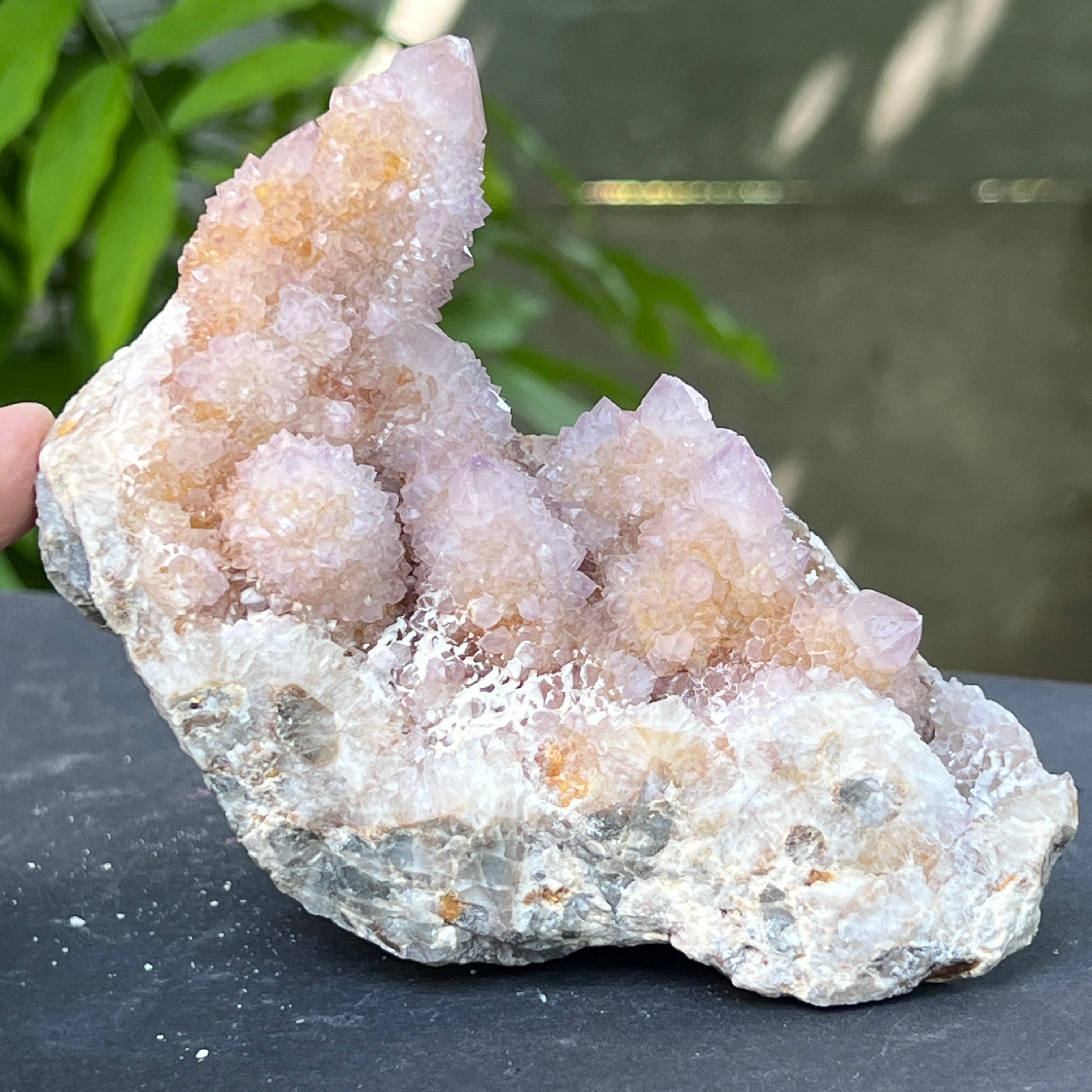 Произход от Южна Африка, този уникален образец съчетава дълбоката енергия на кварца с високите вибрации на аметиста. Това е камък на сътрудничеството и духовното общение, символ на хармонията между индивидуалността и единството. Всеки малък кристал излъчва от общ център, като мрежа от съзнания в перфектен баланс.