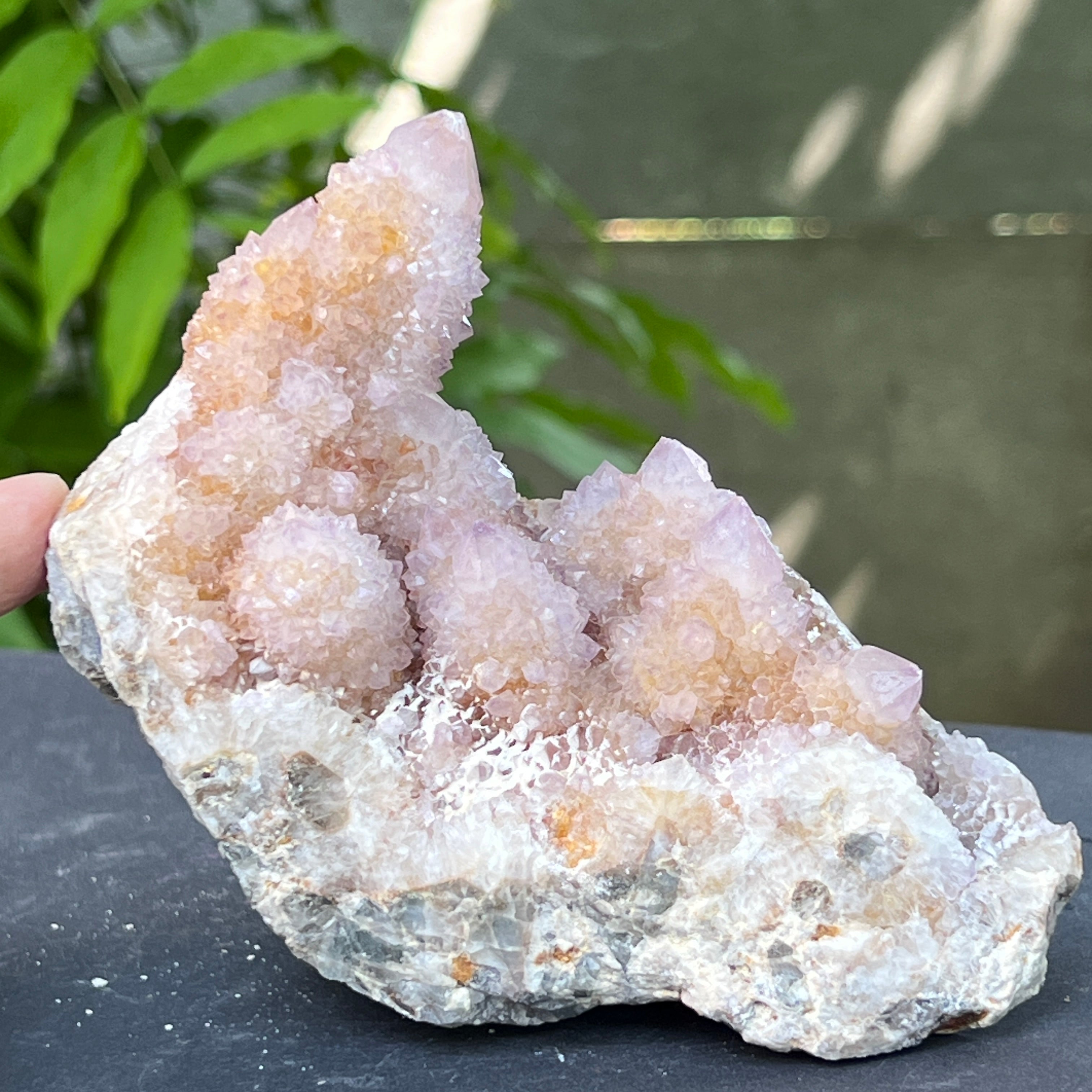 В дълбините на африканската земя, там където тишината на планините крие неразказани истории, се ражда кристал с необичайна красота: Духовният кварцов аметист, известен също като „Кактусов кварц“. Това минерално чудо изглежда обвито в мистична аура – една солидна основа, покрита с хиляди нежни върхове, като общност от кристали, обединени в танца на светлината.